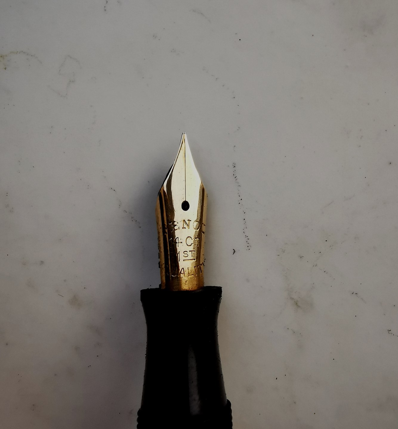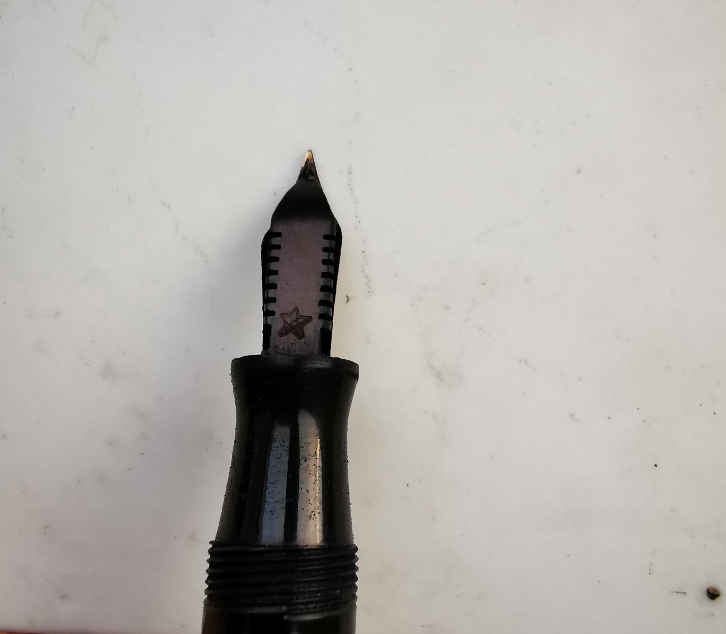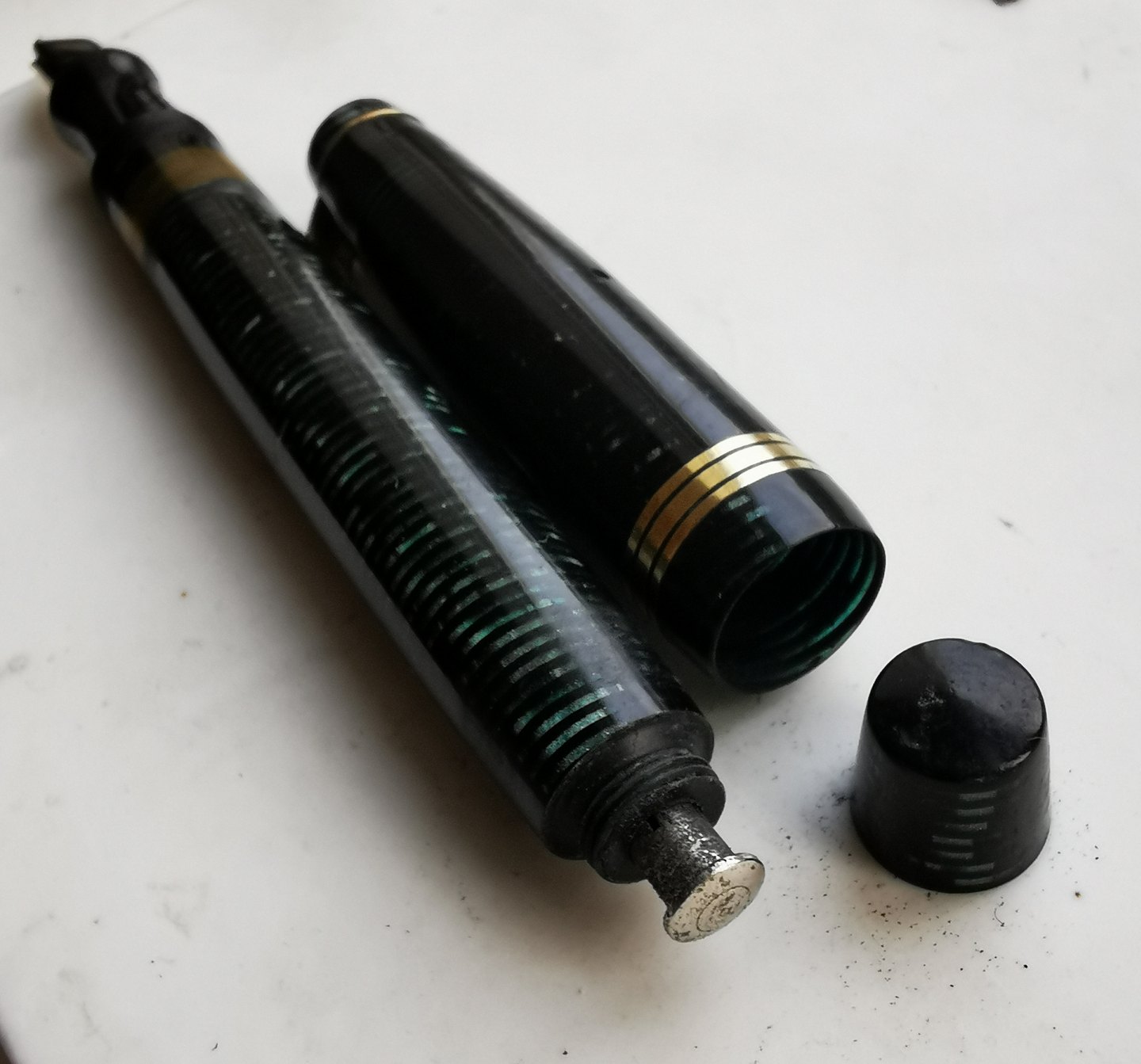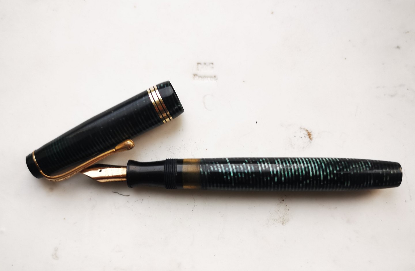 Penol no. 9 fyldepen fra 1940´erne. I god stand uden skader eller reparationer. Usædanligt mønster på denne fyldepen. Denne type marmoreretmed vandrette striber ses hyppigst på Parker Vacumatic fyldepennene fra samme periode. Tror Penol fabrikken er blevet inspireret herfra. Fungerer ikke før end der kommer ny gummisæk i. Dette kan tilkøbes for d.rk. 200,- Fyldepennen er 13 cm lang.