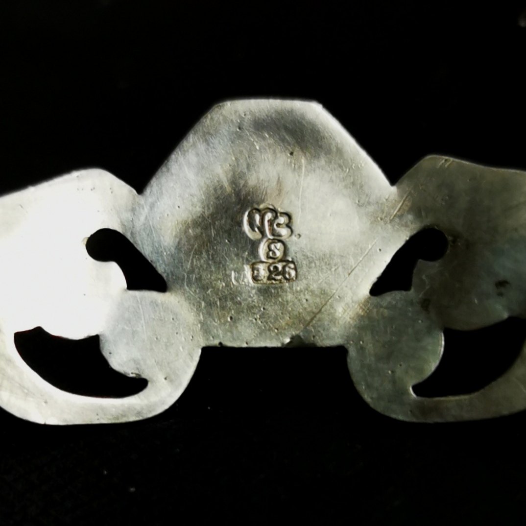 Lille sølv broche i skønvirkestil med blå sten samt mindre små røde og grønne fra Mogens Ballin´s værksted fra ca. 1900. Fremstår i god stand uden skader eller reparationer. Fabriksmærket på bagsiden. Mål: L. 5½ cm
