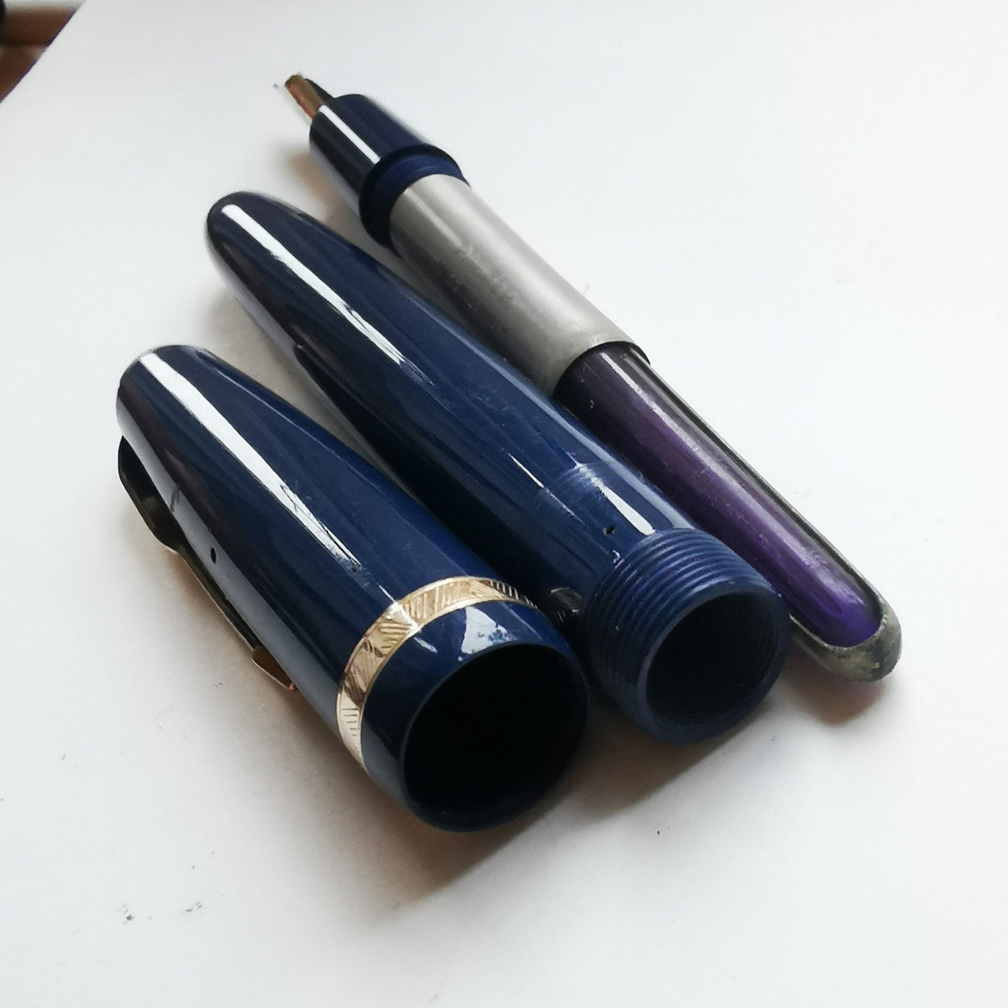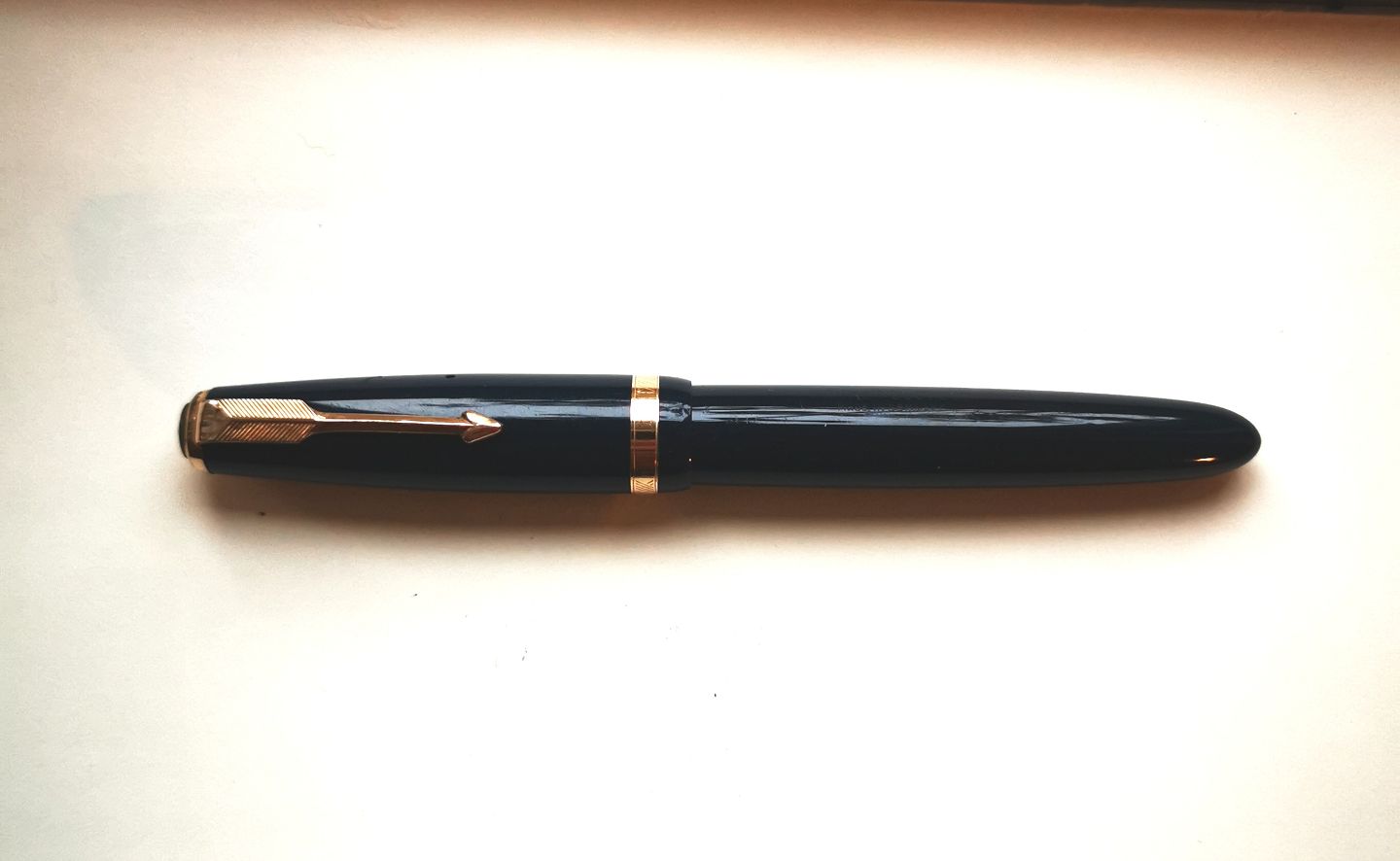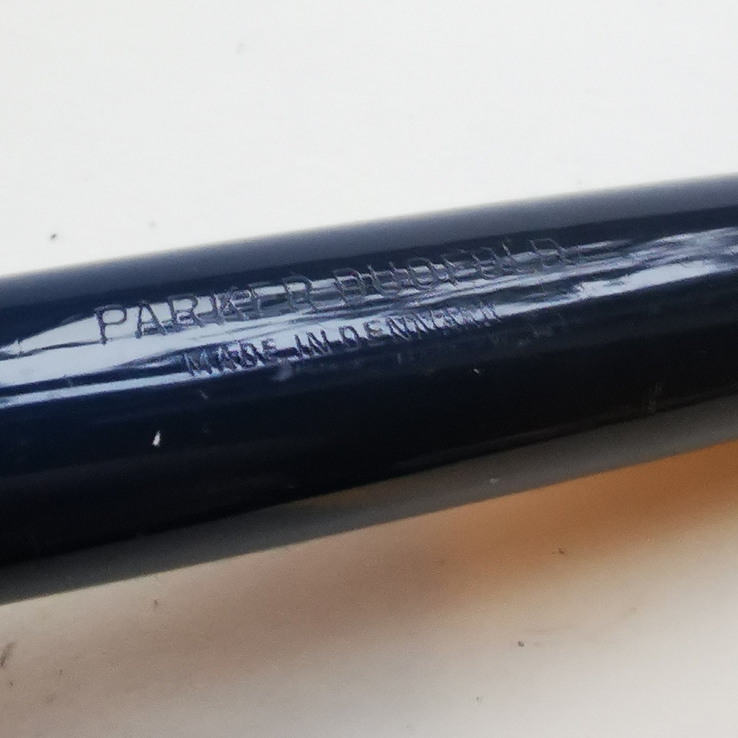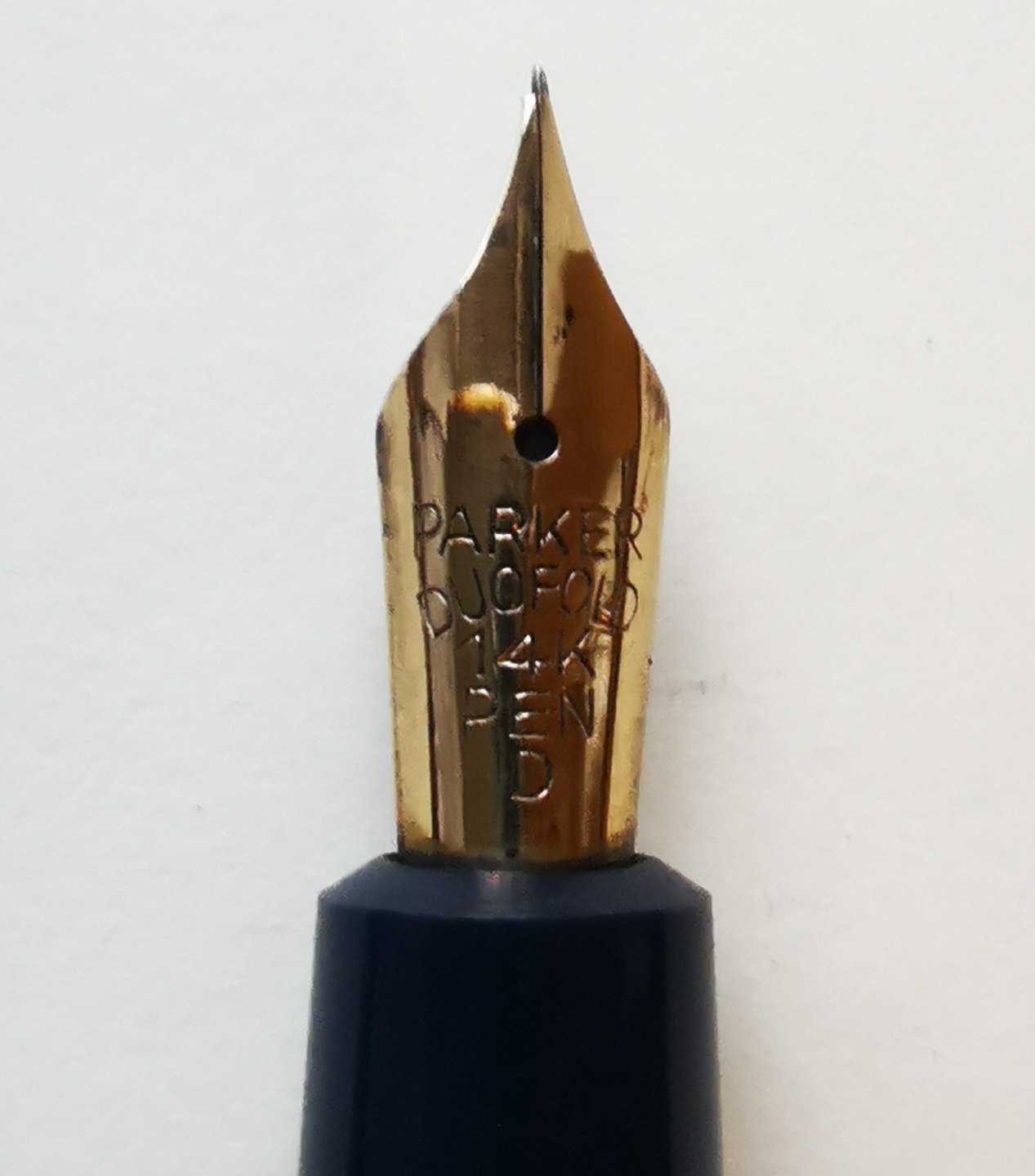 Blå Parker Duofold fyldepen. Fremstillet i Danmark. I perfekt stand. Ingen skader eller reparationer. Tekst på fyldepennen: PARKER DUOFOLD MADE IN DENMARK. Alle dele originale Parker. Inclusive en 14 karat Parker guldspids. Klar til at blive brugt med gammel gummisæk. L. 13 cm (5.11 tommer).