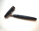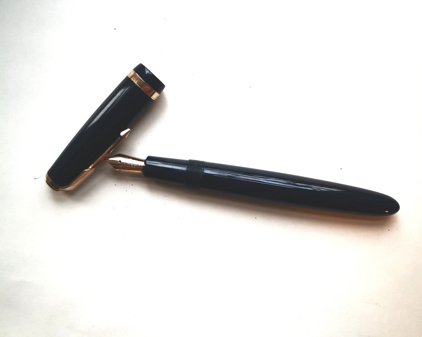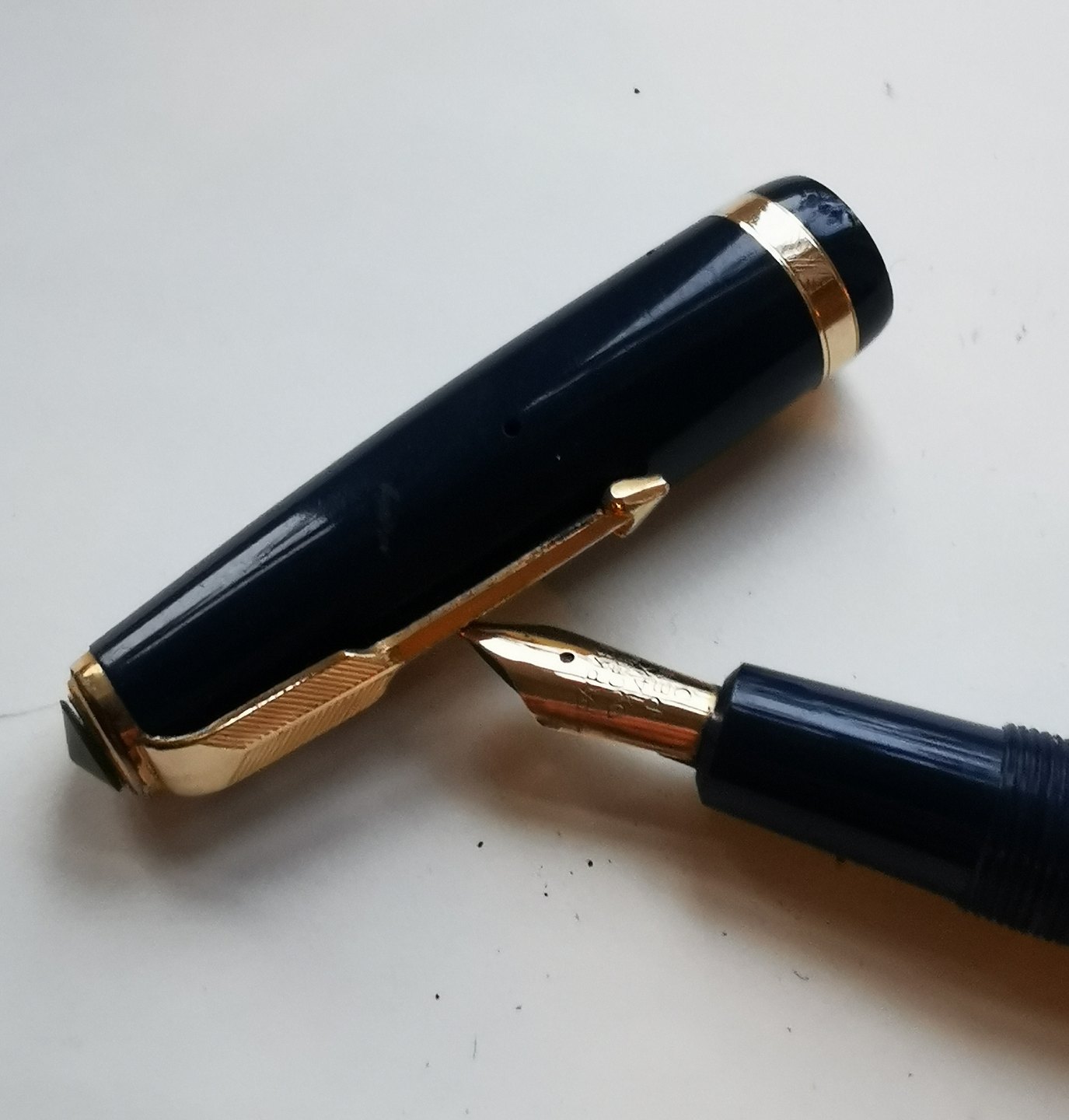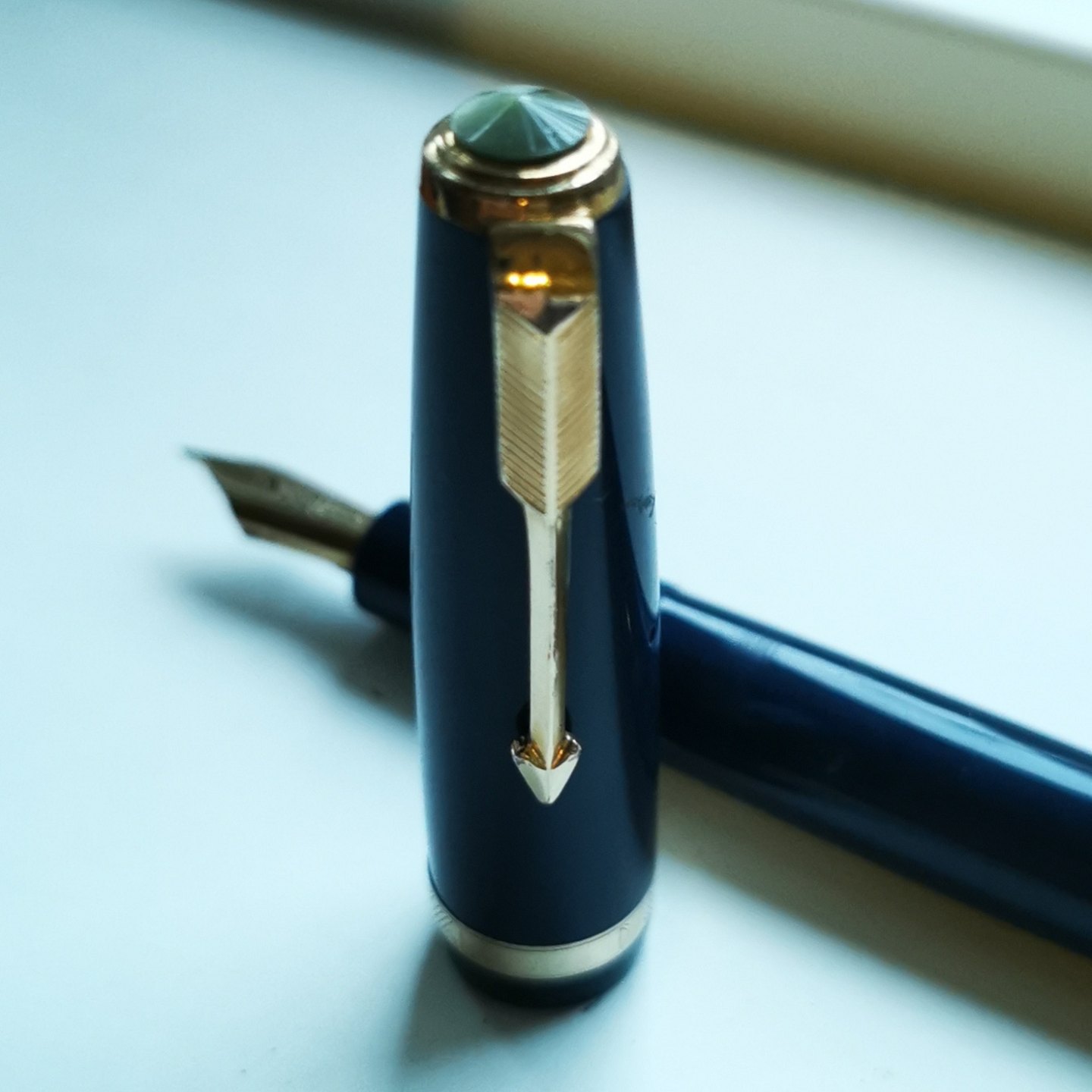 Blå Parker Duofold fyldepen. Fremstillet i Danmark. I perfekt stand. Ingen skader eller reparationer. Tekst på fyldepennen: PARKER DUOFOLD MADE IN DENMARK. Alle dele originale Parker. Inclusive en 14 karat Parker guldspids. Klar til at blive brugt med gammel gummisæk. L. 13 cm (5.11 tommer).
