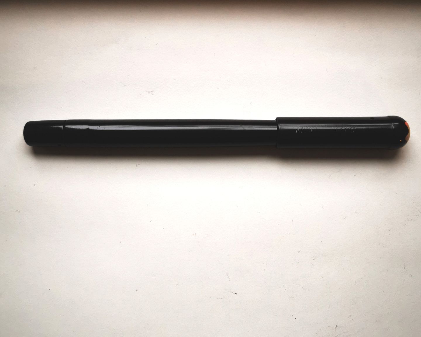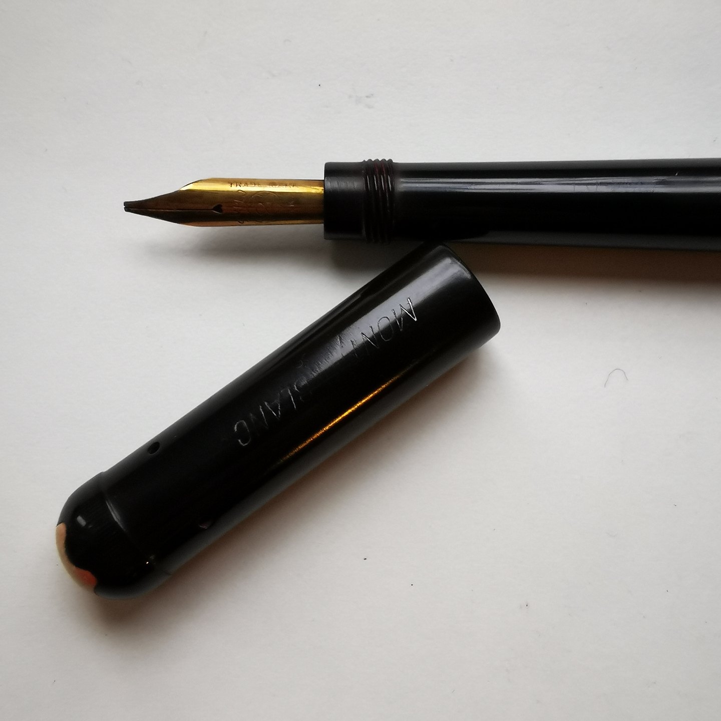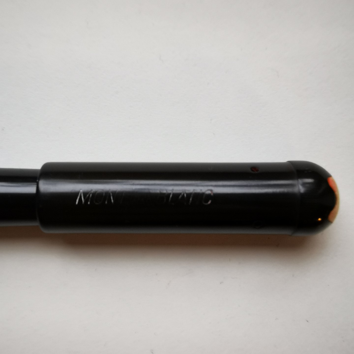 Sort Montblanc Simplo nr.. 2 safety pen. Stor hvid stjerne er indsat på toppen af hætten. Fremstillet i Tyskland omkring 1920. Hætten er formodentligt forkortet efter at have haft en skade. Ellers er den i god og dunktionsduelig stand. Når bundskruen aktiveres (drejes) kommer spidsen frem. På denne bundskrue står der nr. 2 samt. BB. På hætten ses fabriksmærket Montblanc. På kroppen ses få rester af fabriksteksten. L. 14 cm