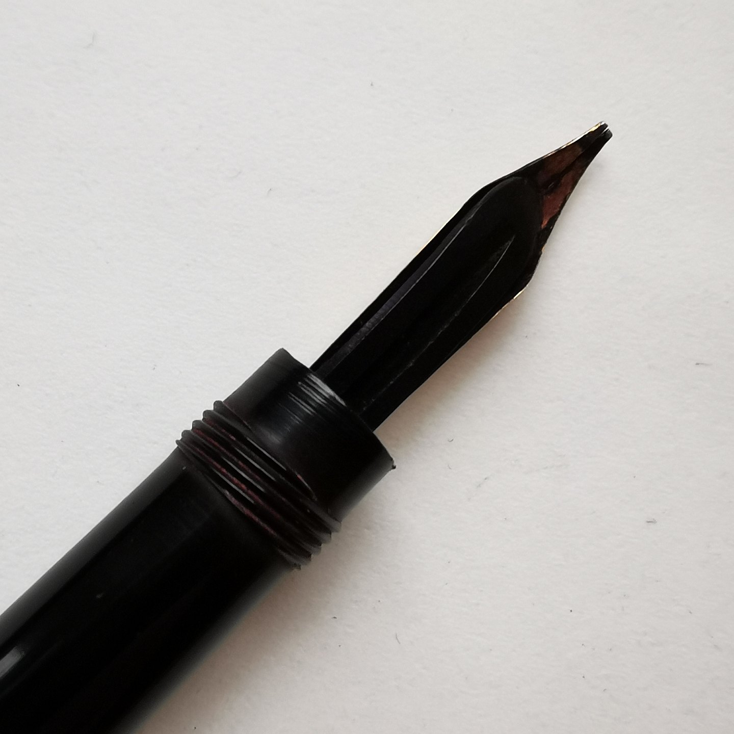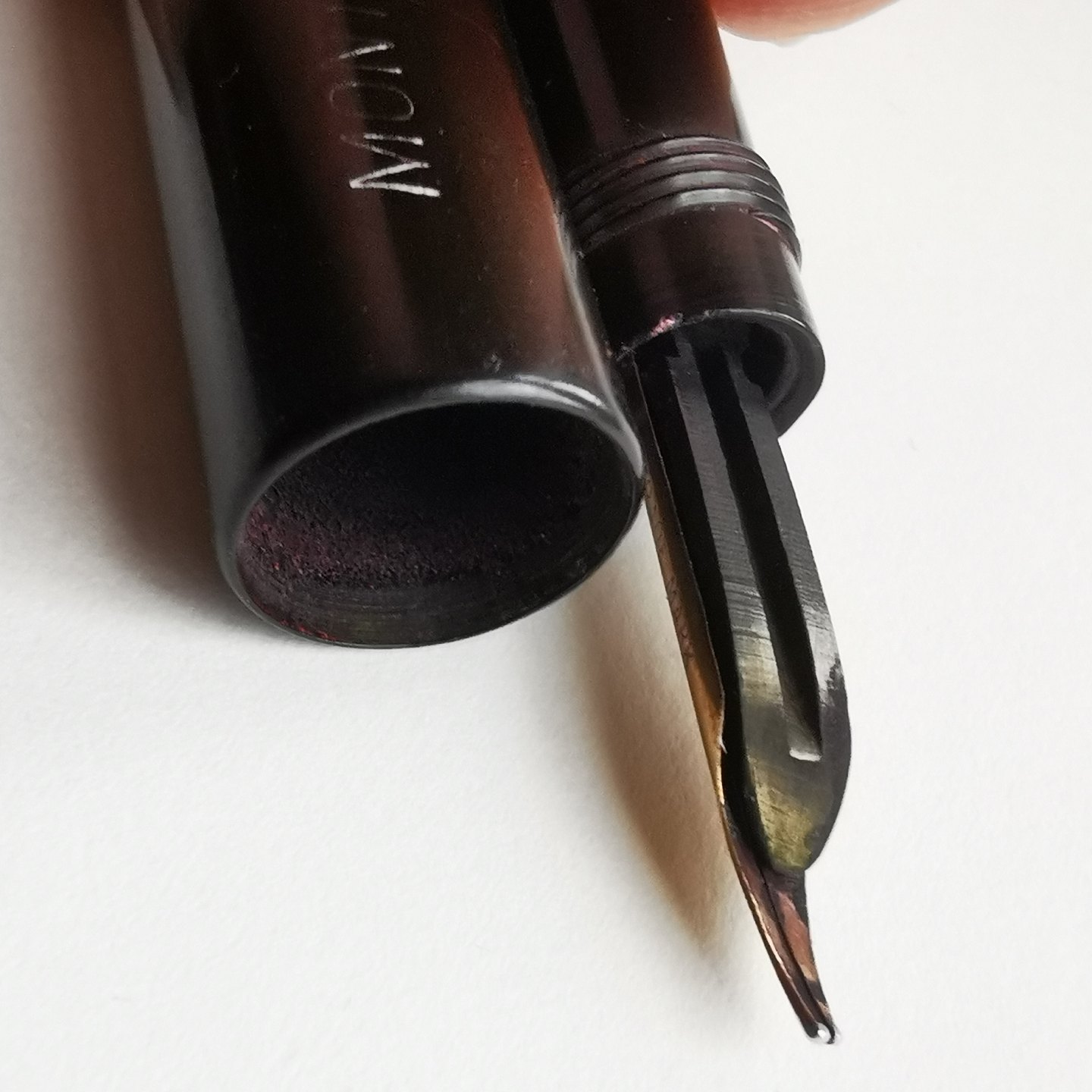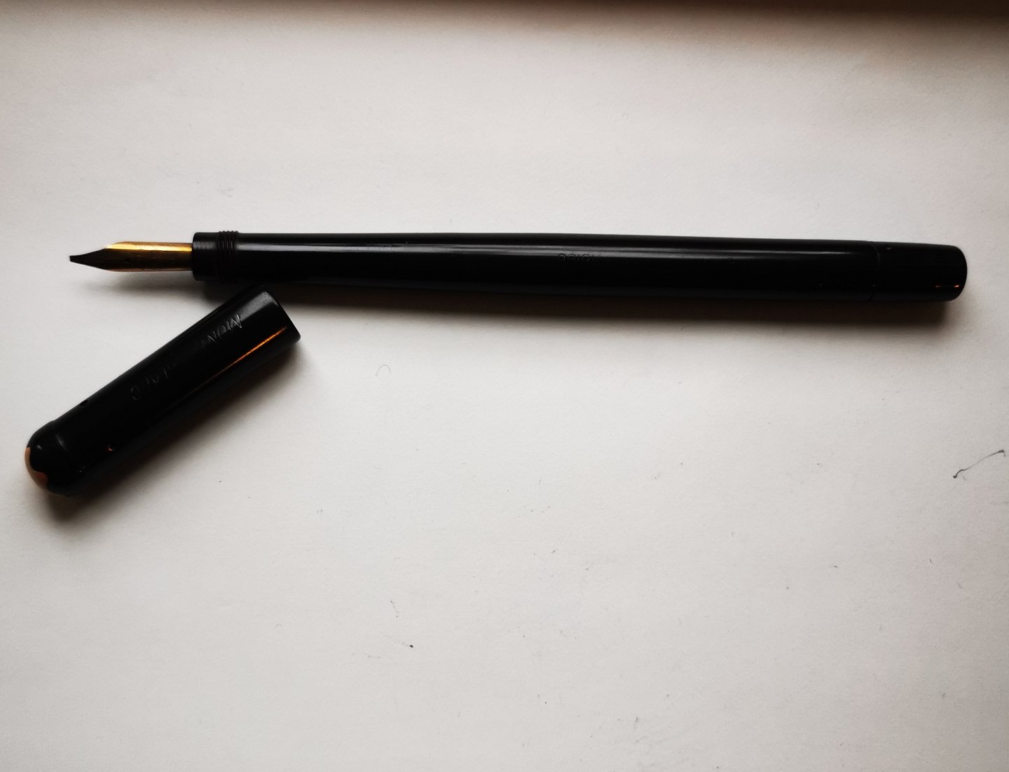 Sort Montblanc Simplo nr.. 2 safety pen. Stor hvid stjerne er indsat på toppen af hætten. Fremstillet i Tyskland omkring 1920. Hætten er formodentligt forkortet efter at have haft en skade. Ellers er den i god og dunktionsduelig stand. Når bundskruen aktiveres (drejes) kommer spidsen frem. På denne bundskrue står der nr. 2 samt. BB. På hætten ses fabriksmærket Montblanc. På kroppen ses få rester af fabriksteksten. L. 14 cm