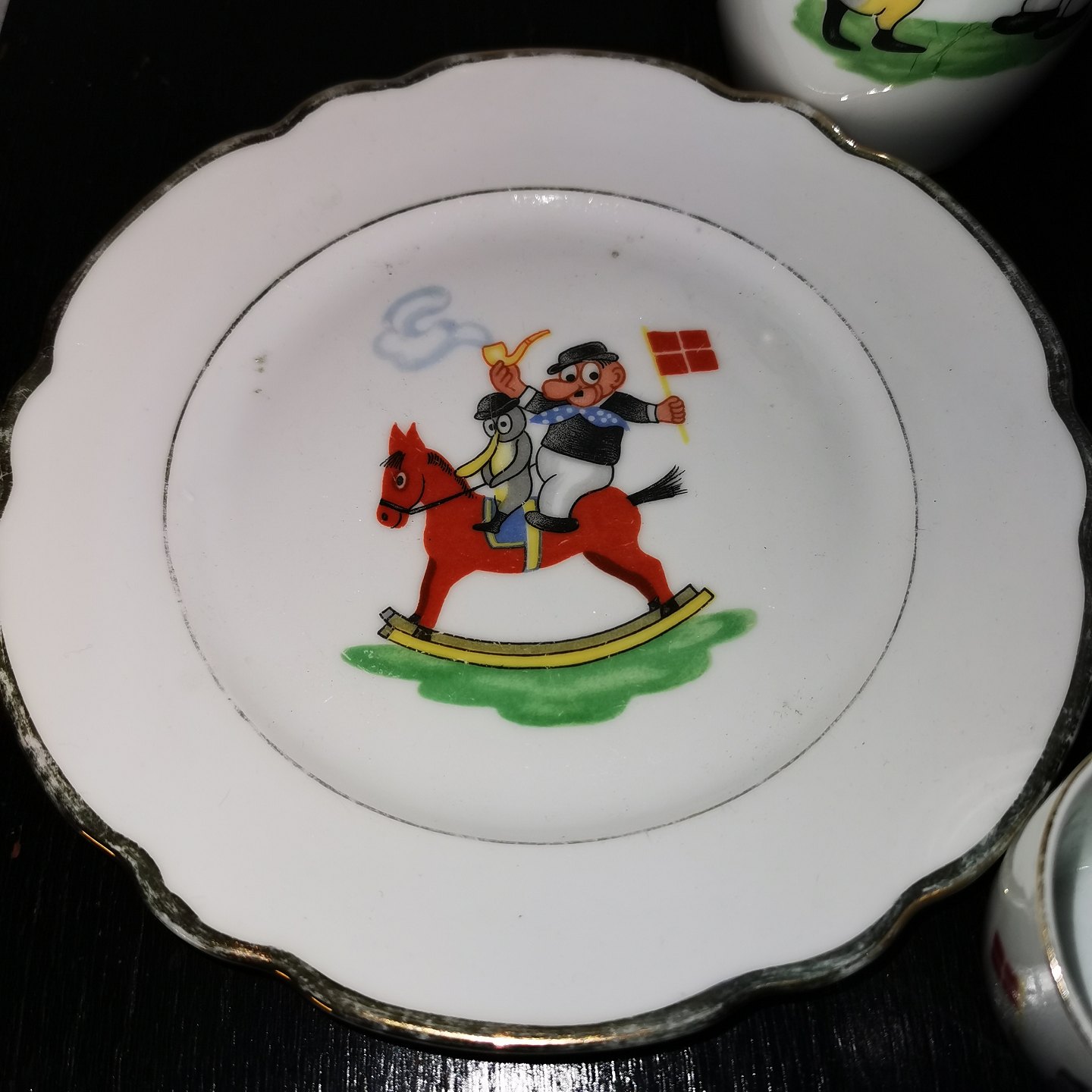 Kaffekande, tallerken, fire kopper og tre underkopper i porcelæn med tegnet motiv af Peter & Ping af Storm P. Alle dele i god stand. Kaffekande sælges alene for kr. 400,- Tallerkenen for kr. 200,- Alle kopper og underkopper sælges for samlet kr. 300,- Alle dele sælges samlet for kr. 600,-