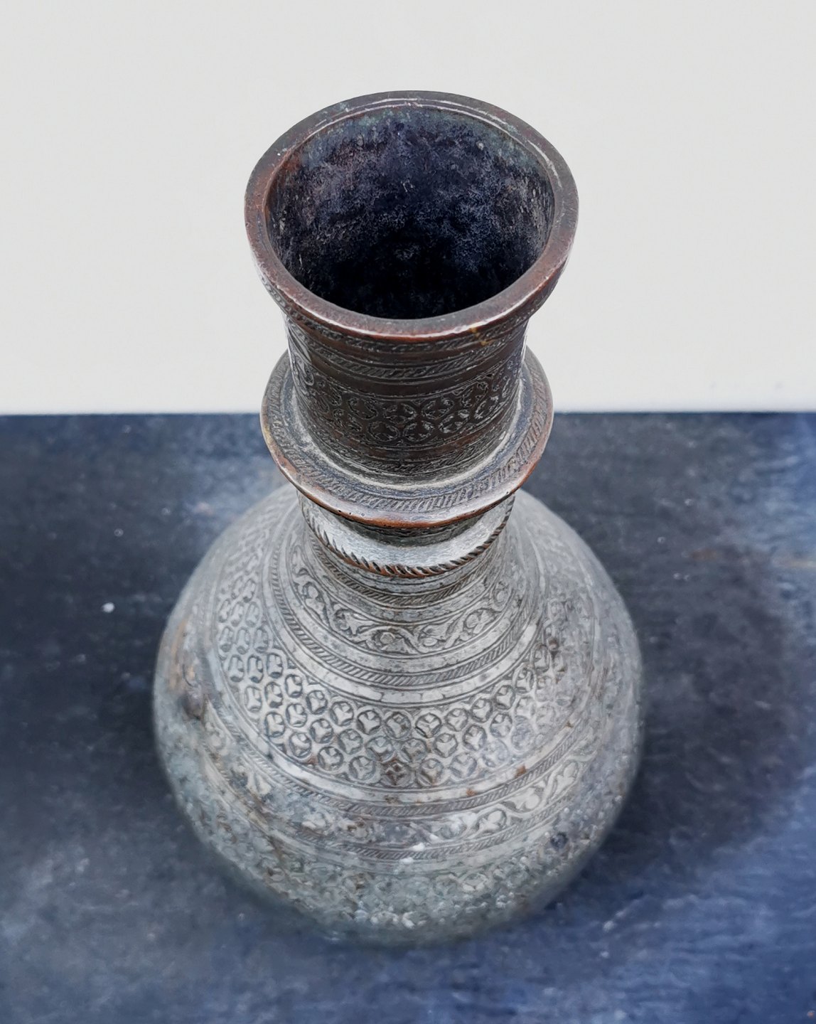 DECORATIVE ANTIQUE ITEM: Afgan kookah. Richly decorated bottle-shaped carafe or vase in copper with a tinned surface. Produced around 1900 presumably in the Middle East in Afganistan. Normal wear of use and without damage or repairs. H. 29 cm