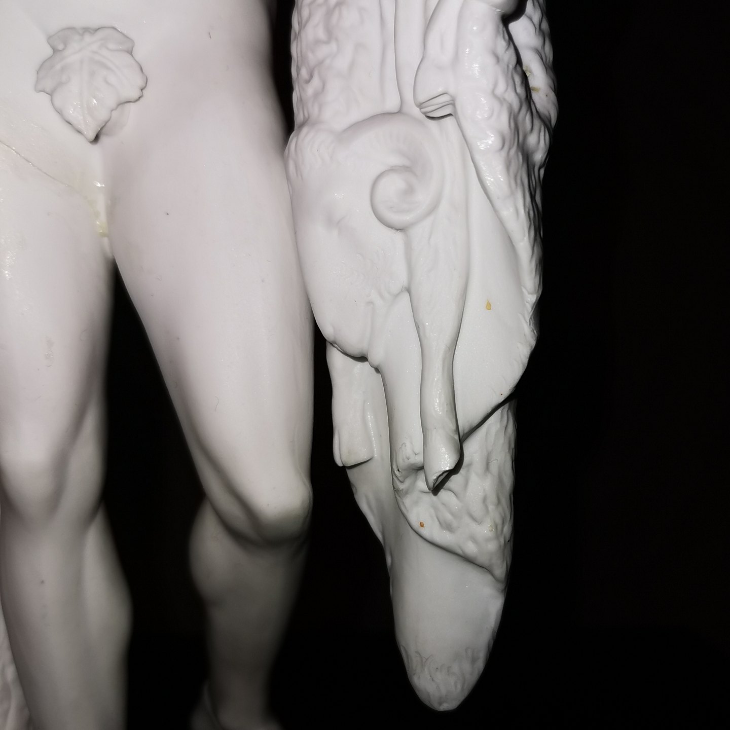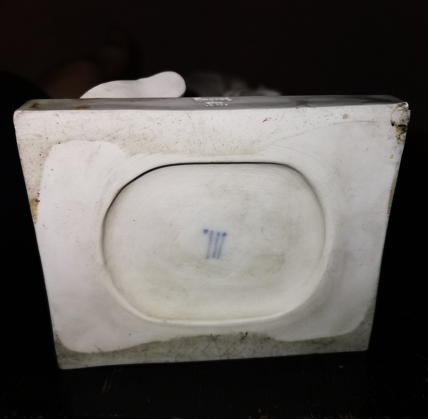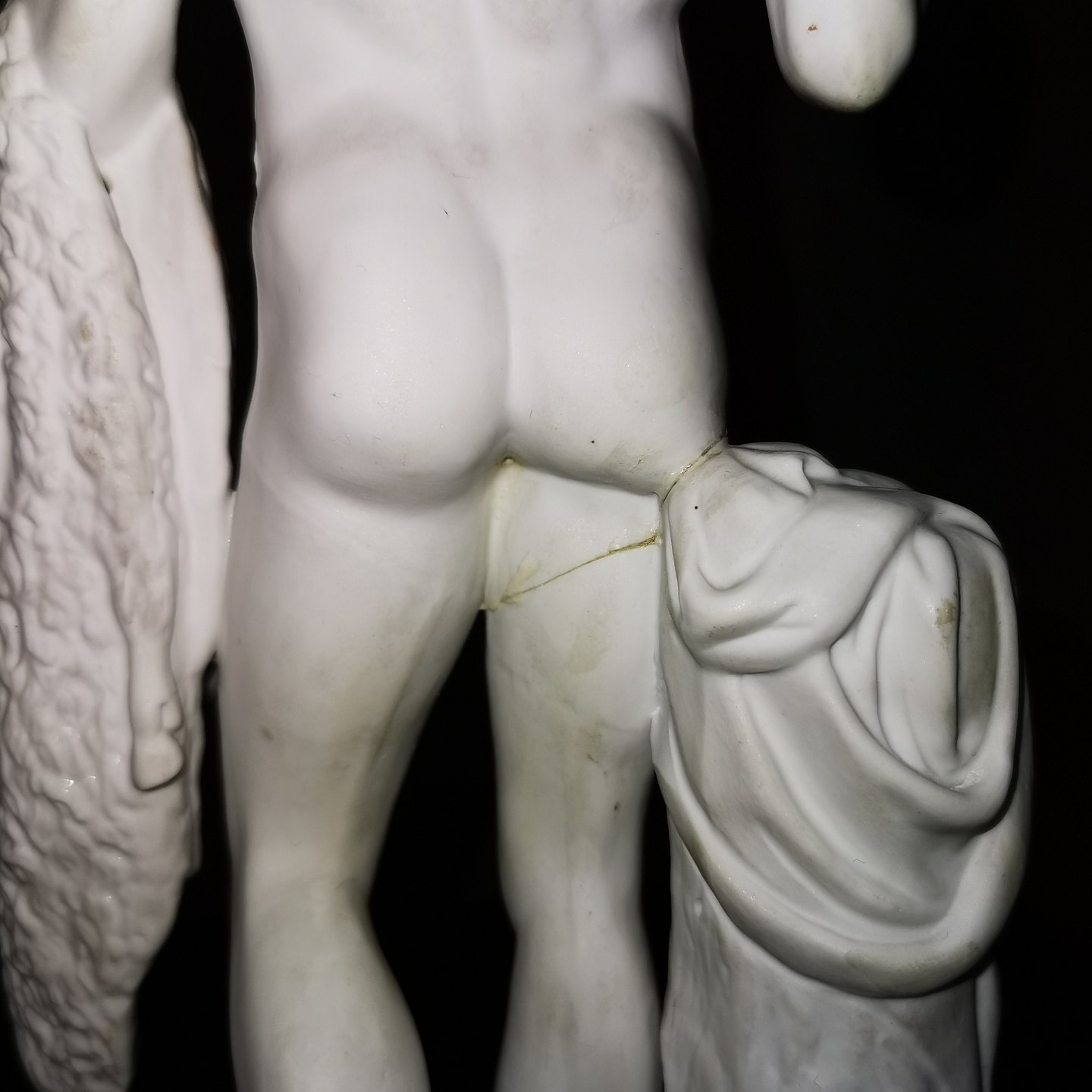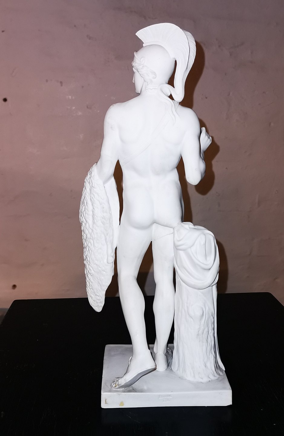 Denne mindre reproduktion er fremstillet på fabrikken i slutningen af 19. århundrede. Fremstår med skader hvilket fremgår af fotografierne. Bl.a. ses en skade på højre lår ! Fabriksmærket med fabrikkens velkendte tre blå bølger på undersiden. Mål: 33½ cm (13.18 tommer)