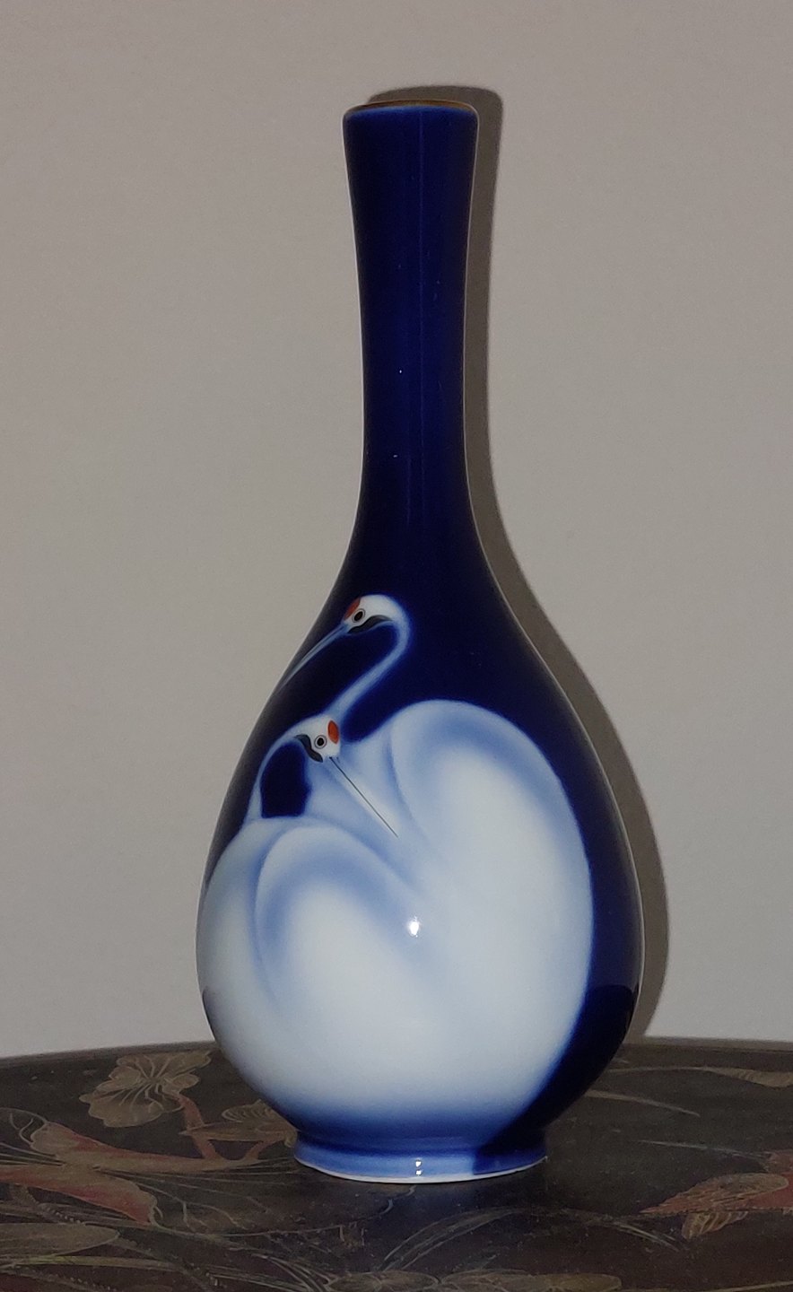 Old japanese art nouveau Fukagawa porcelain vase with decoration of cranes. In good condition. No damages or repairs. Factory marked on the bottom. Measures: 22½ cm high (8.85 inches).
