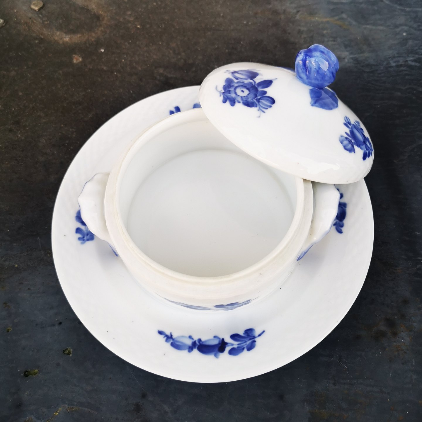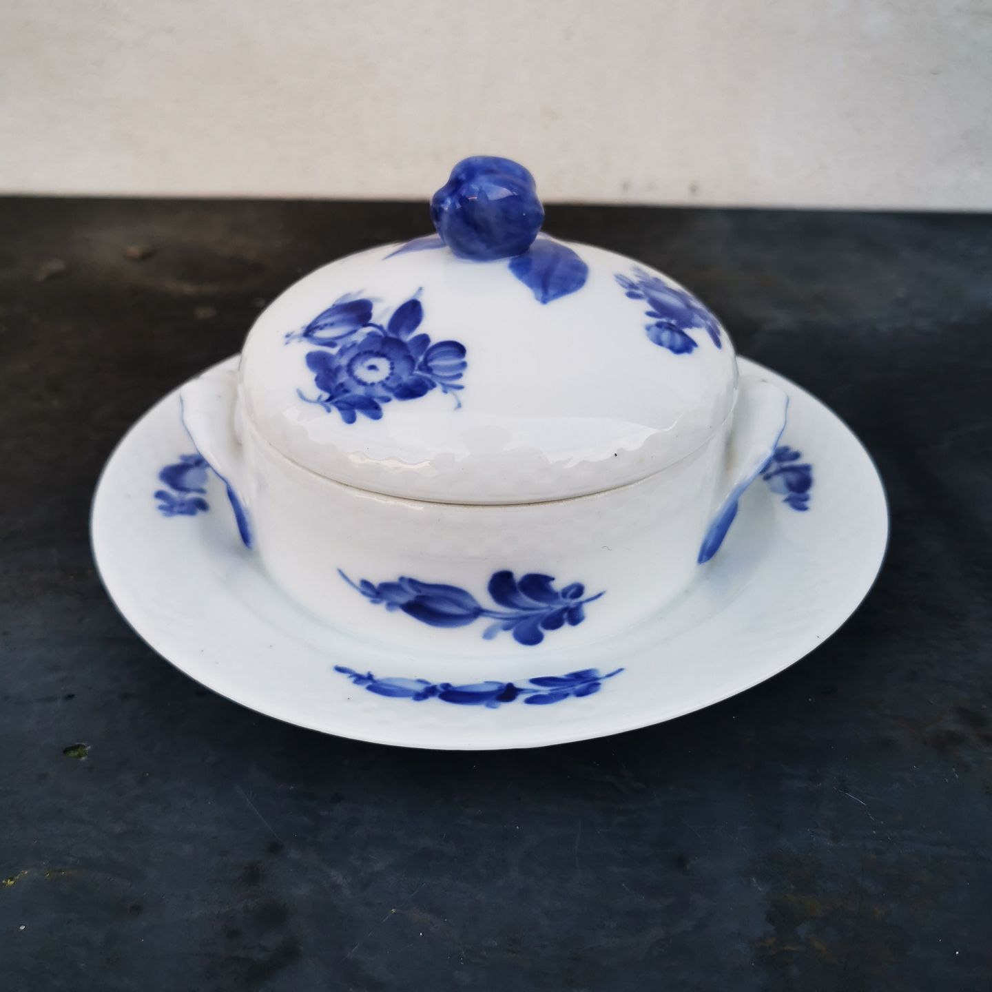 Blå Blomst smørskål i porcelæn fra Royal Copenhagen. I god stand. Ingen skader eller reparationer. 1. Sortering. Fabriksmærket på bunden. Modelnummer 10/ 8076.