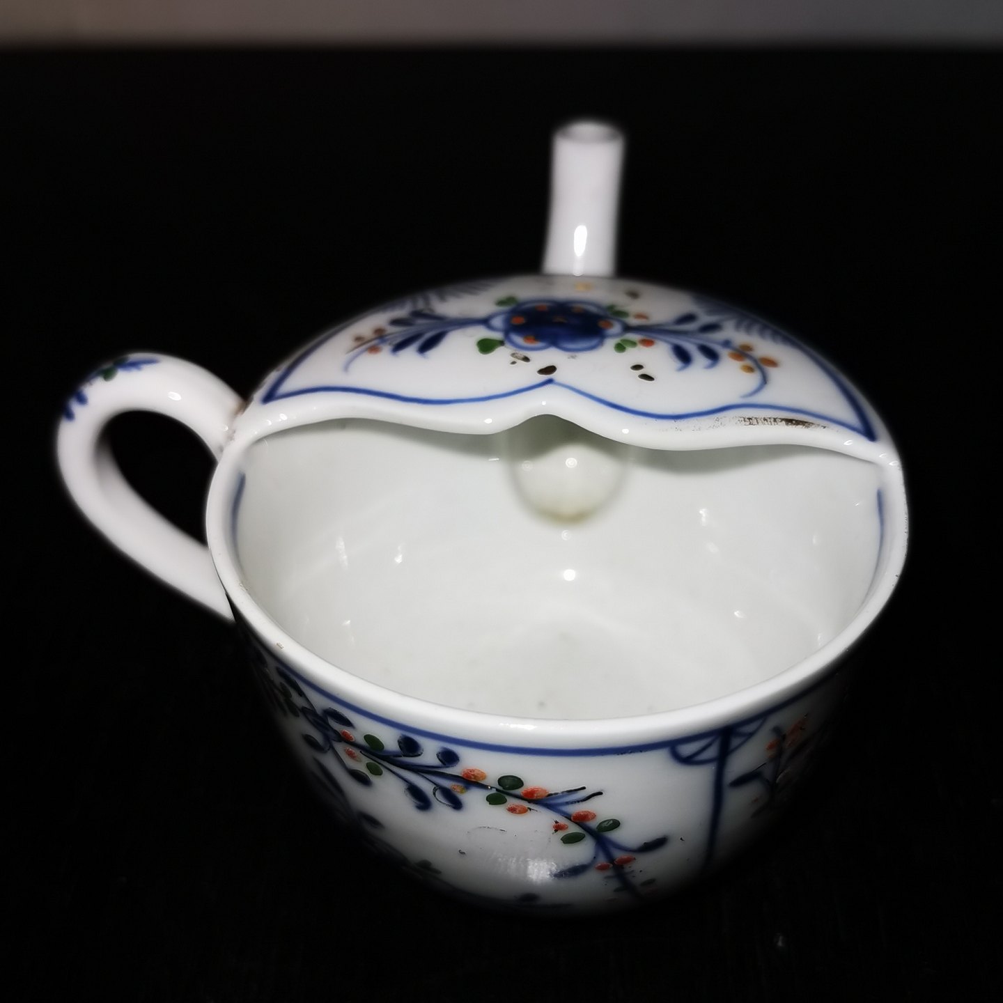 Kande i musselmalet porcelæn. Til hjælp når sengeliggende svagelig person skal indtage væske. Mere jævne udgaver er brugt på hospitaler og plejehjem. Denne flotte musselmalede udgave er sikkert anvendt i privat hjem. Fremstillet i begyndelsen af 20. århundrede. I perfekt stand. Hvem der har lavet den vides ikke, men kvaliteten af dekorationen er meget fin. H. 6½ cm.