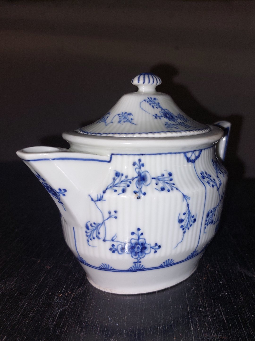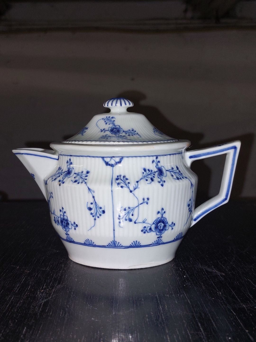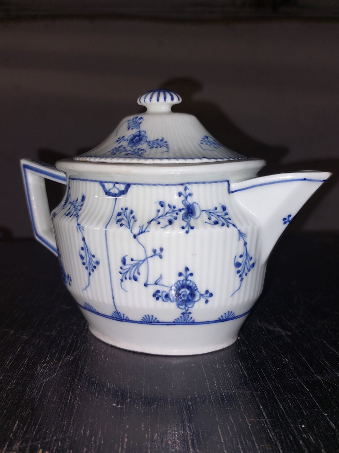 Tepotte I porcelæn fra Royal Copenhagen, Den Kongelige Porcelænsfabrik, fremstillet i første halvdel af 19. Århundrede. Skår indvendigt (se fotos). Småskrammer på bundens kant (se foto). Fabriksmærket på undersiden af hanken. Mål: H. 12,5 cm L. 17,5 cm B. 8,5 cm