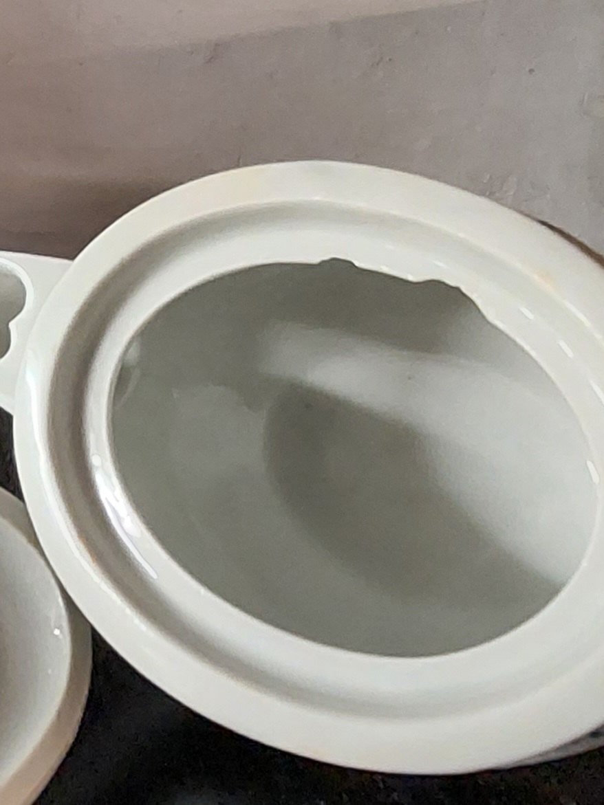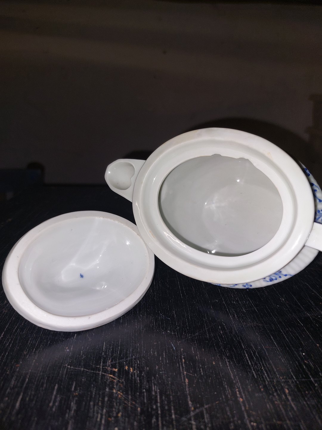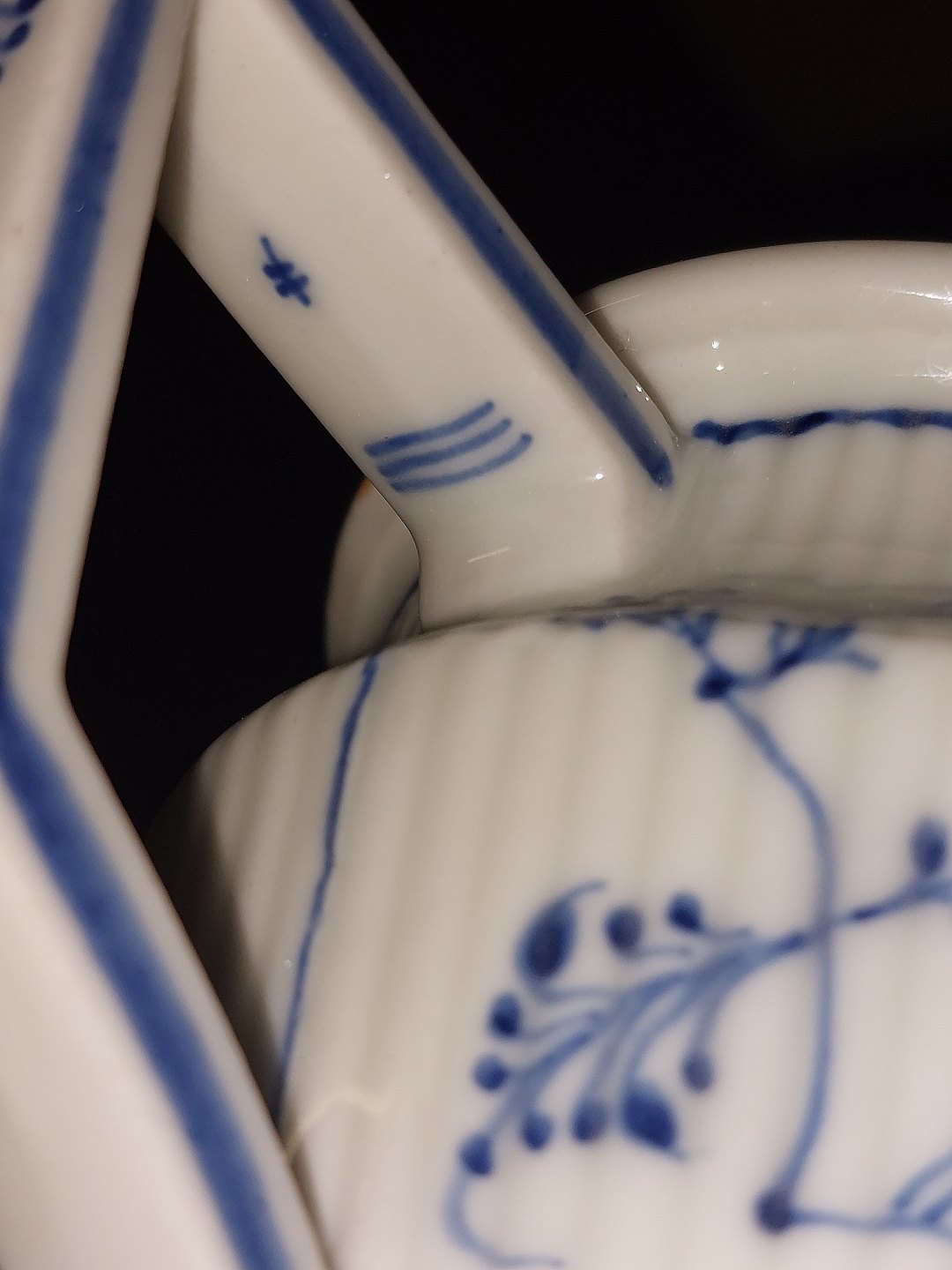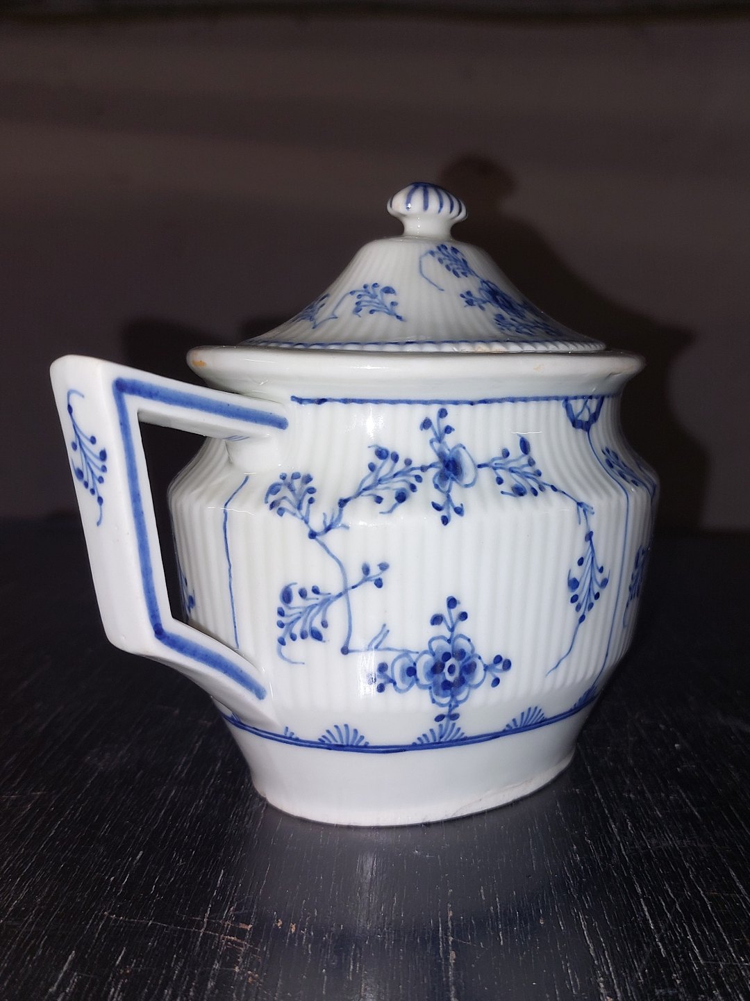 Tepotte I porcelæn fra Royal Copenhagen, Den Kongelige Porcelænsfabrik, fremstillet i første halvdel af 19. Århundrede. Skår indvendigt (se fotos). Småskrammer på bundens kant (se foto). Fabriksmærket på undersiden af hanken. Mål: H. 12,5 cm L. 17,5 cm B. 8,5 cm