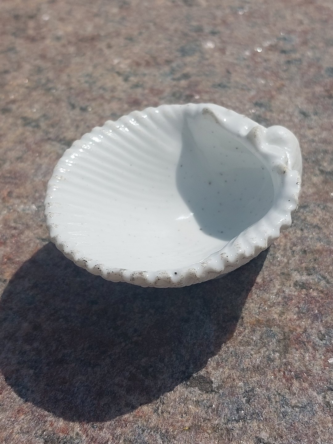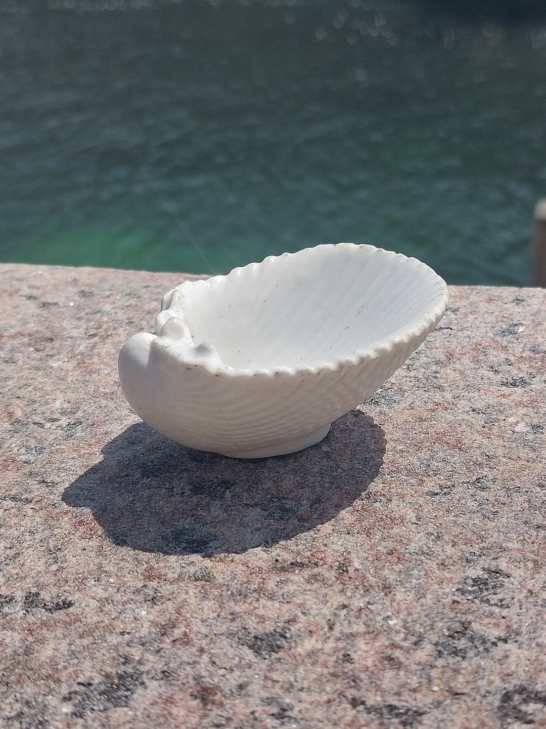 Muslingeskal saltkar i porcelæn fra Royal Copenhagen. Glaseret indvendigt uden glasur udvendigt. I perfekt stand. Fabriksmærket på bunden. Fremstillet i første halvdel af 19. århundrede. Mål: H. 1,5 cm L. 8 cm