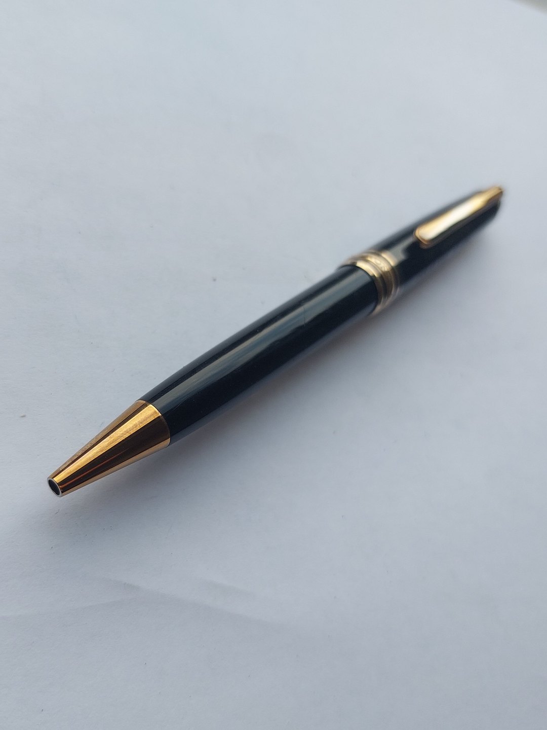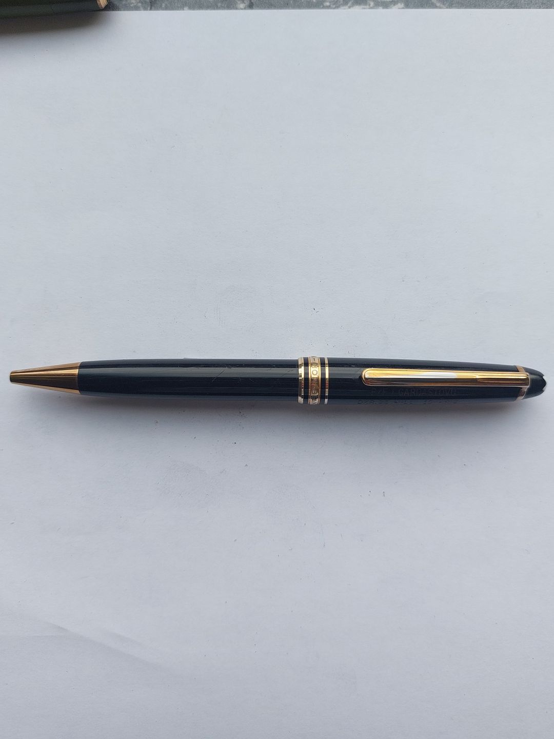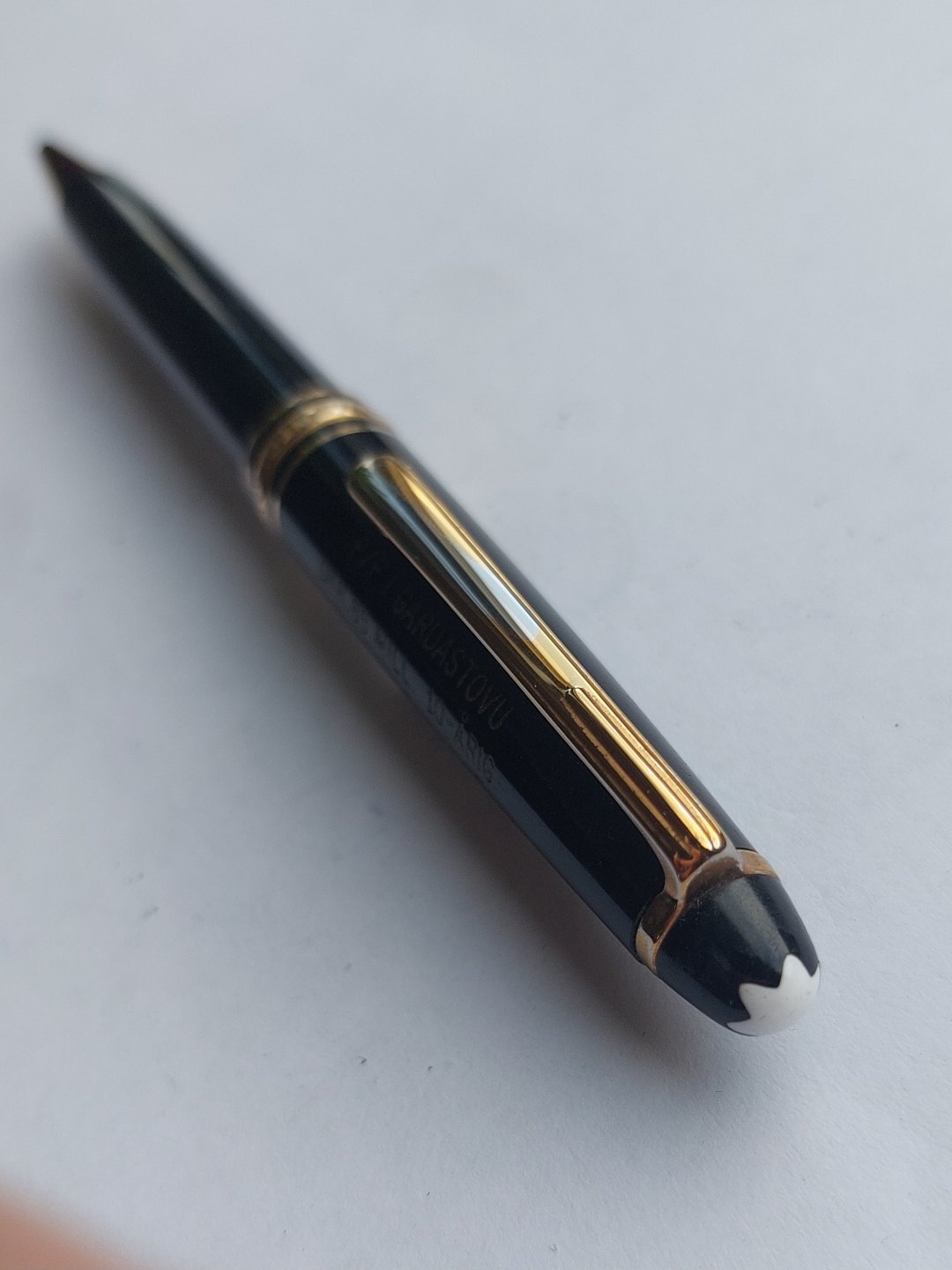 Klassisk sort Montblanc Meisterstück kuglepen. Fremstår i god stand. Indgraveret tekst øverst (se foto). Der skal indsættes ny refill før end kuglepennen igen virker.
