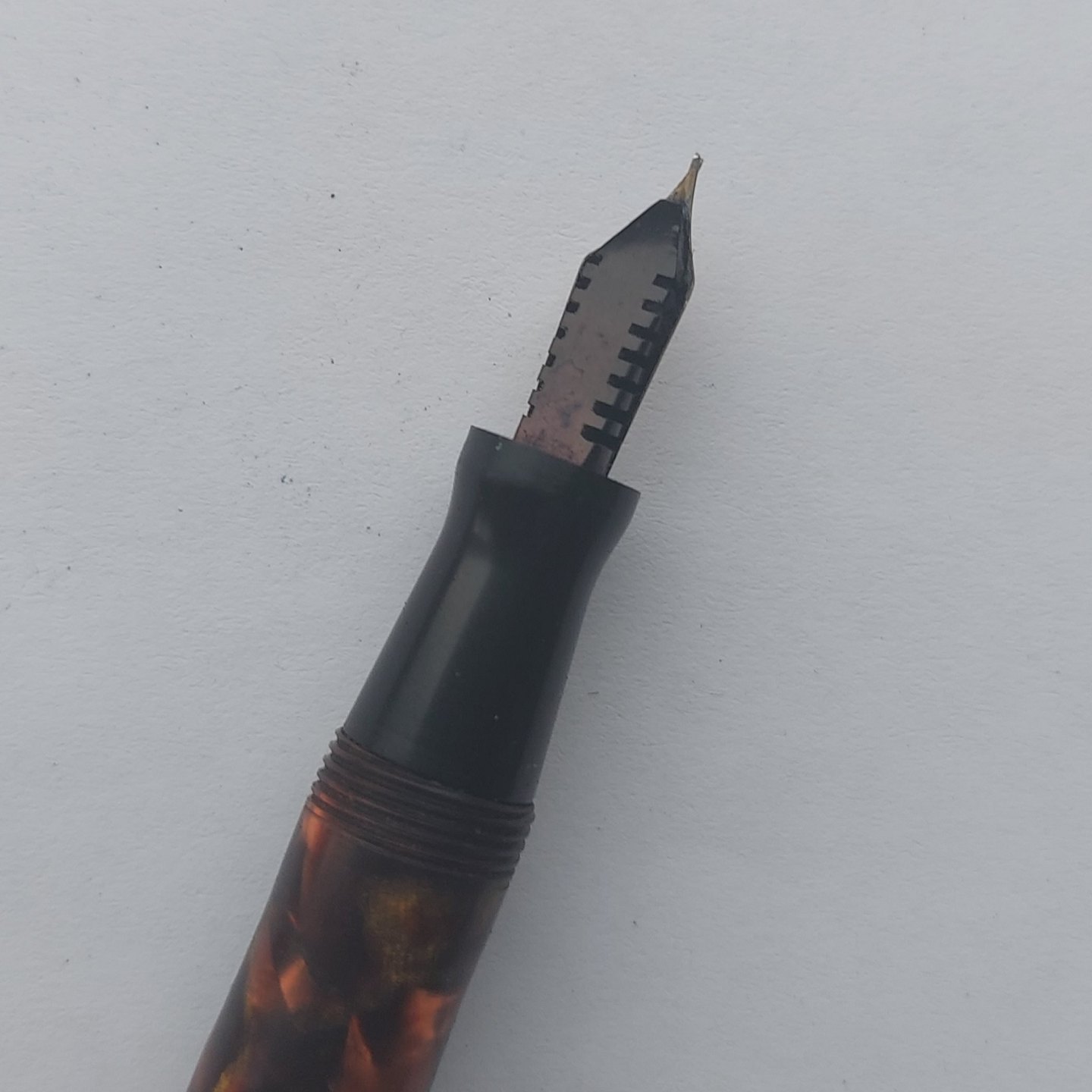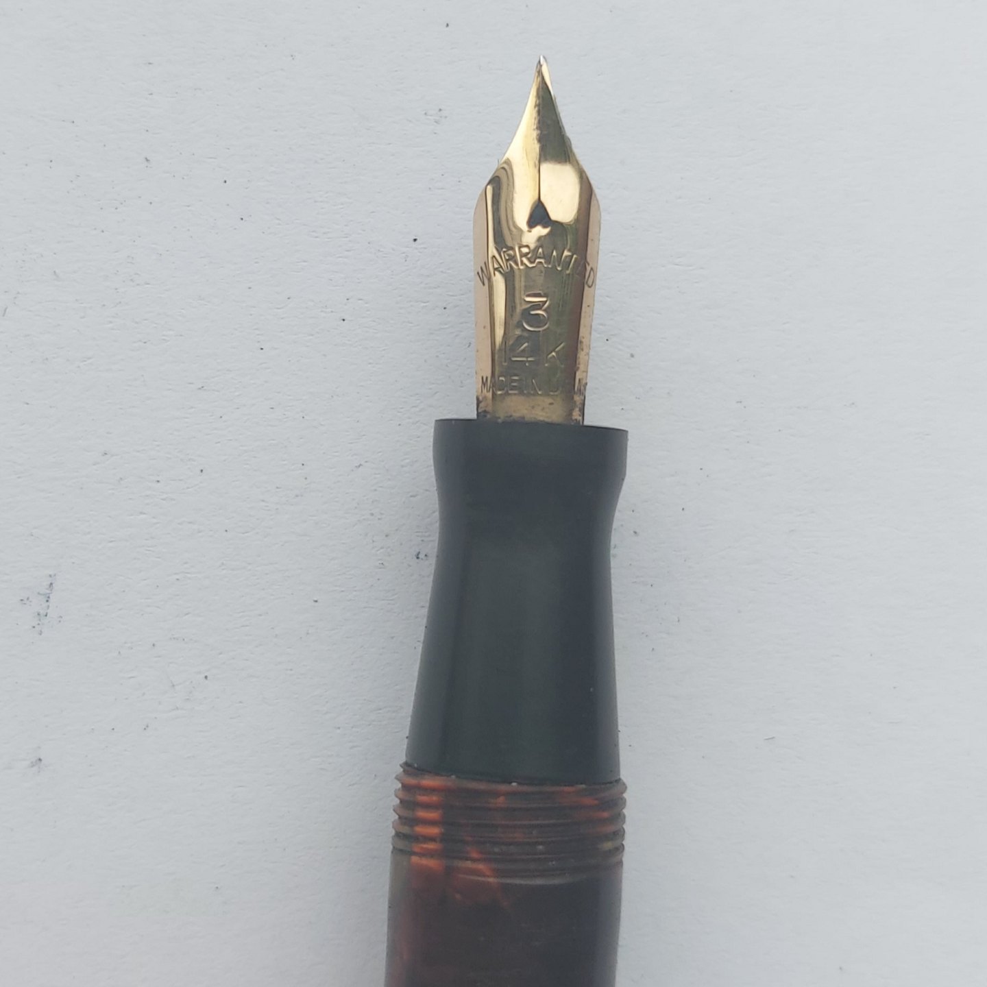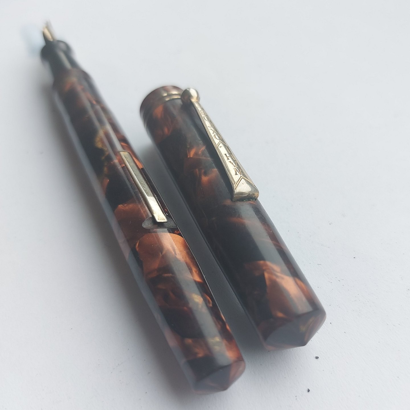 Eversharp produkt: Marmoreret Wahl Oxford fyldepen med leverfiller. Fremstår i god stand. Tekst på kroppen: Made in U.S.A by the maker of EVERSHARP. Ingen skader eller reparationer. 14 karat guldspids. Fungerer ikke. Der skal indsættes ny gummisæt før end fyldepennen skriver igen.