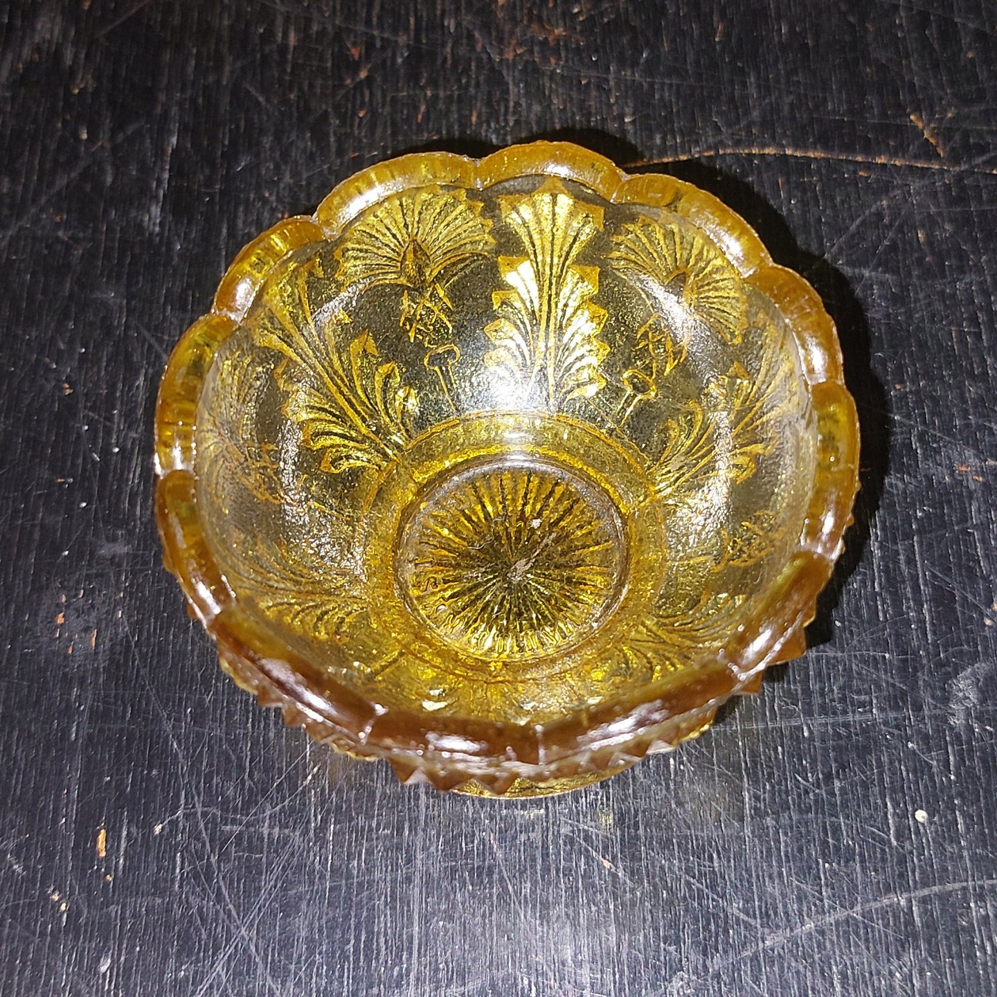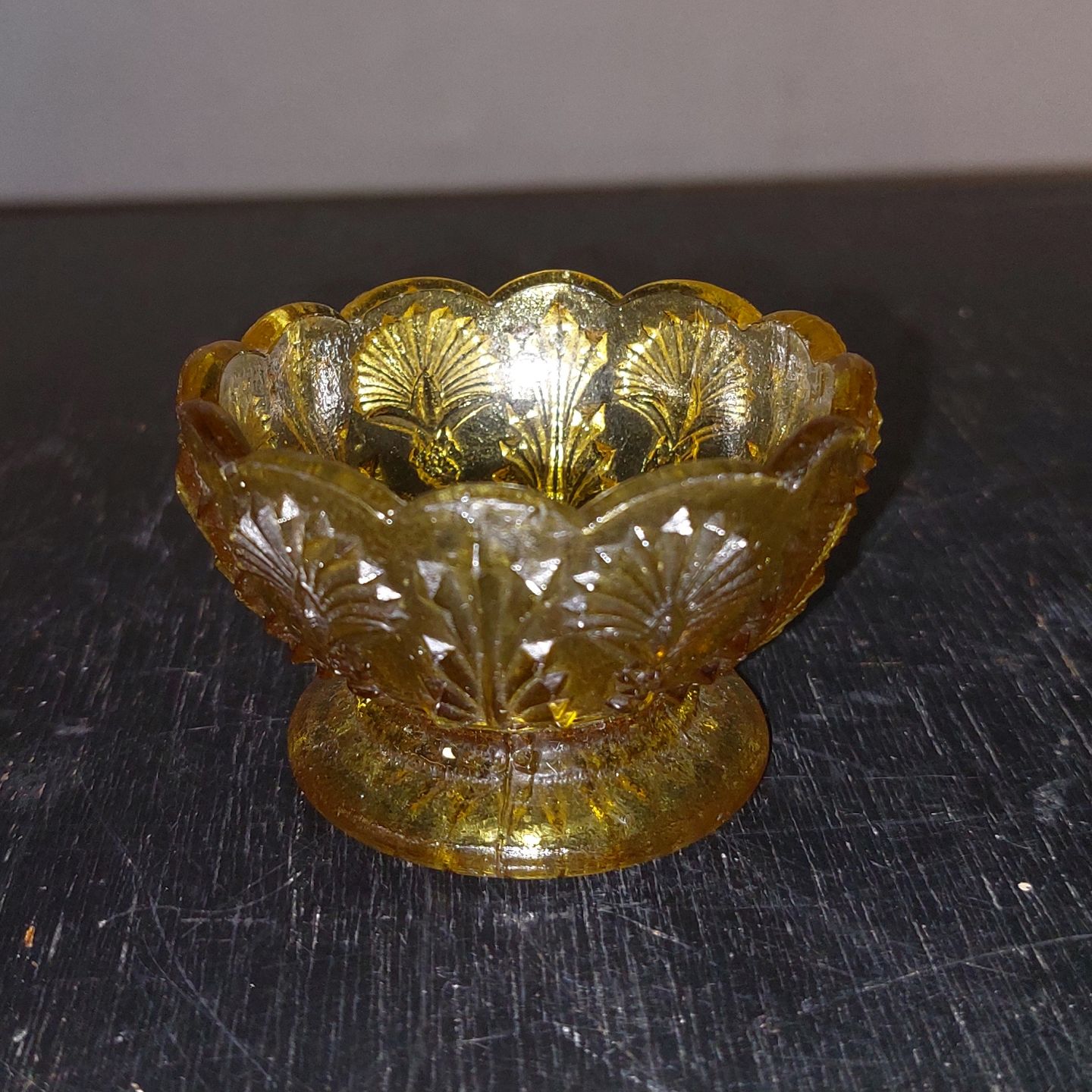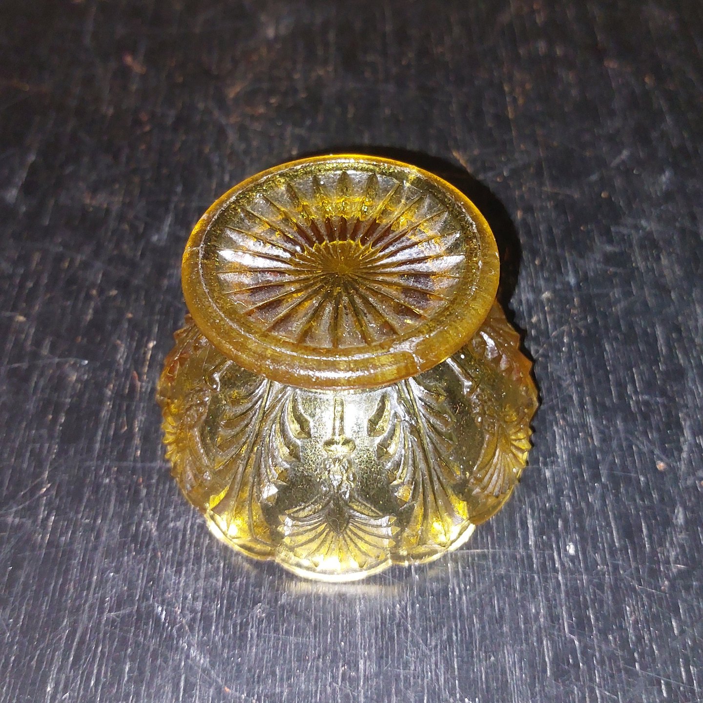 Dansk saltkar I presset glas. Brunt eller rav farvet. I god stand. Ingen skader eller reparationer.