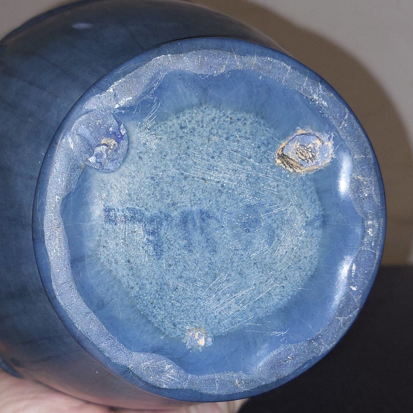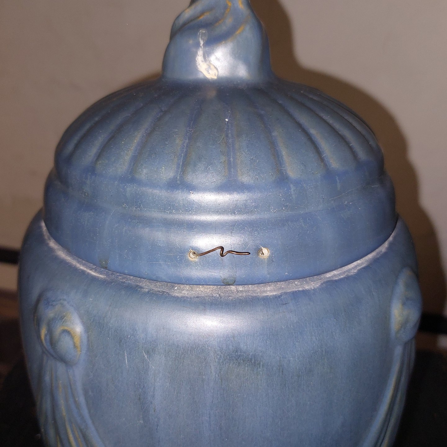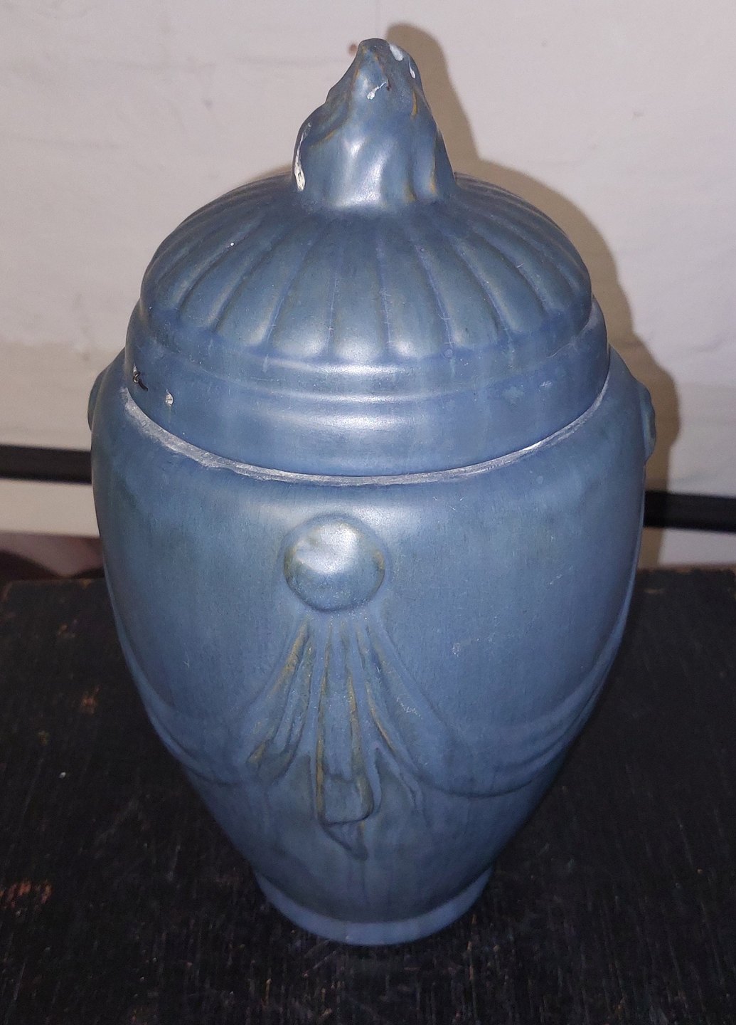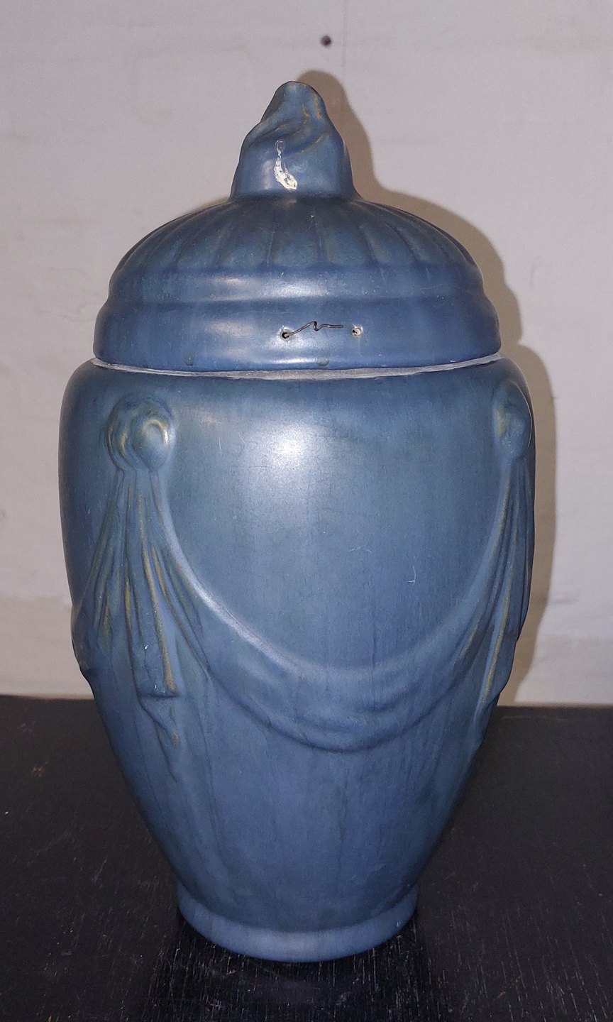 Blåt glaseret urne i keramik med tilhørende låg. Dette fastgjort med ståltråd, hvorfor låget ikke har været af den tomme underdel. Signeret MM på bunden. Fremstår I god stand uden skader eller reparationer. Formodes fremstillet omkring 1930. H. 32 cm.
