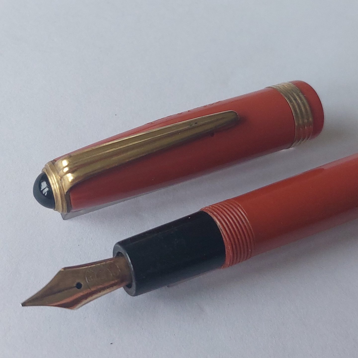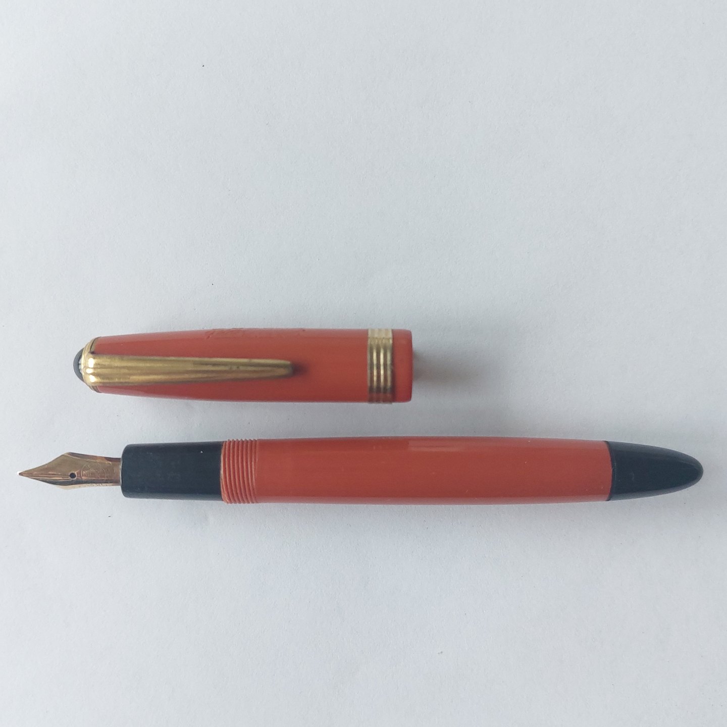 Koralrød Skribent Super 2 fyldepen. Fremstillet som bi-produkt (sub-brand) hos Penol i Danmark. Fremstillet omkring 1950. Fremstår I god stand uden skader eller reparationer. Fungerer ikke. Der skal indsættes ny gummisæk før end der kan påfyldes blæk igen. Ny gummisæk kan indsættes for et tillæg af d.kr. 200,00 Denne fyldepen er 12,5 cm lang