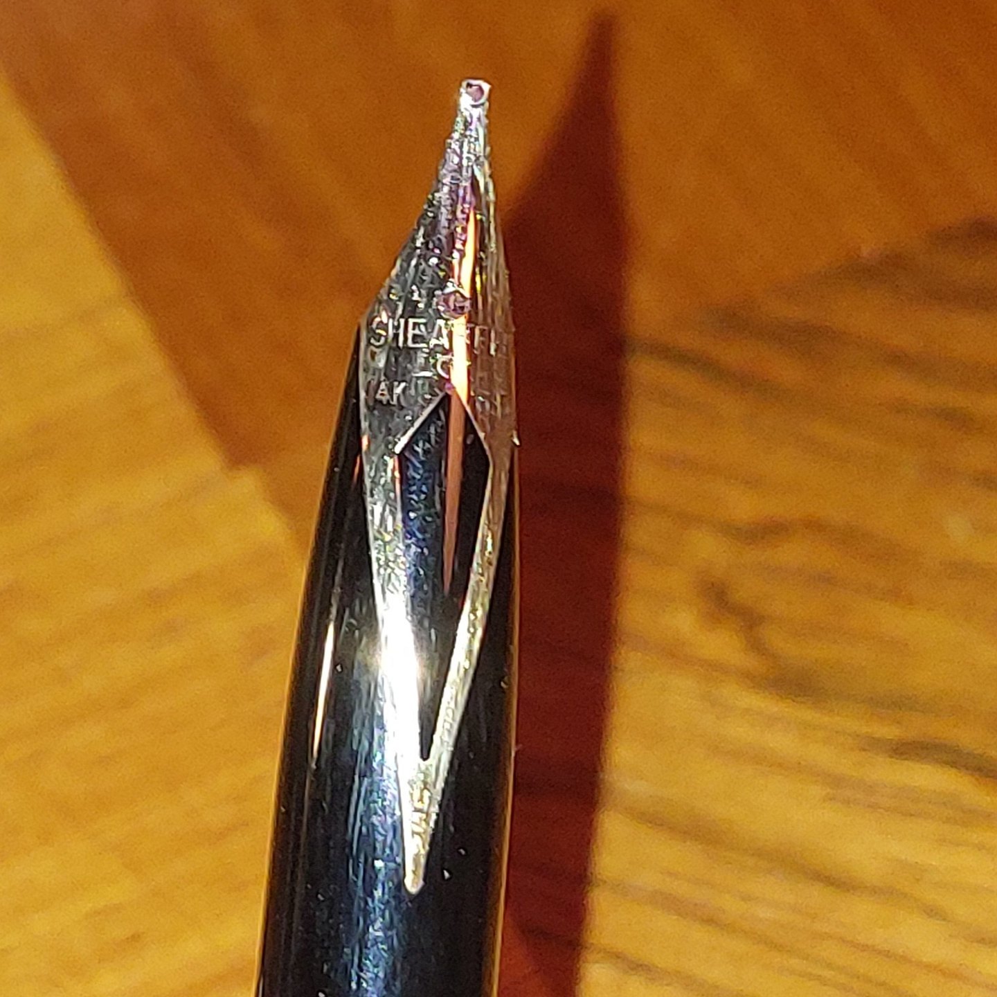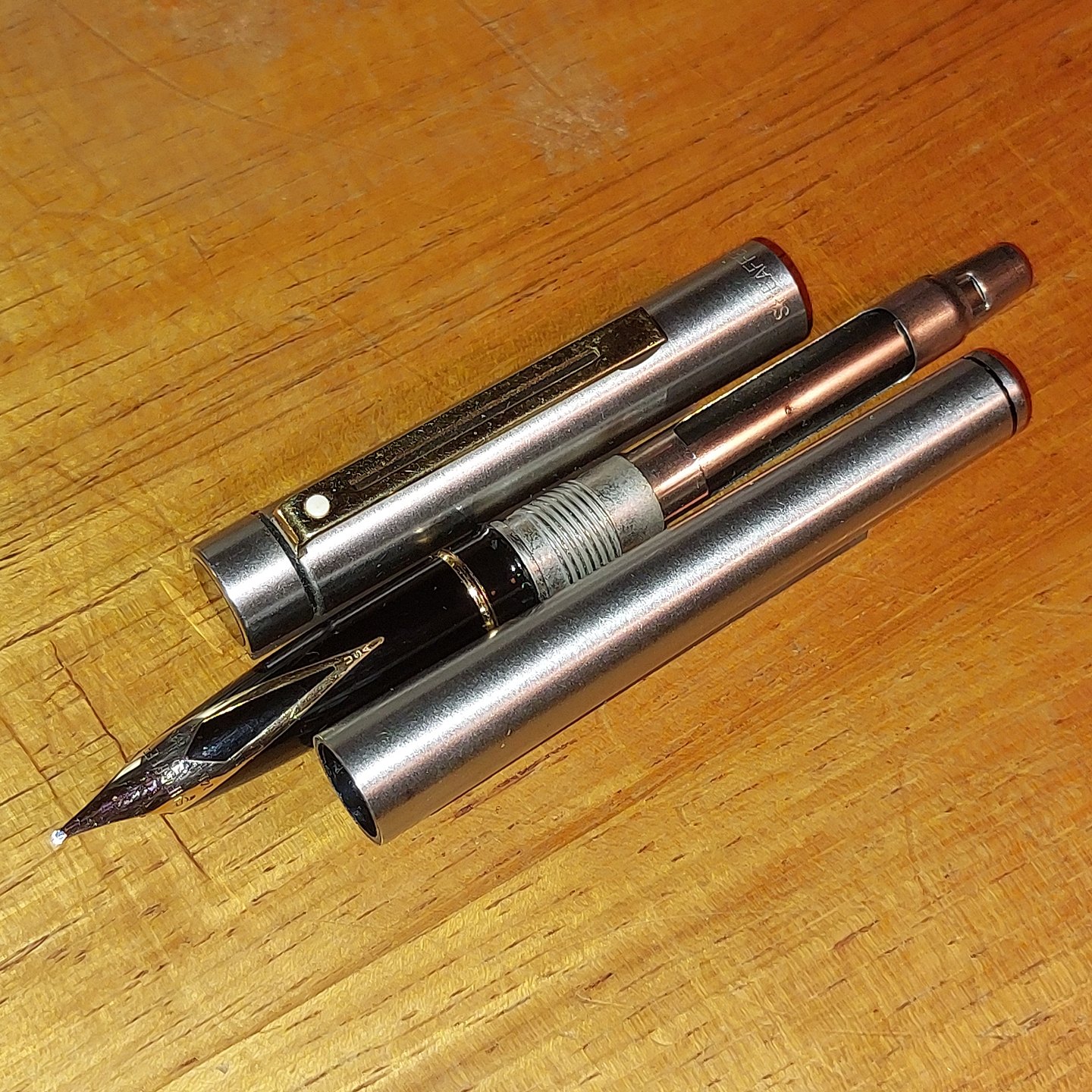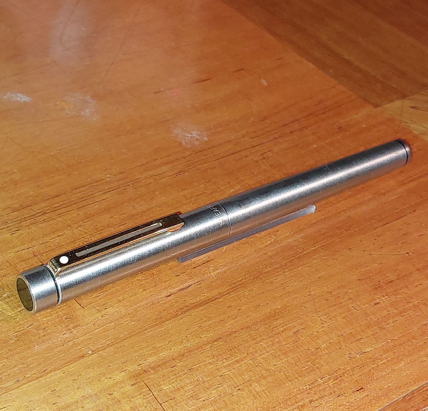 Sheaffer Targa fyldepen i stål med 14 Karat guld spids. I god og brugbar stand med gammel gummisæk.