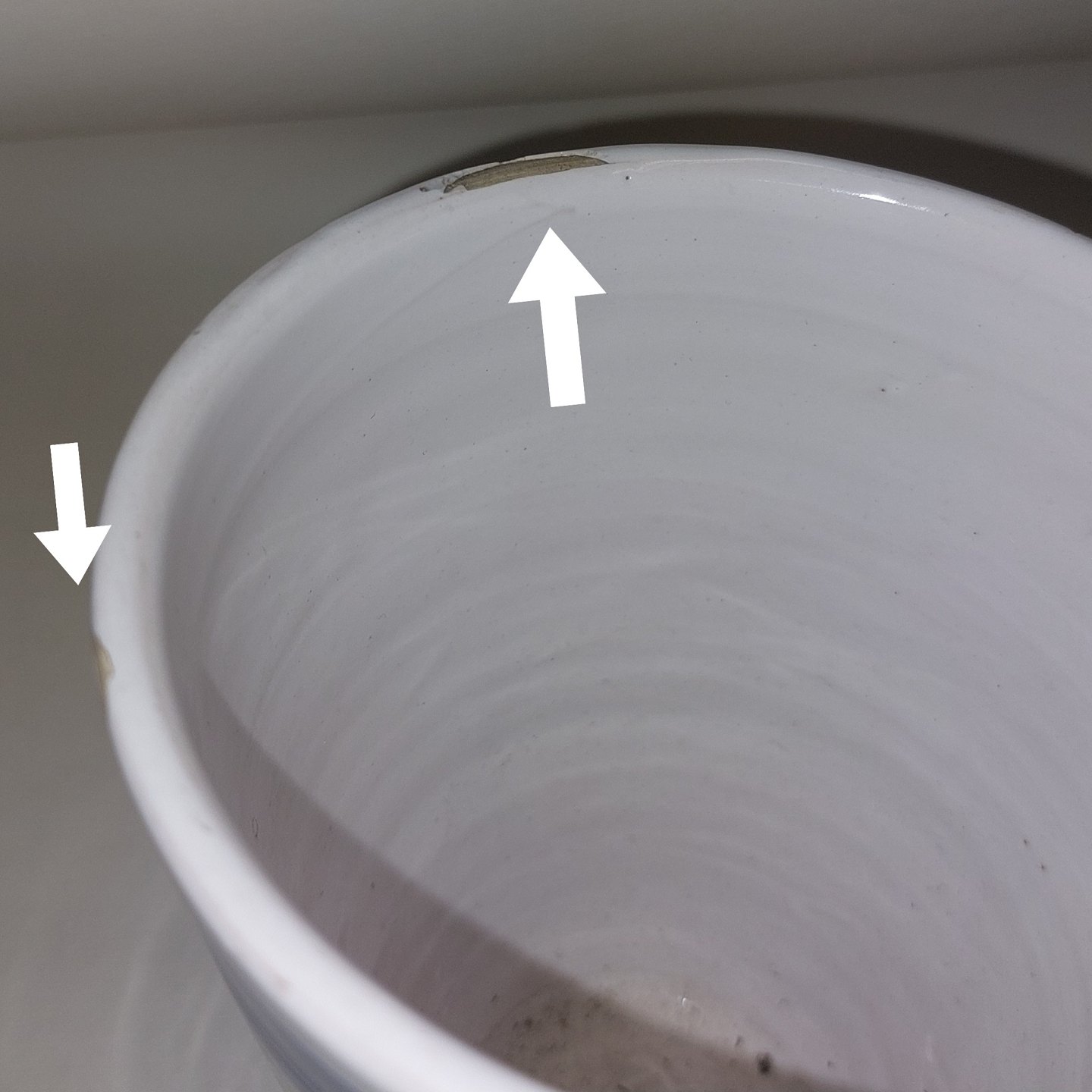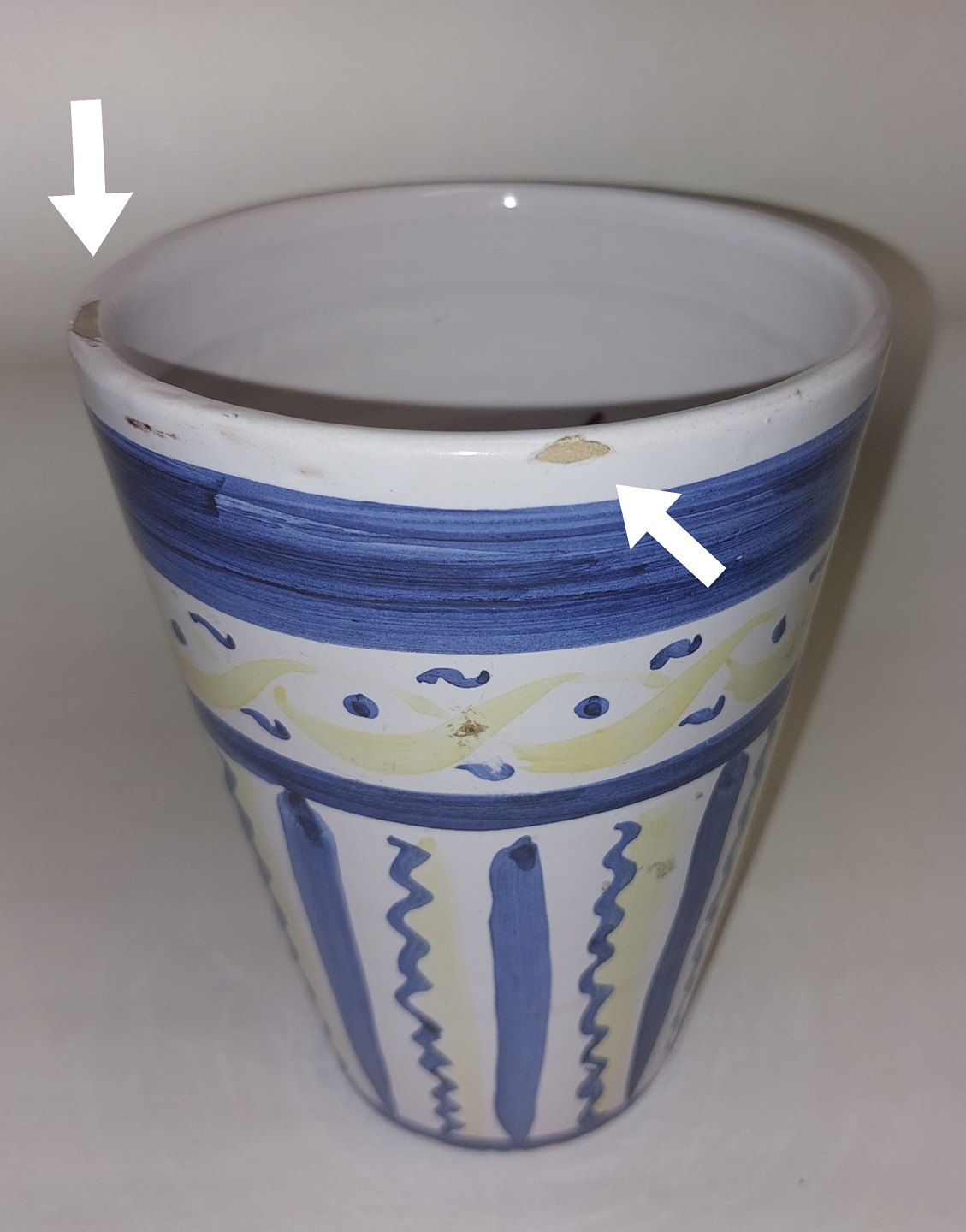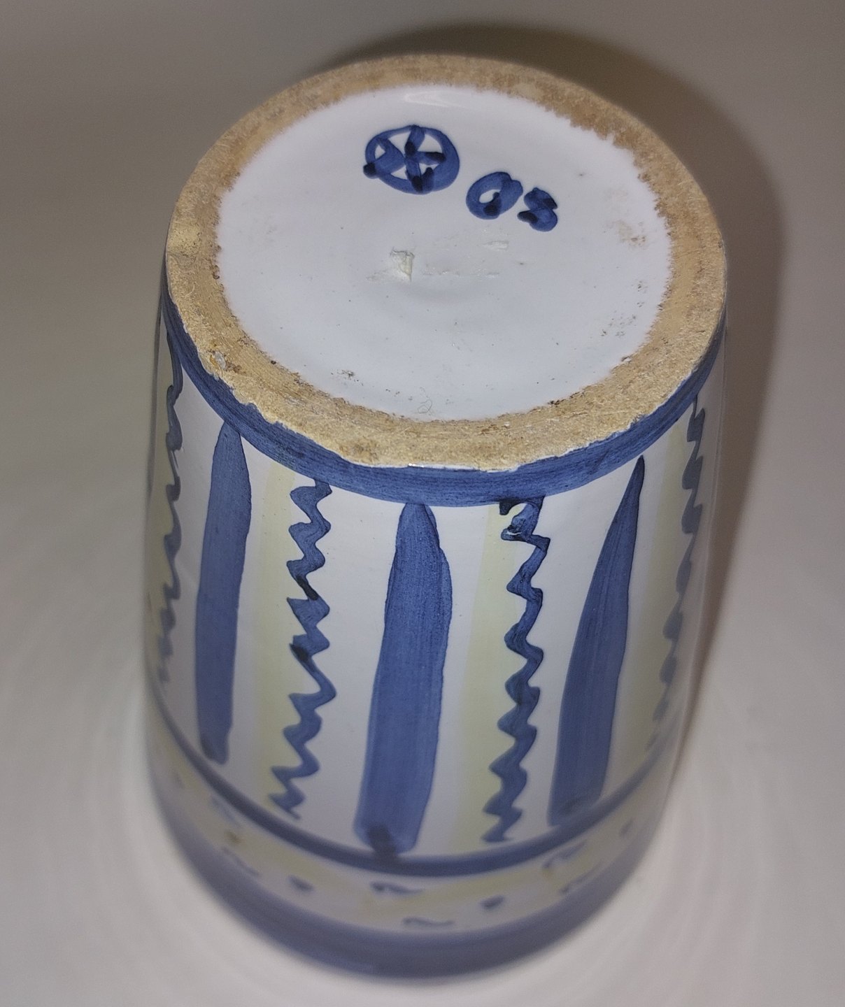 Bæger eller vase i keramik. Håndmalet dekoration. Har brugsspor på kantem i form af mindre skår og glasurafslag (se fotos). Håndmalet fabrikslogo samt signatur på bunden. Mål: H. 14 cm.Ø. 11 cm