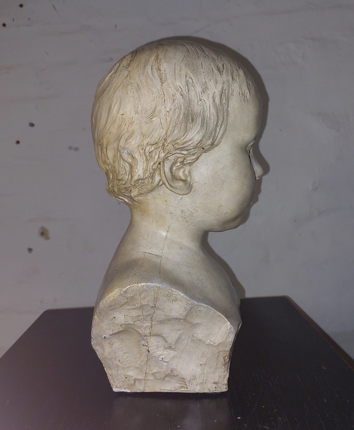 Buste af drengehoved i patineret gips. Udført af ubekendt kunstner, der har signeret busten med B. G. i April 1912. Fremstår I god stand uden skader eller reparationer. H. 33 cm
