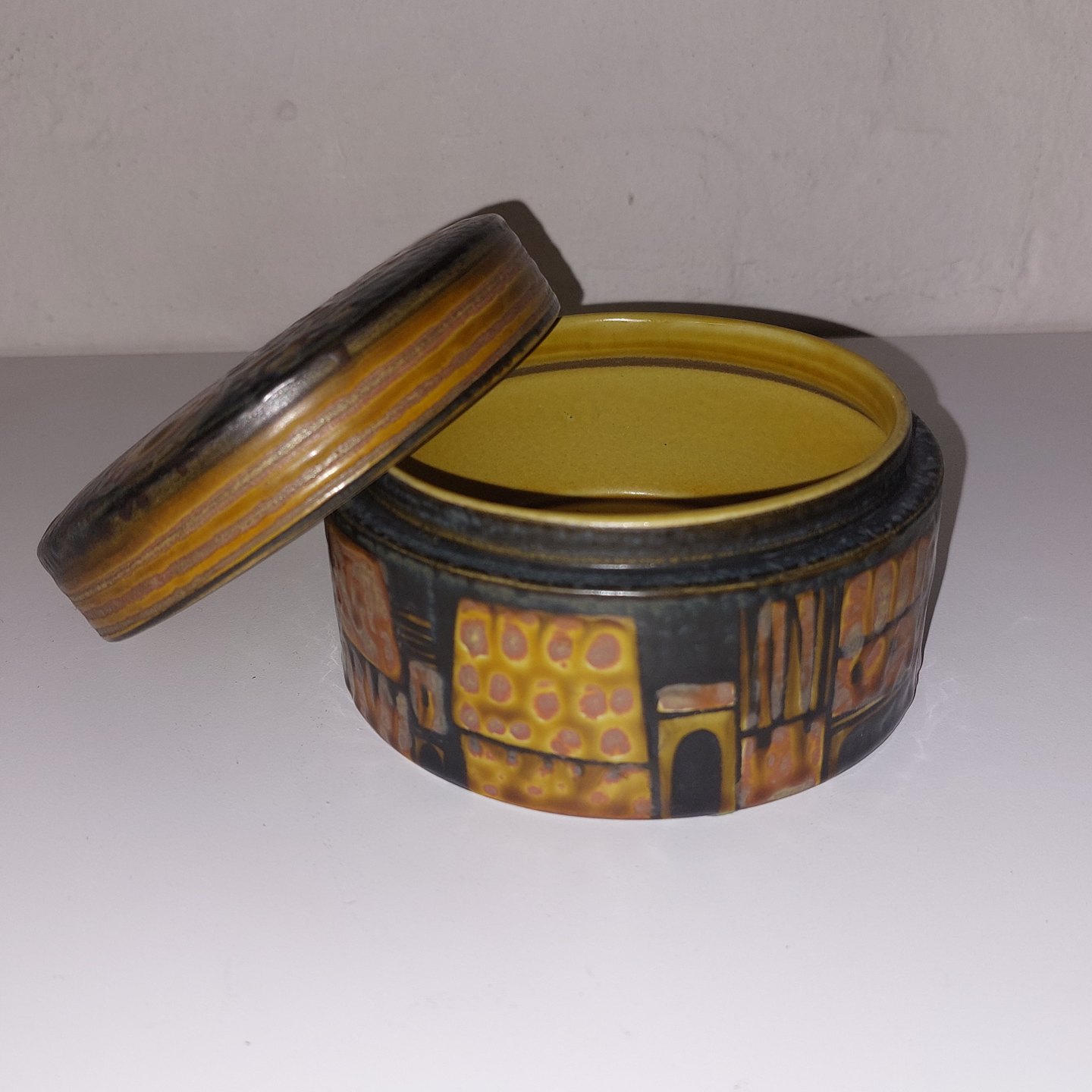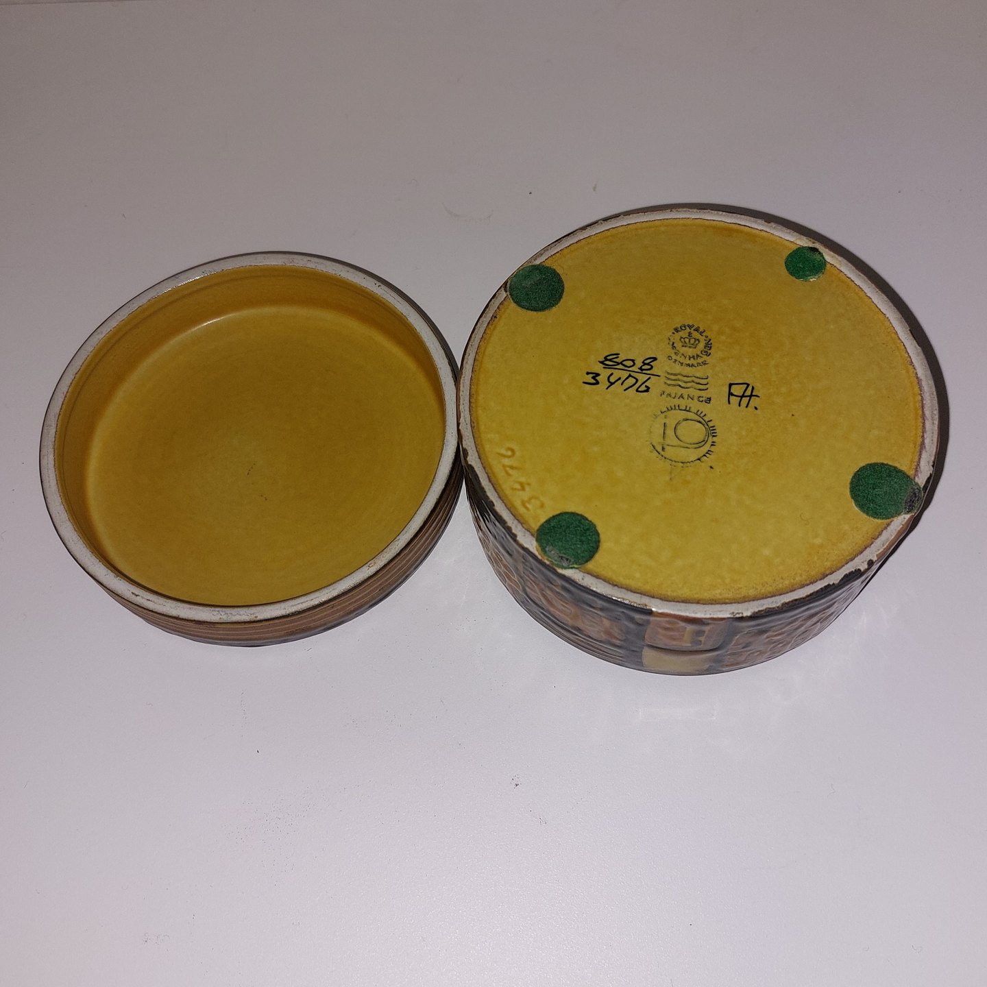 Gul lågskål med abstrakt dekoration I Royal Copenhagen (Baca-serien) fajance designet af Johanne Gerber. 1. Sortering. I perfekt stand uden skader eller reparationer. Fabriksmærket på bunden sammen med modelnummer 3476. Mål: H. 7,5 cm.Ø. 11 cm