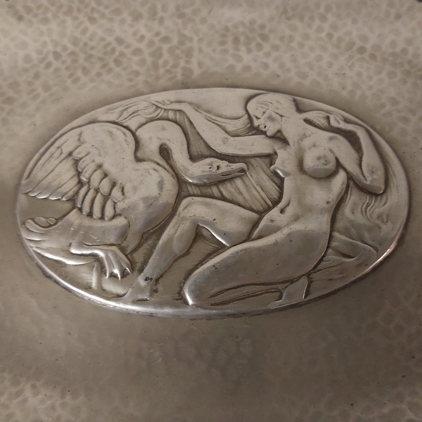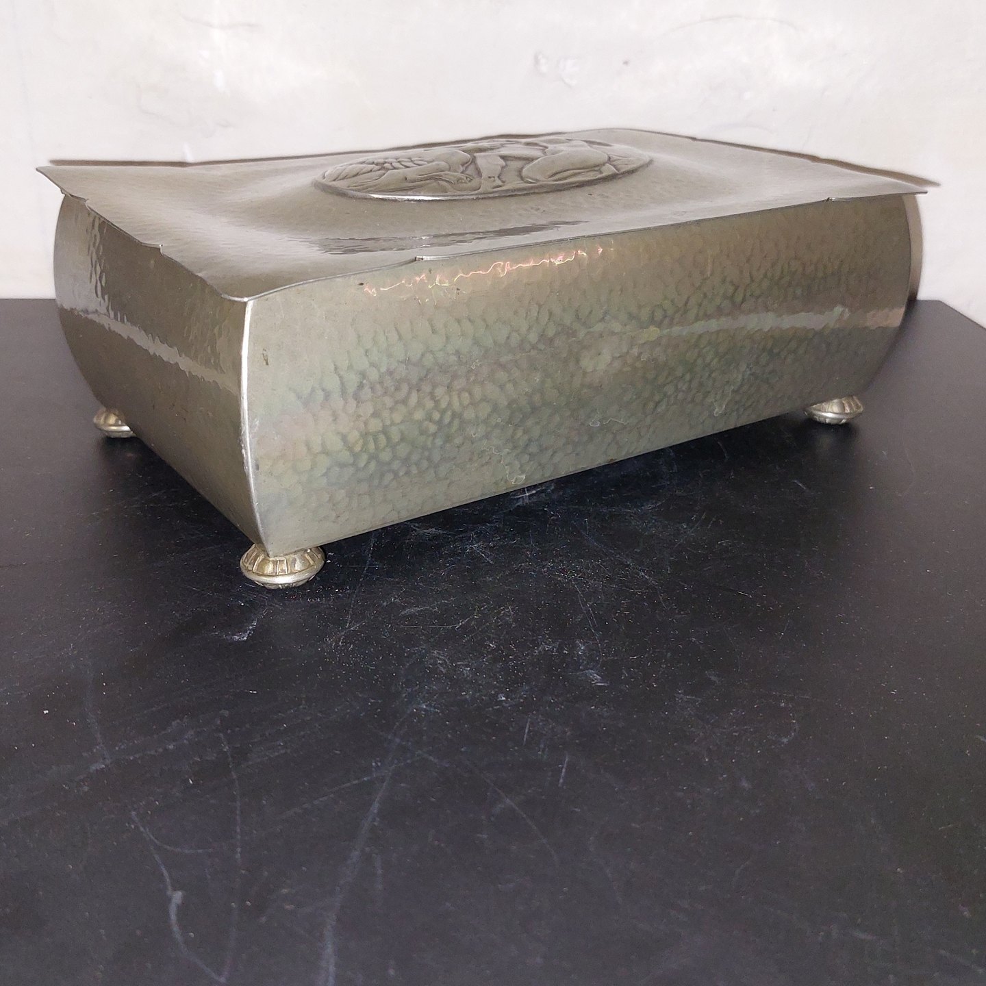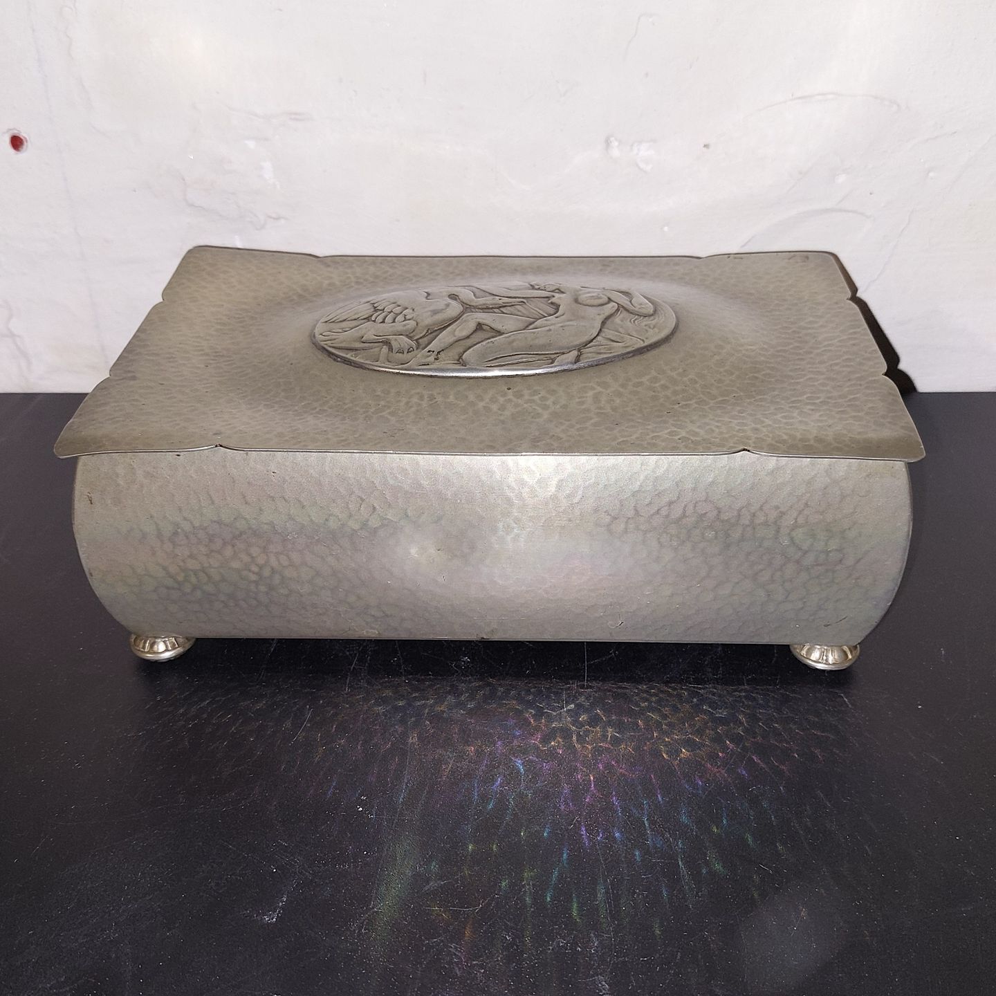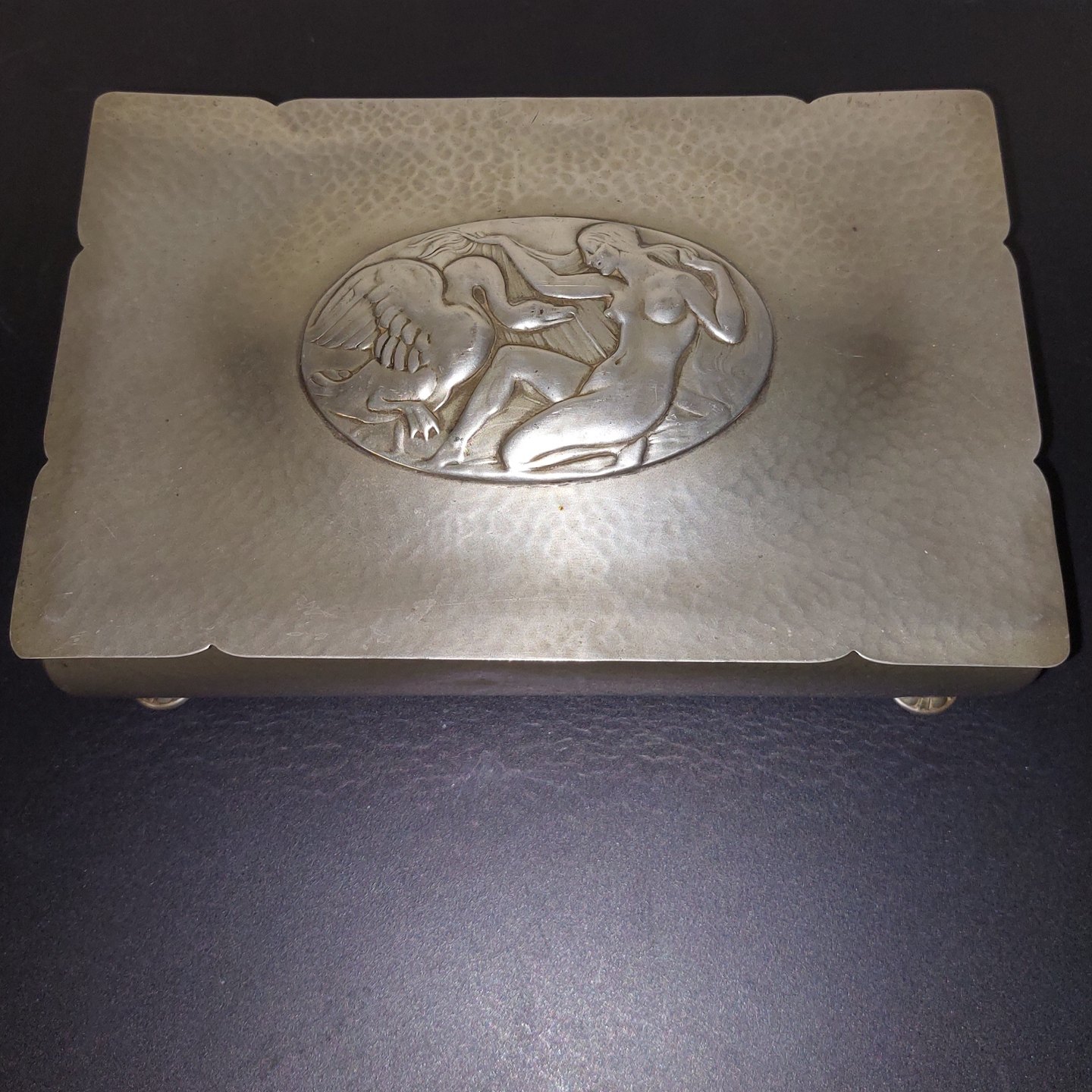 Cigarskrin i tin stående på fire fødder fra Einar Dragsted's værksted fra 1920'erne. Dekoreret på låget med.motiv af Leda og Svanen. Privat indgravering indvendigt i låget. Fremstår I god stand uden skader eller reparationer. Fabriksmærket på bunden. Mål: H. 8,5.cm, L. 22 cm og 14 cm dyb.