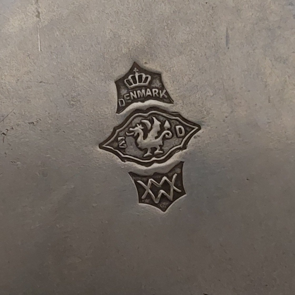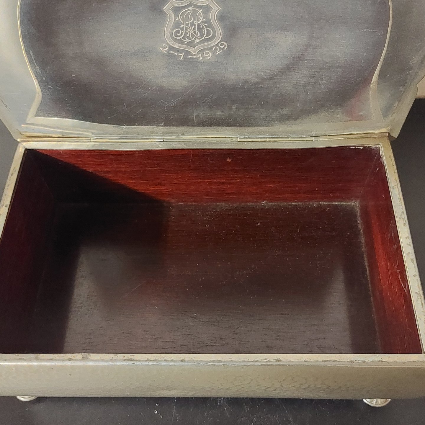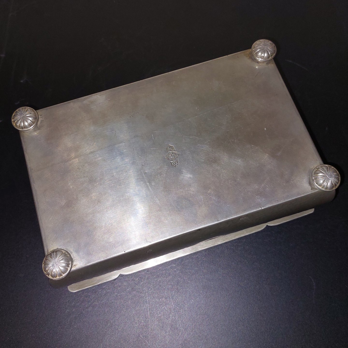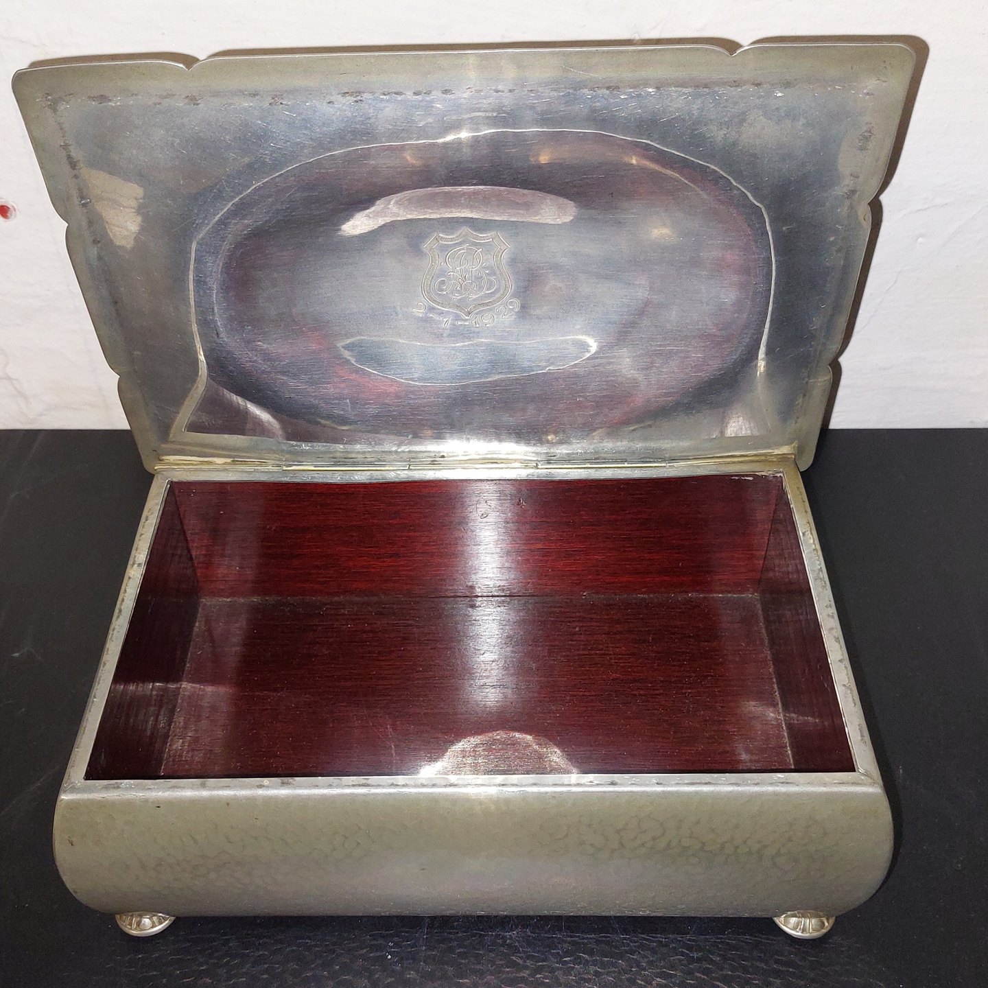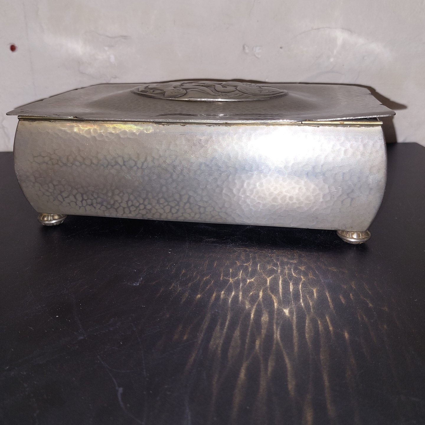 Cigarskrin i tin stående på fire fødder fra Einar Dragsted's værksted fra 1920'erne. Dekoreret på låget med.motiv af Leda og Svanen. Privat indgravering indvendigt i låget. Fremstår I god stand uden skader eller reparationer. Fabriksmærket på bunden. Mål: H. 8,5.cm, L. 22 cm og 14 cm dyb.