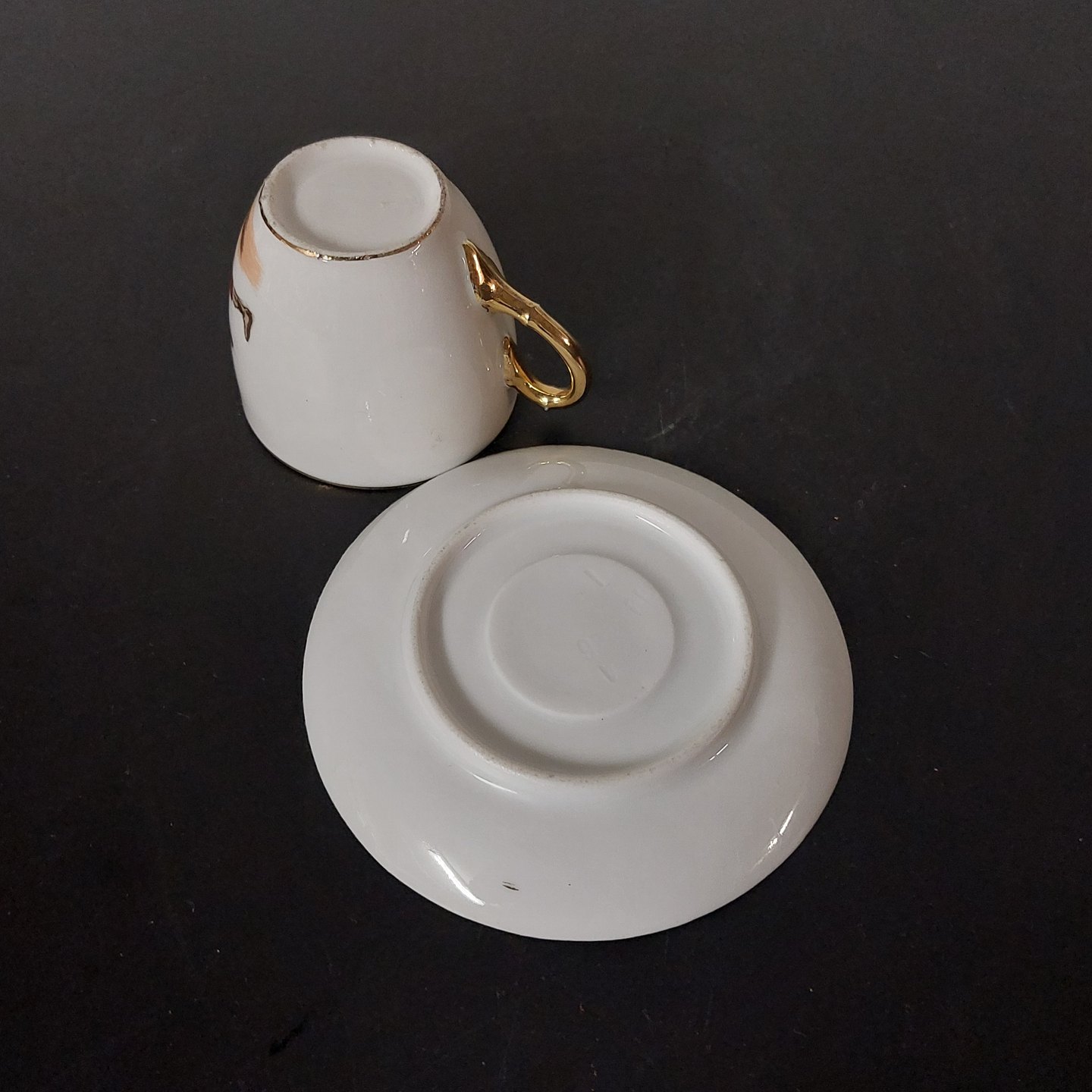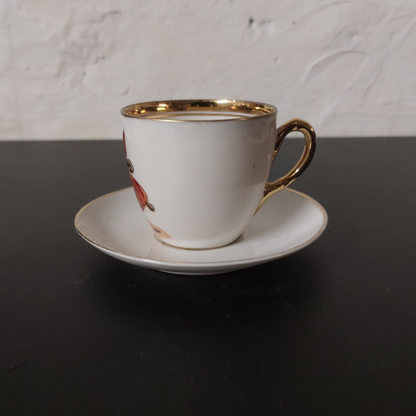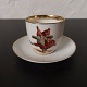 Kaffekop med underkop I porcelæn. Ubekendt producent. Bemalet nisse dekoration. Nisserfar giver nissemor en ordentlig tur på dansegulvet ... Eller også er det omvendt. Formodes fremstillet omkring 1910-20. Mål:.Koppen er 5,5 cm høj og underkoppens diameter er 10,5 cm.