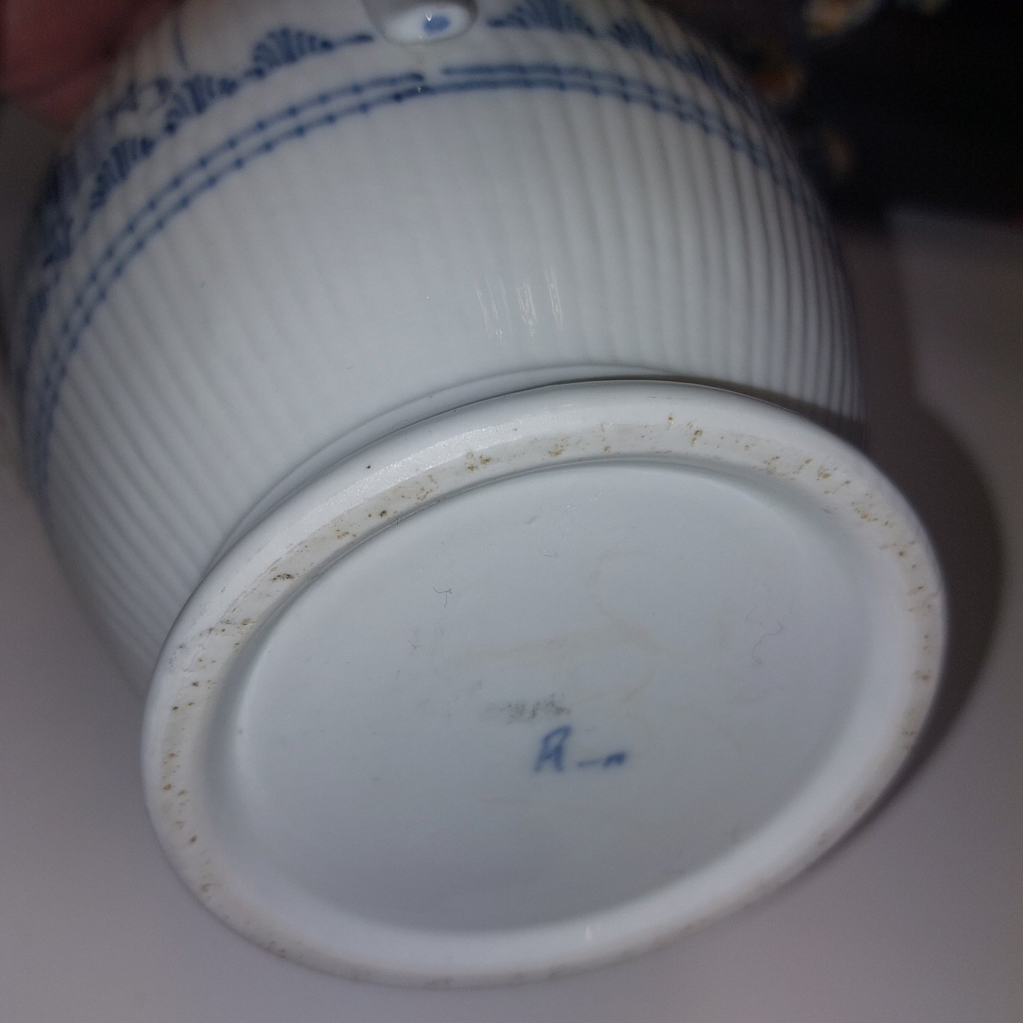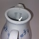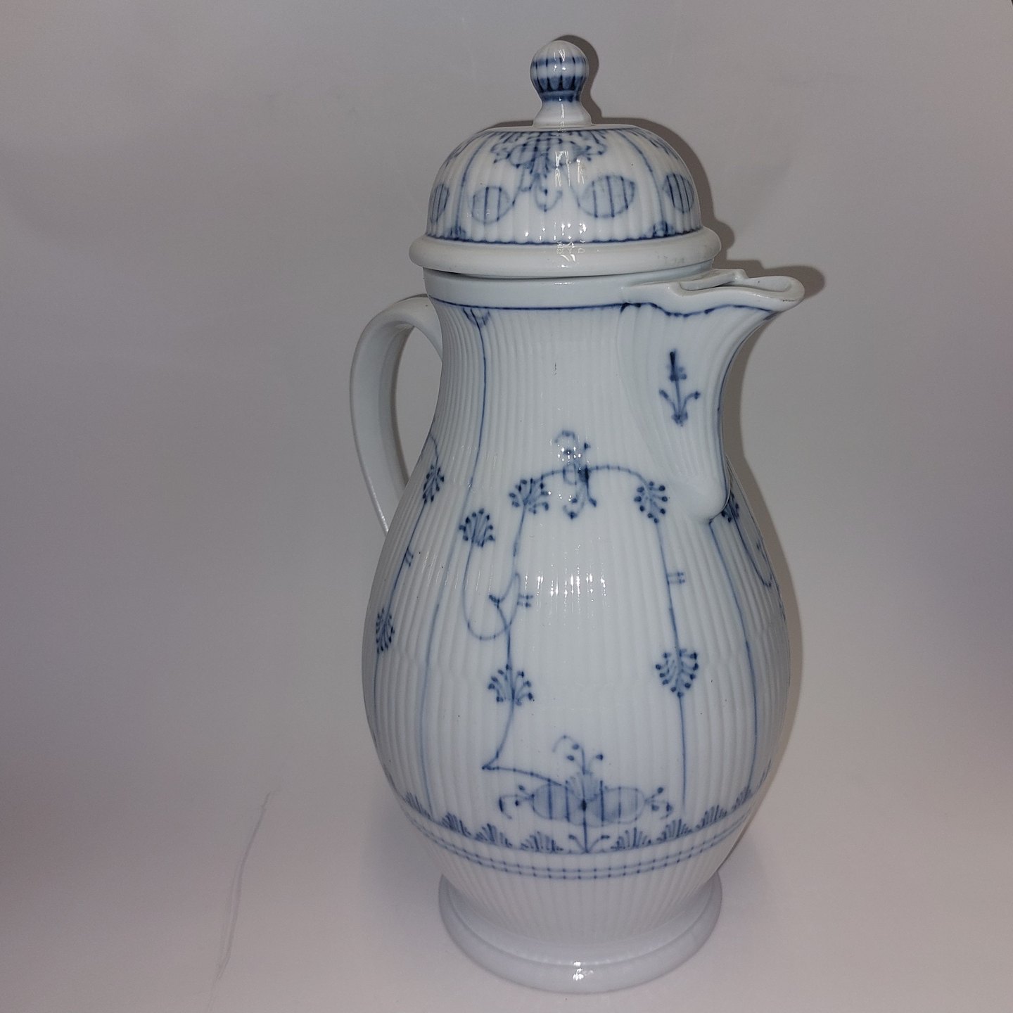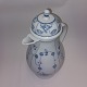 Kaffekande i porcelæn. Dekoreret musselmalet i blåt. Produceret på Rauenstein porcelænsfabrik i Tyskland i første halvdel af 19. Århundrede. Har er enkelt skår på bagsiden kant øverst. Fabriksmærket på bunden. H. 27 cm