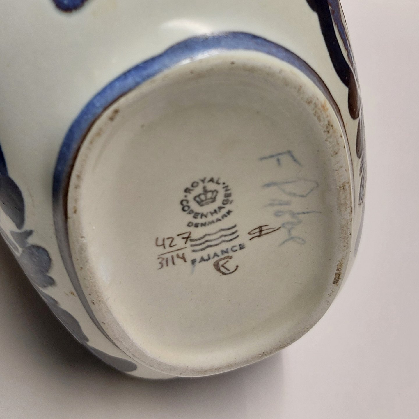 Baca fajance vase med blå dekoration. Designet af Cari Kristensen for Royal Copenhagen. Dekoreret nr. 427 / 3114. Fremstår I god stand uden skader eller reparationer. 1. Sortering. Mål: H. 21 cm B. 19 cm