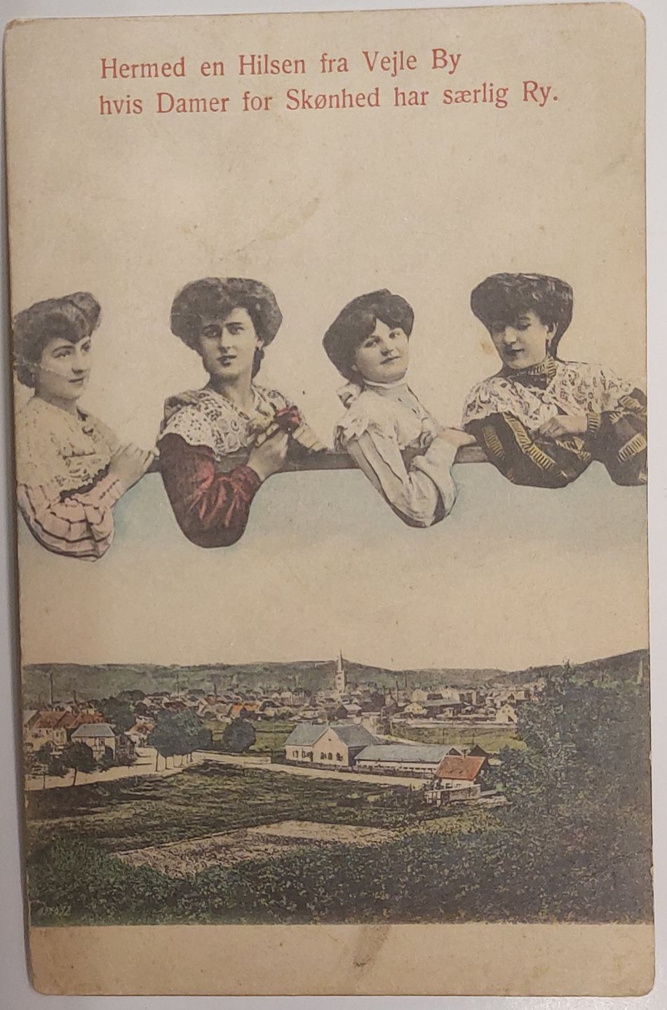 Ubrugt postkort med collage med fire smukke unge kvinder, der sender hilsen fra Vejle ca. 1910. Ubrugt. I god stand.