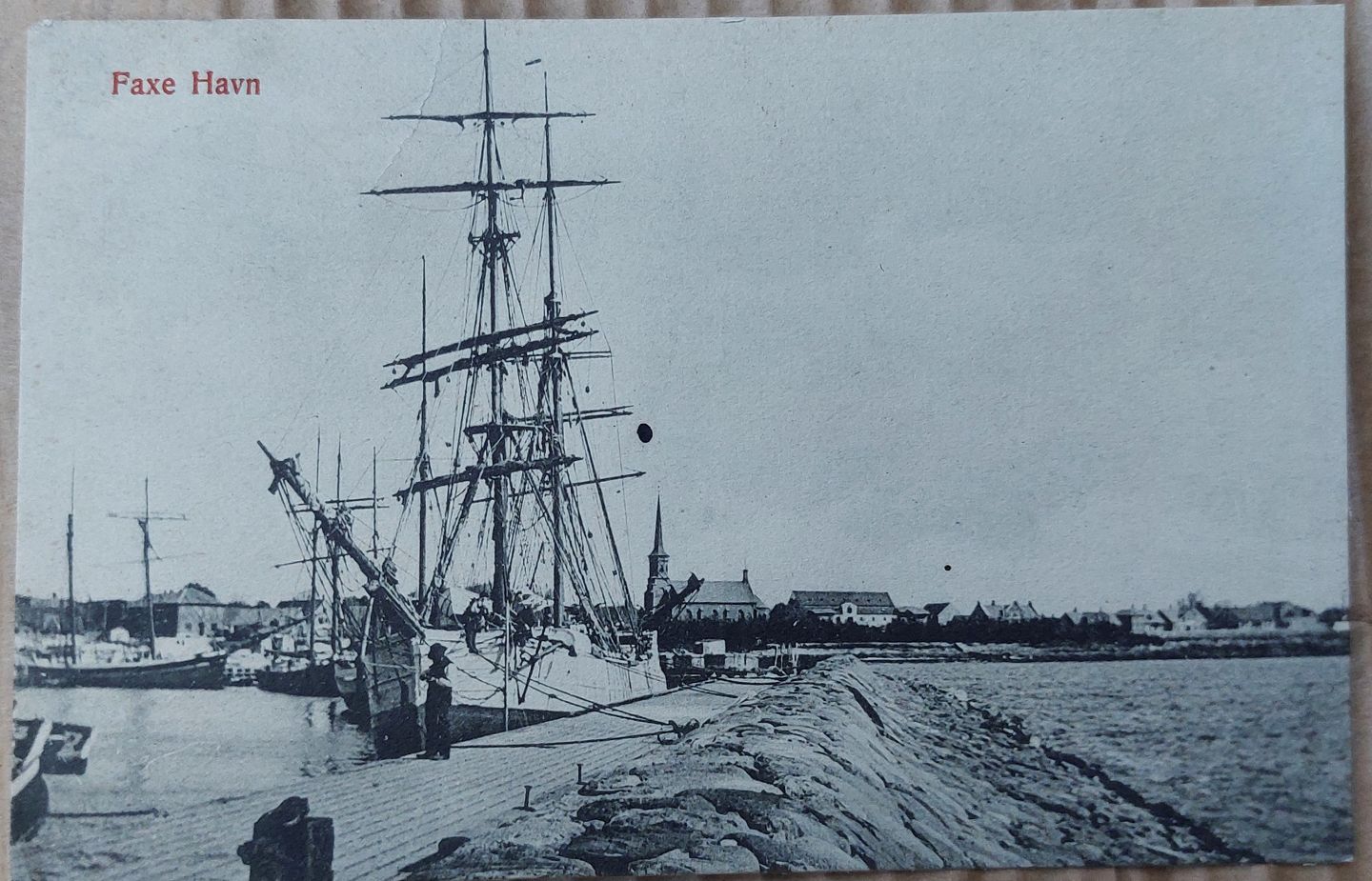 Postkort: Motiv med skibe i Faxe Havn i 1909