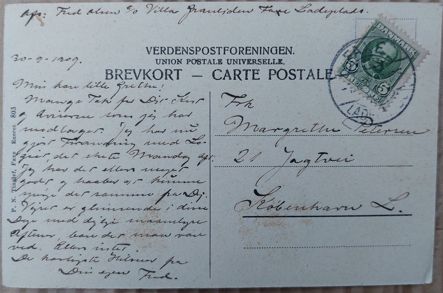 Postkort: Motiv med skibe i Faxe Havn. Annulleret FAXE LADEPLADS I 1909. I god stand