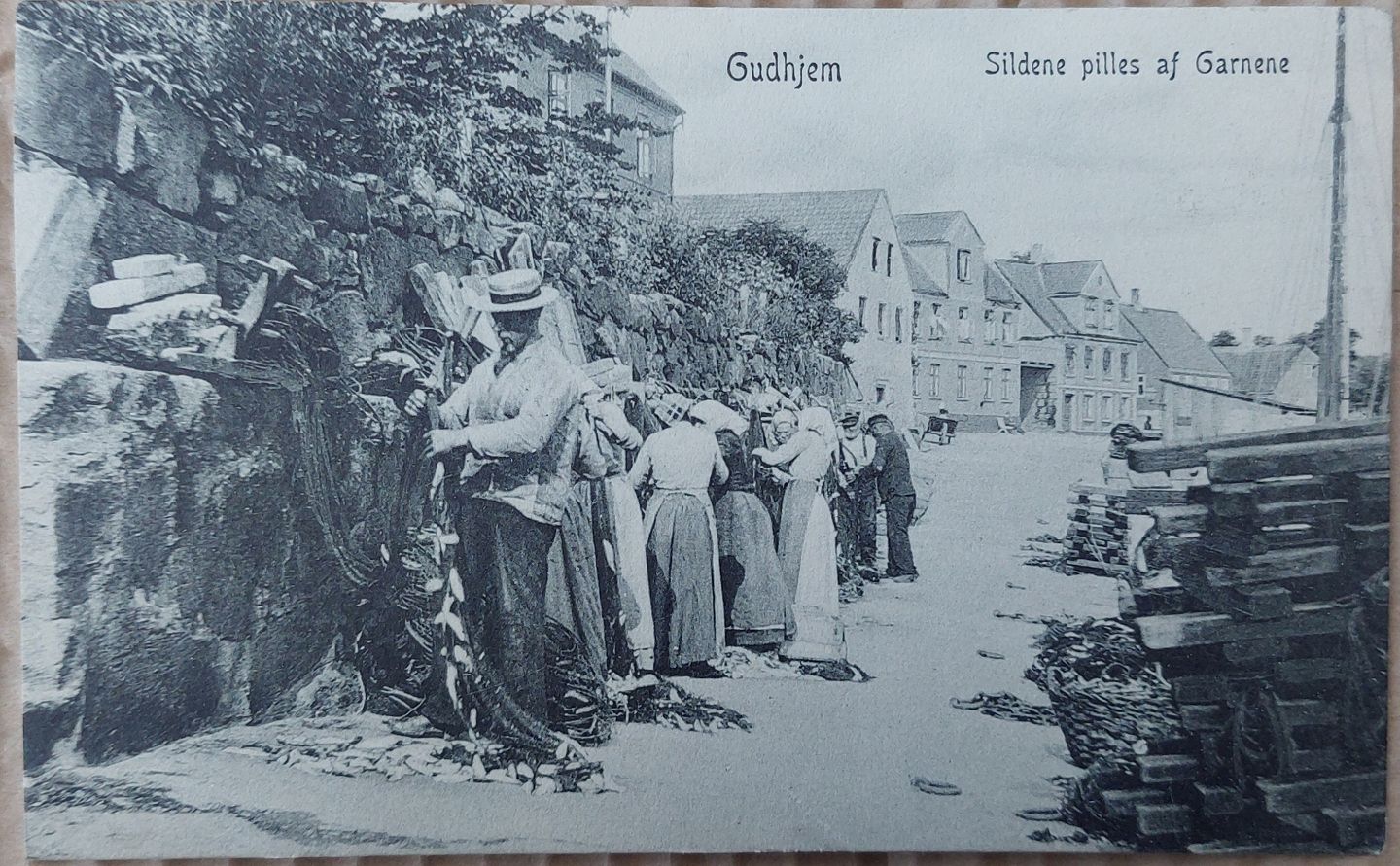 Postkort: Sildene pilles af garnene, Gudhjem 1911