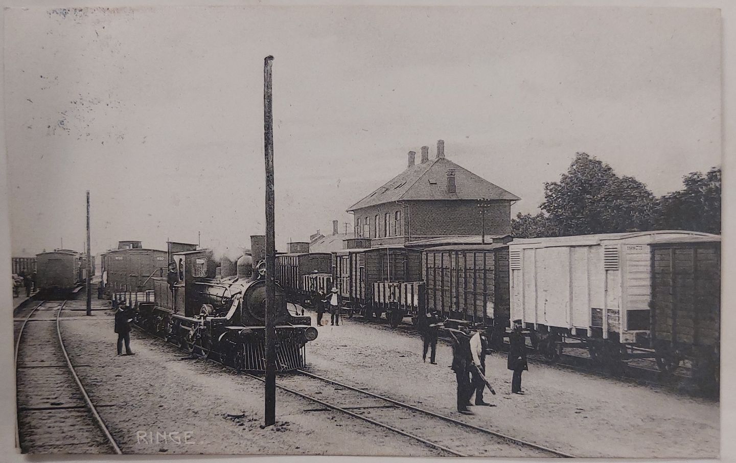 Postkort: Motiv med lokomotiv og jernbanepersonsale ved Ringe station..Annulleret RINGE i 1911. I god stand.