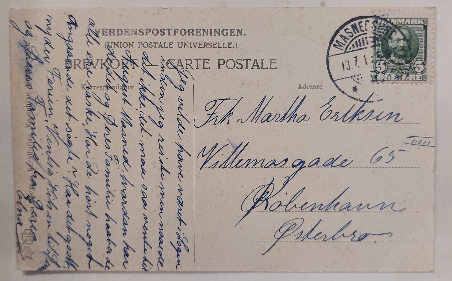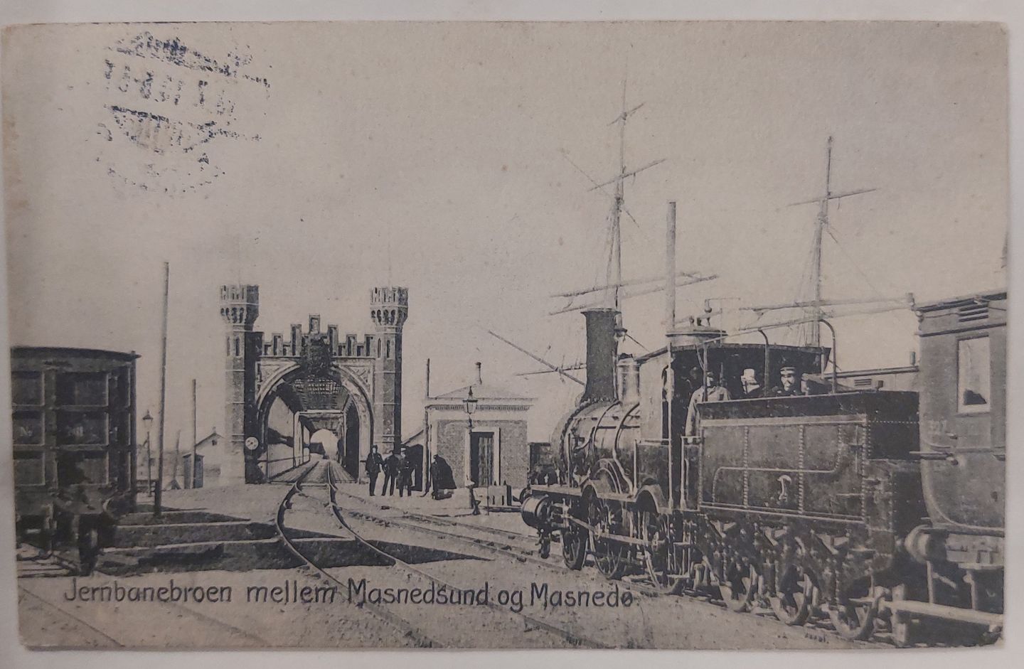 Postkort: Jernbanebroen mellem Masnedsund og Masnede. Annulleret MASNEDSUND i 1911. Motiv med lokomotiv og vogne. I god stand