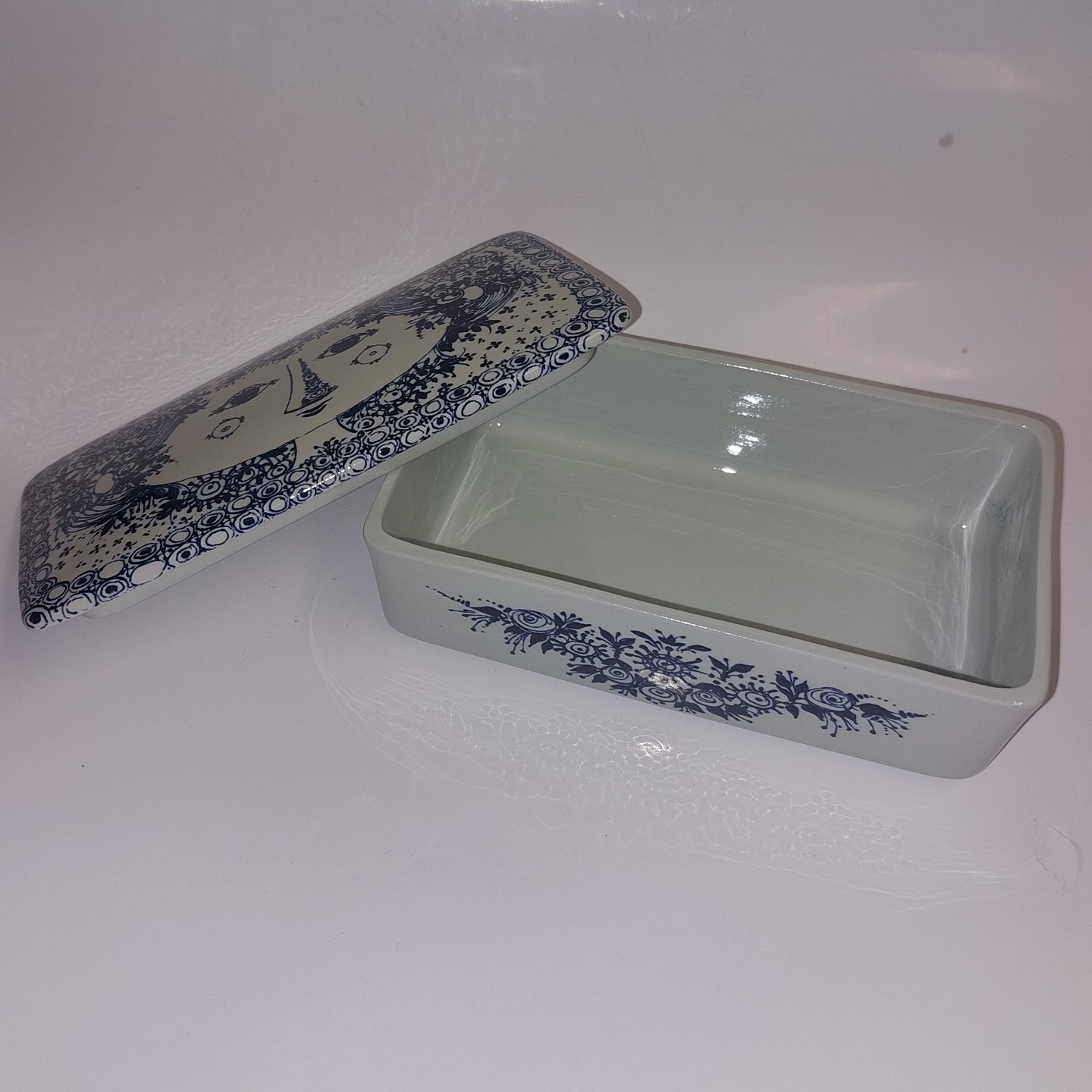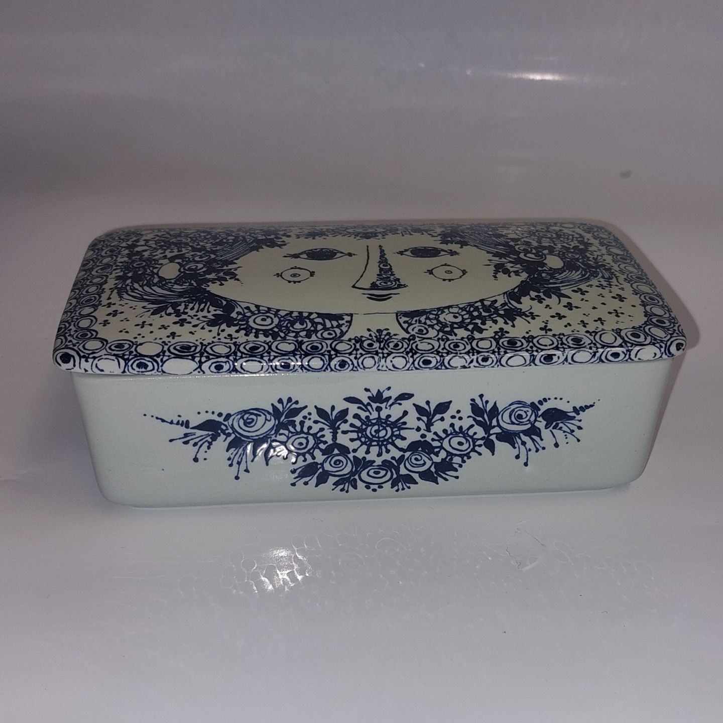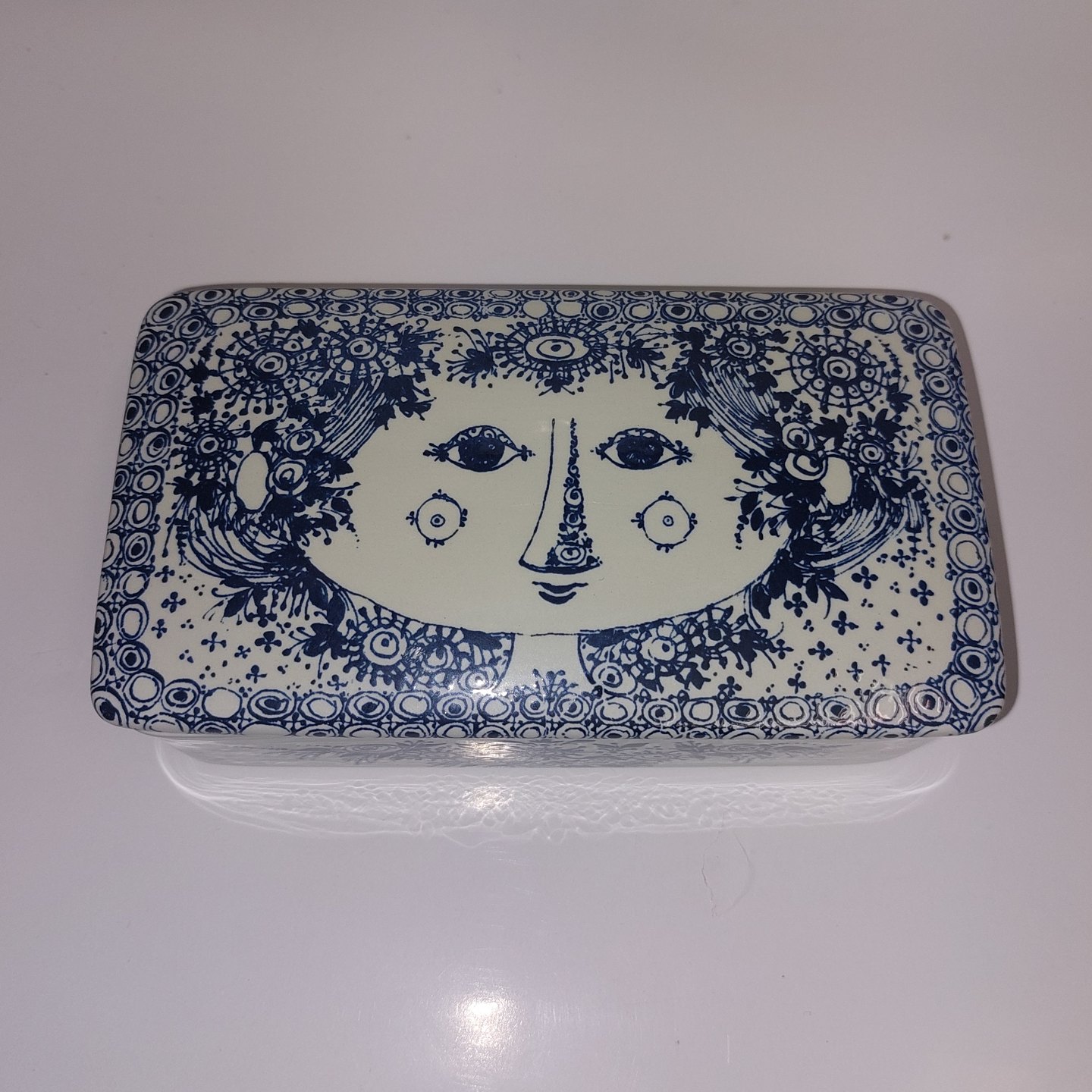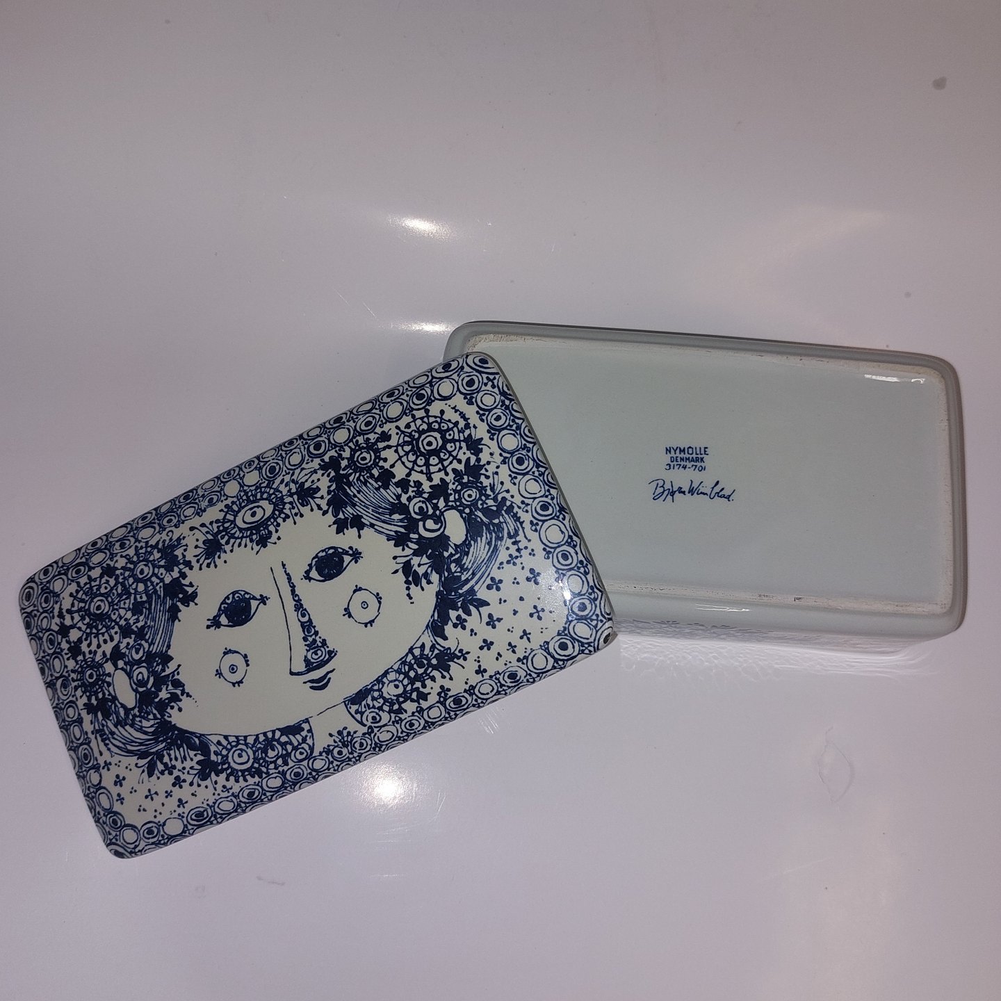 Design Bjørn Wiinblad: Lågskål I fajance med dekoration med ansigt samt blomster og bladværk I blåt. Fremstår I god stand uden skader eller reparationer. Fabriksmærket på bunden. Mål: H. 5,5 cm. Låget måler 8,5 x 15,5 cm