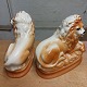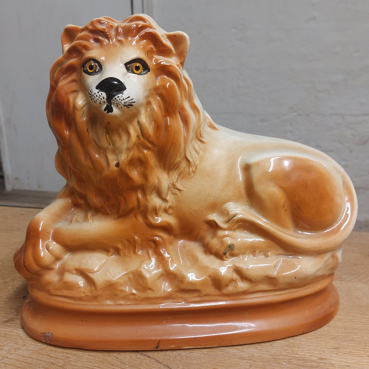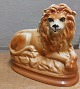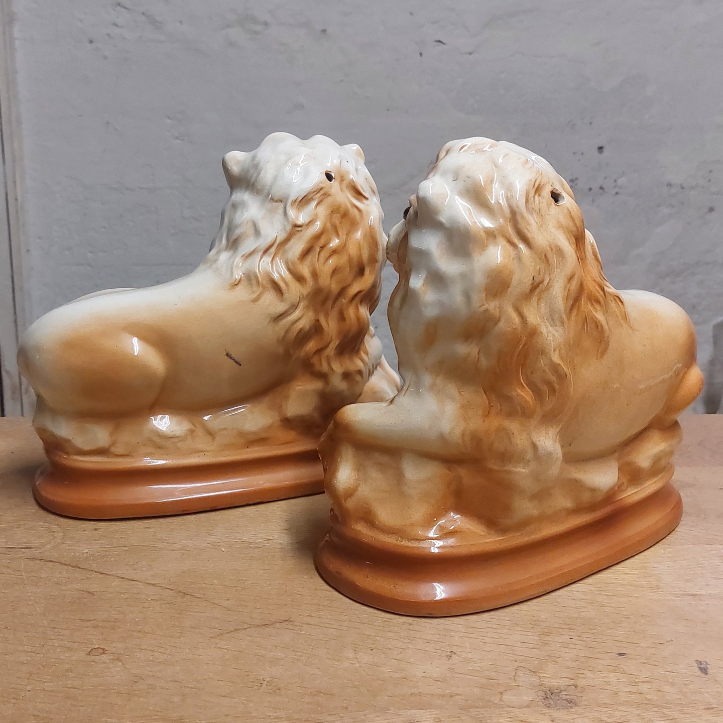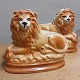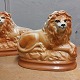 Staffordshire: Par figurer af liggende løver i fajance med glasøjne. Fremstillet omkring 1900 i England. Fremstår I god stand uden skader eller reparationer. Ganske få brugsspor. Den ene figur har et mindre skår (se foto). Mål: H. 24,5 cm.L. 28 cm .
