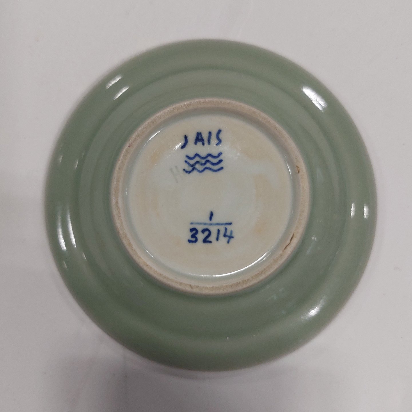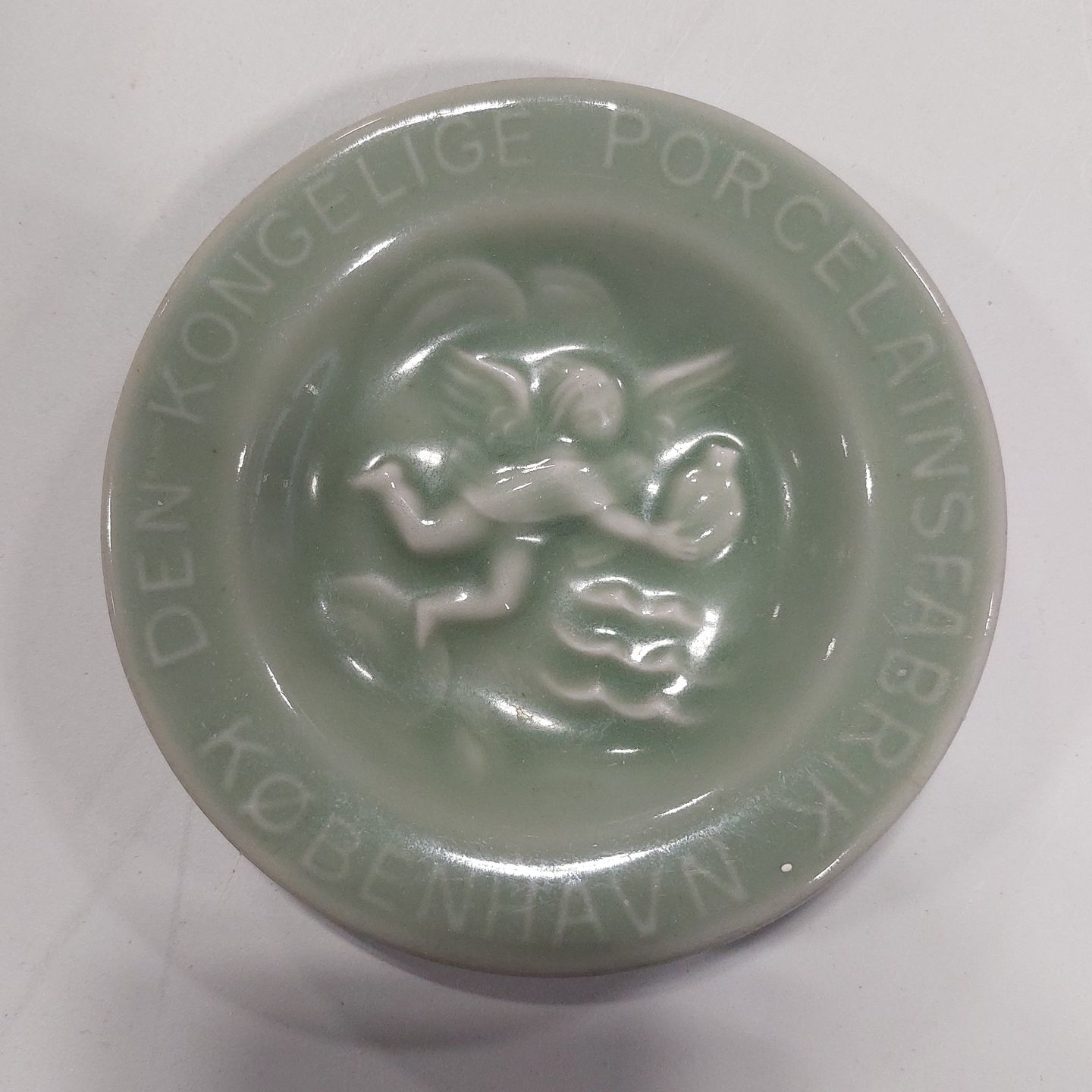 DEN KONGELIGE PORCELÆNSFABRIK KØBENHAVN: Royal Copenhagen celadon platte af Jais Nielsen med motiv af flyvende engel med krukke i hænderne. I god stand. Ø. 11 cm