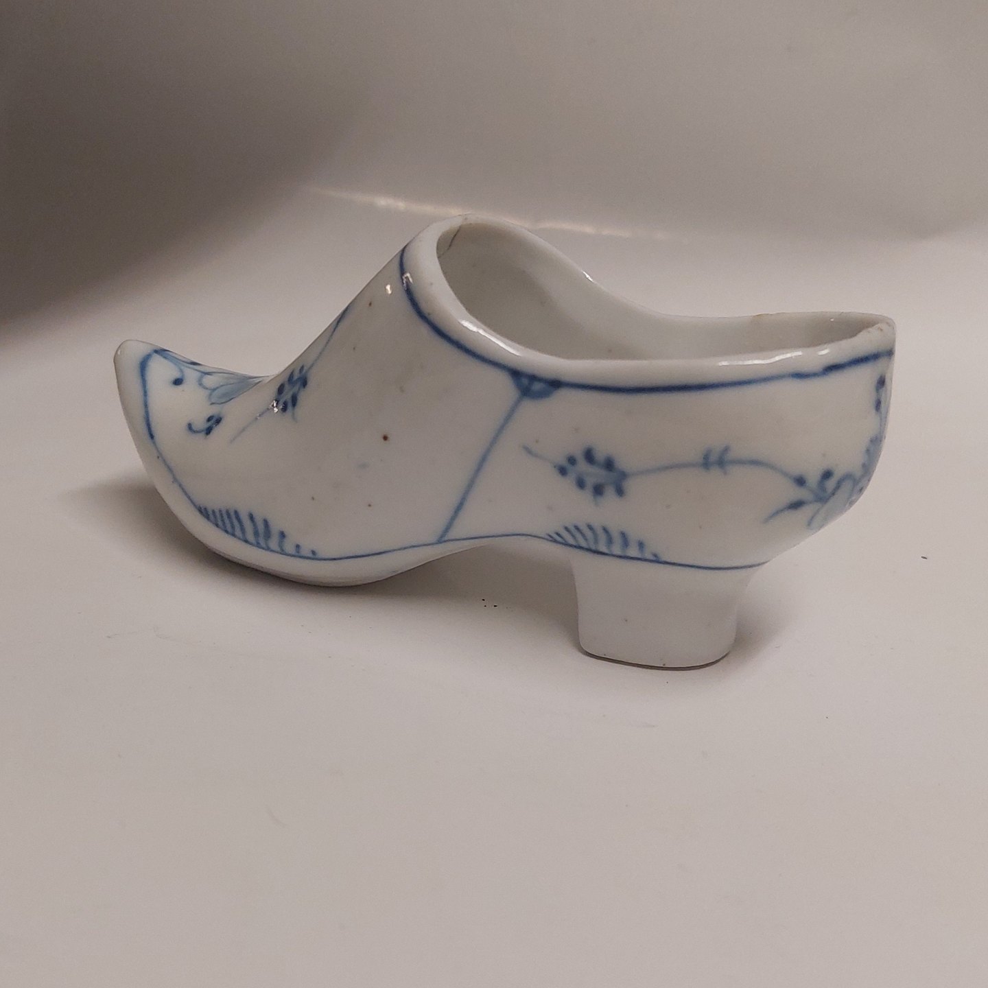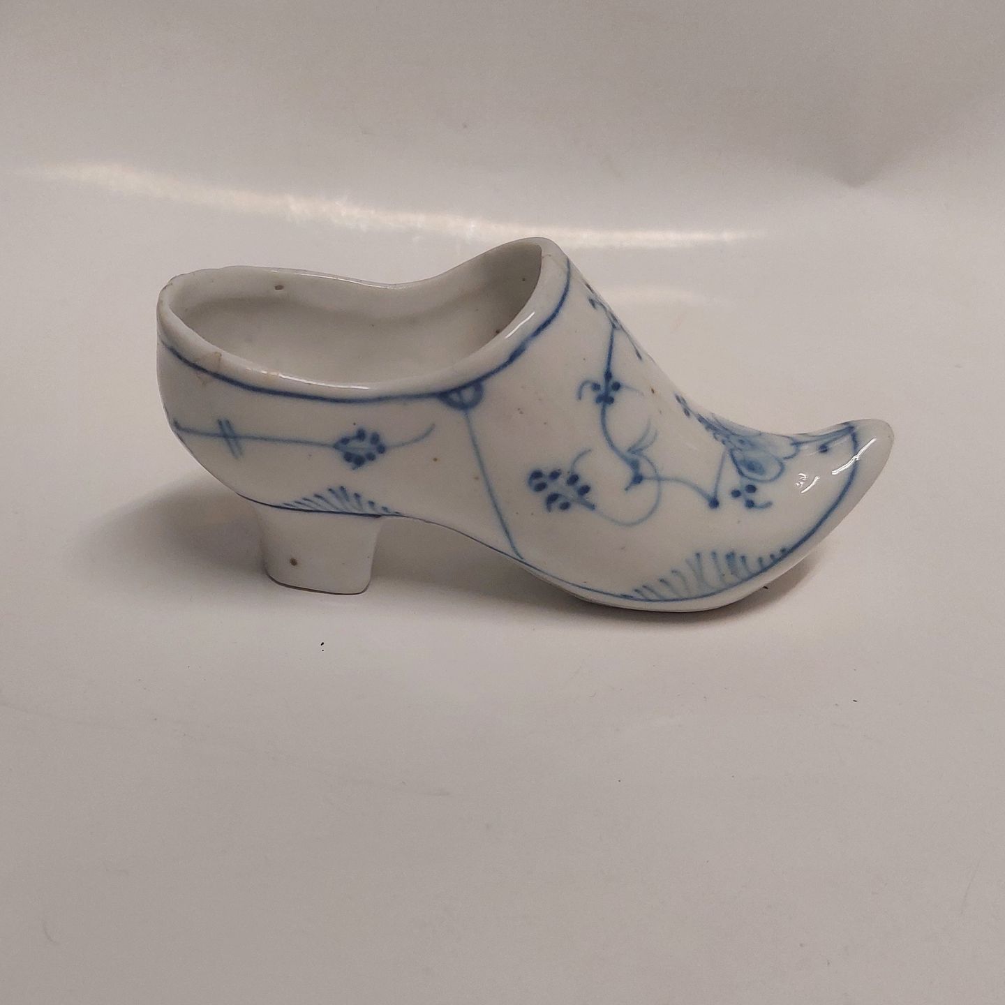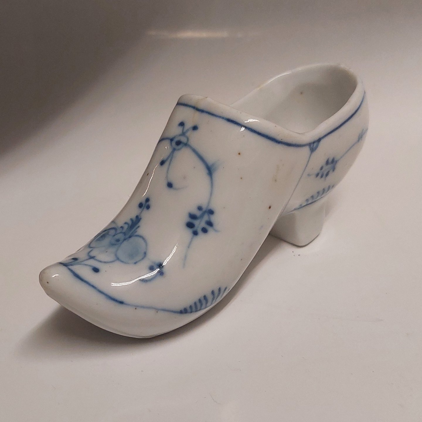 Musselmalet sko i porcelæn. Fra omkring 1920. Formodes at være fremstillet I Tyskland. I god stand. Mindre produktionsrevne (se foto) samt mindre skåt på undersiden. Mål: H. 5,5 cm L. 12,5 cm