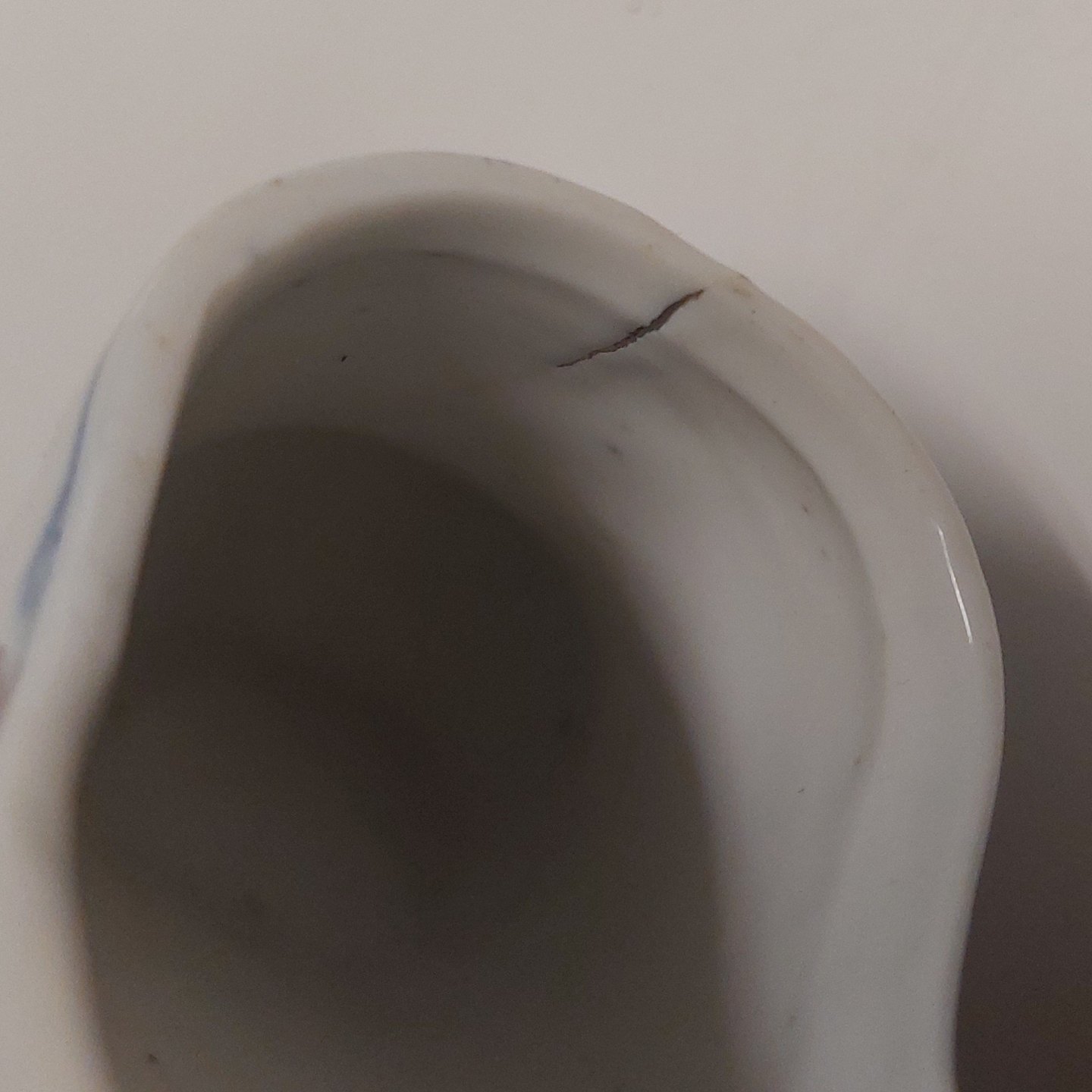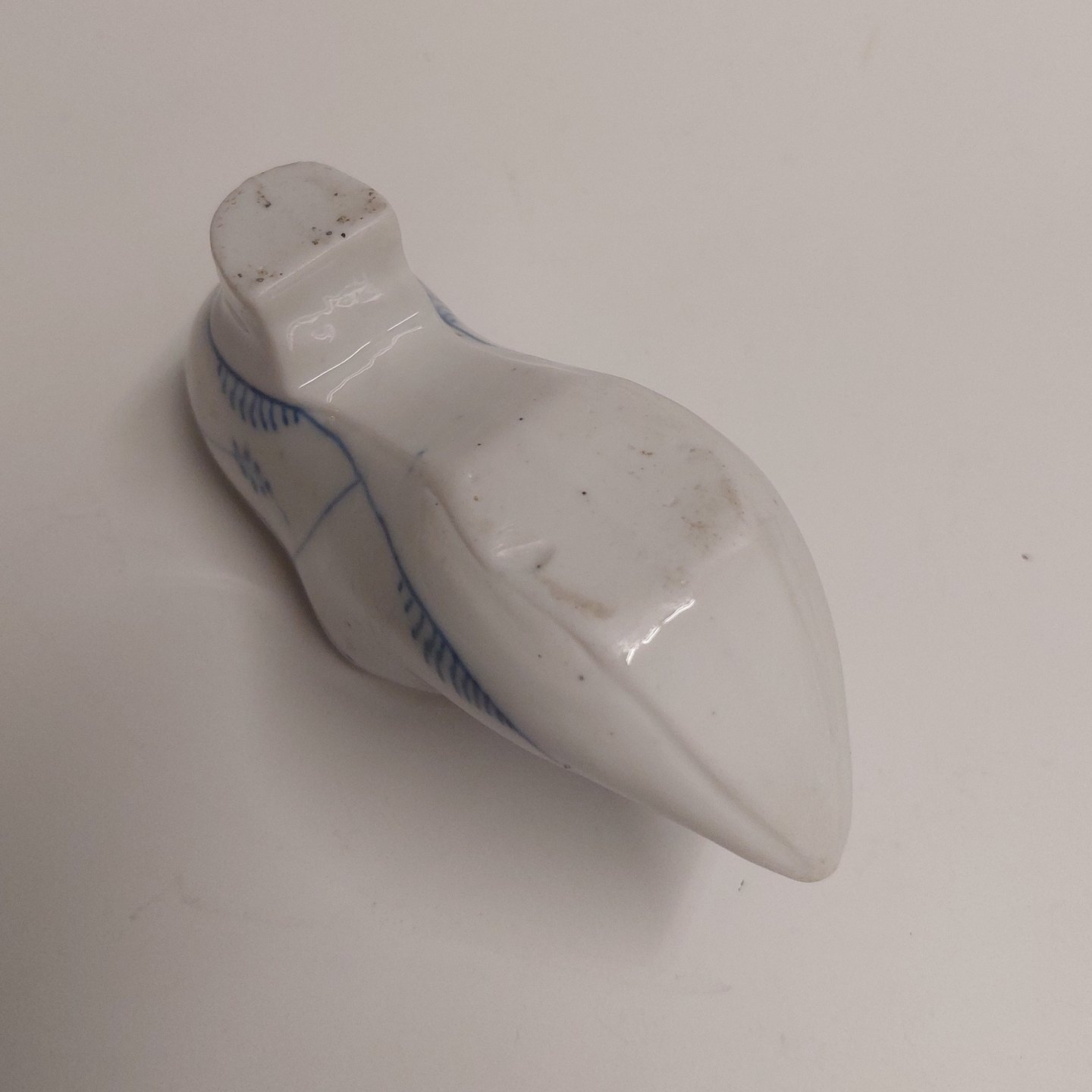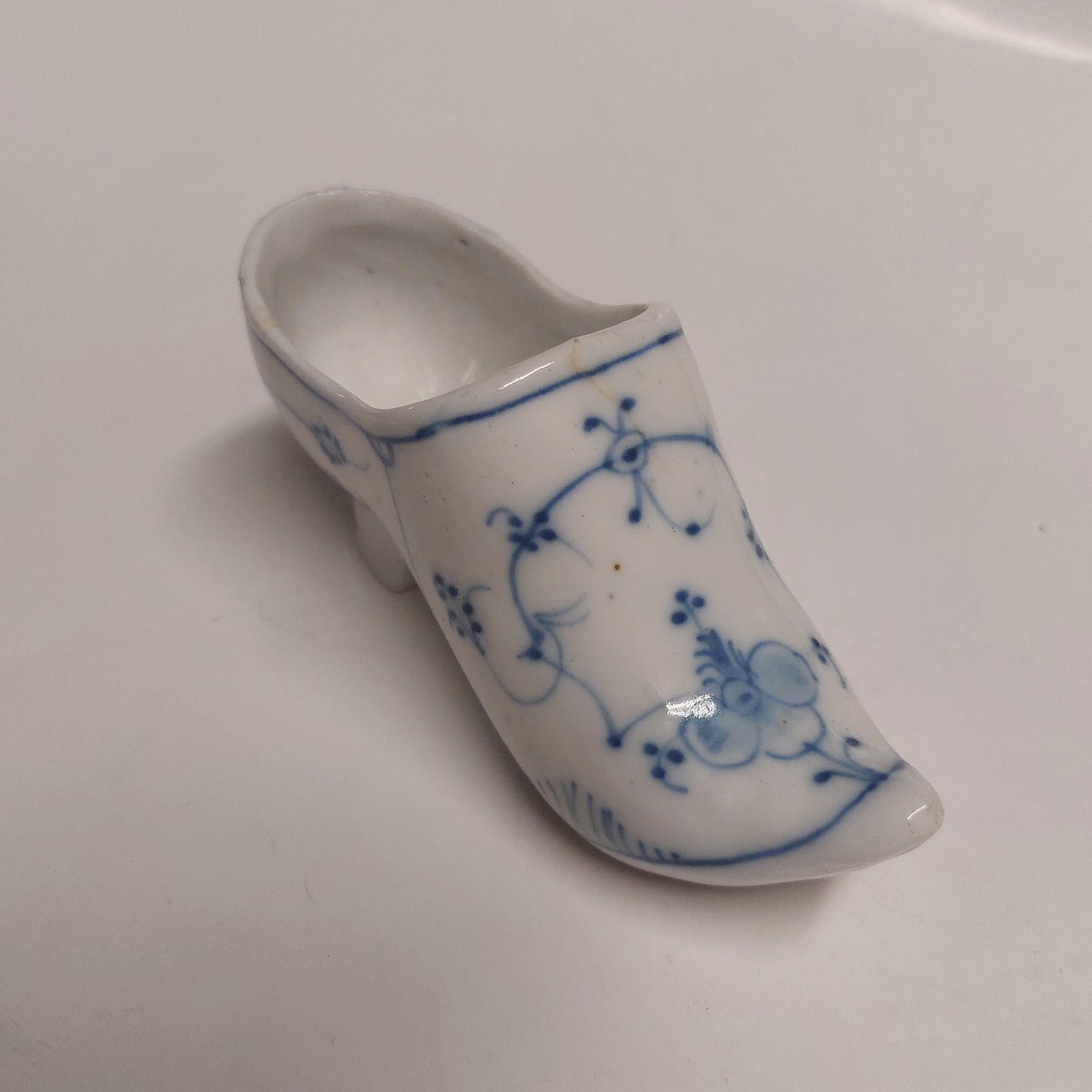 Musselmalet sko i porcelæn. Fra omkring 1920. Formodes at være fremstillet I Tyskland. I god stand. Mindre produktionsrevne (se foto) samt mindre skåt på undersiden. Mål: H. 5,5 cm L. 12,5 cm