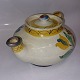 Lertøjs tepotte fra Anders Høy fremstillet I 1930'erne. Bl.a. dekoreret med blomster på begge sider. Har en reparation på tuden. Har fået en lille metaltud, så hældningen gøres mere jævn (formoder jeg). Signeret på undersiden af både potte og låg. Mål: H. 14 cm L. 26,5 cm