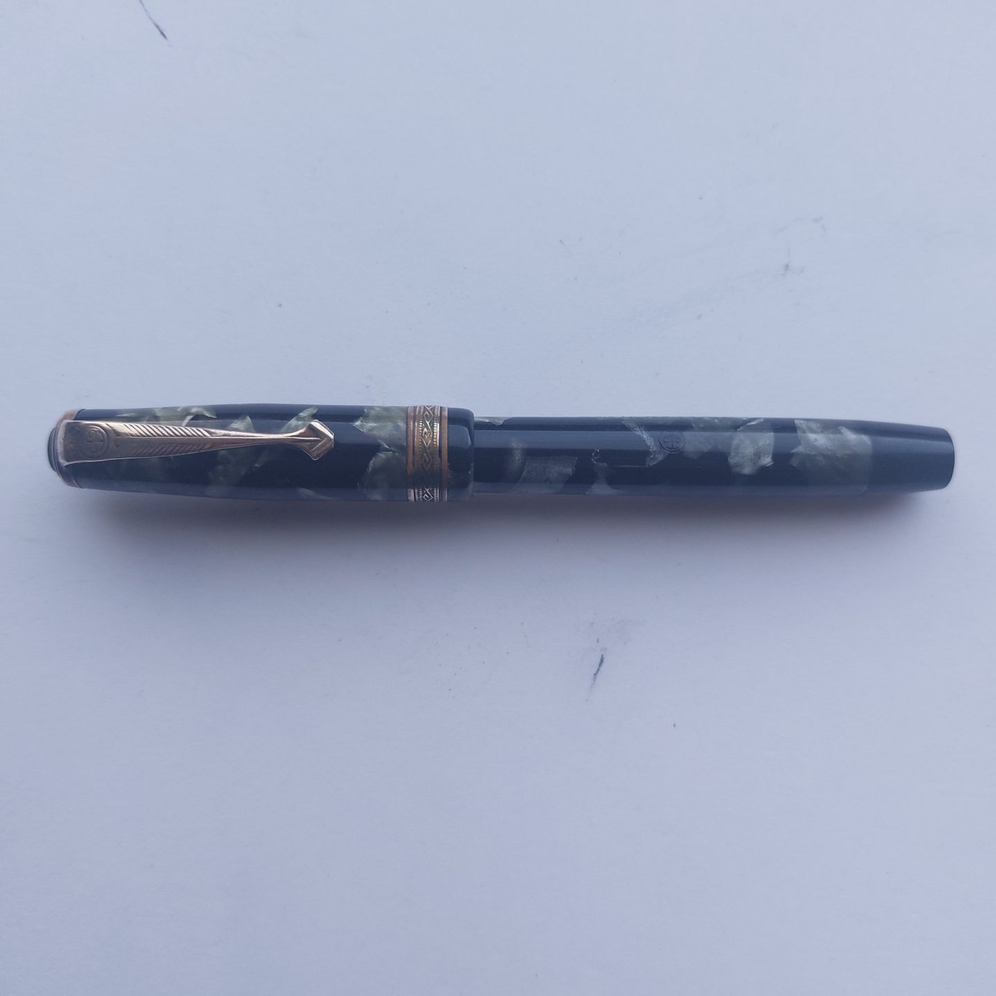 Grøn marmoreret Penol de Luxe (0) fyldepen. Push button blækpåfylder. Virker ikke. Der skal indsættes ny gummisæk før end den igen kan optage blæk og skrive igen. Alle dele originale Penol dele. Der kan indsættes ny gummisæk for kr. 250,-fyldepennen er 11,8 cm lang.