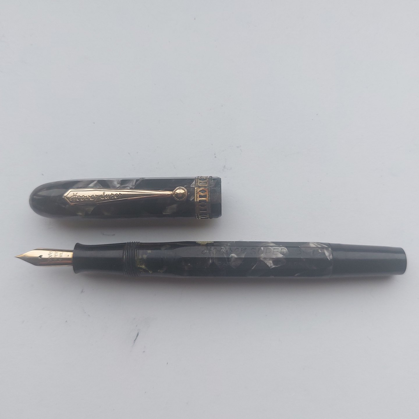 10-kantet grøn marmoreret Hoover Super 347 fyldepen. Push button blækpåfylder. Virker ikke. Der skal indsættes ny gummisæk før end den igen kan optage blæk og skrive igen. Indsættelse af ny gummisæk koster kr. 200,-.I god stand uden skader eller reparationer. Alle dele originale Hoover dele inclusive en 14 karat Hoover guldspids. L. 13 cm
