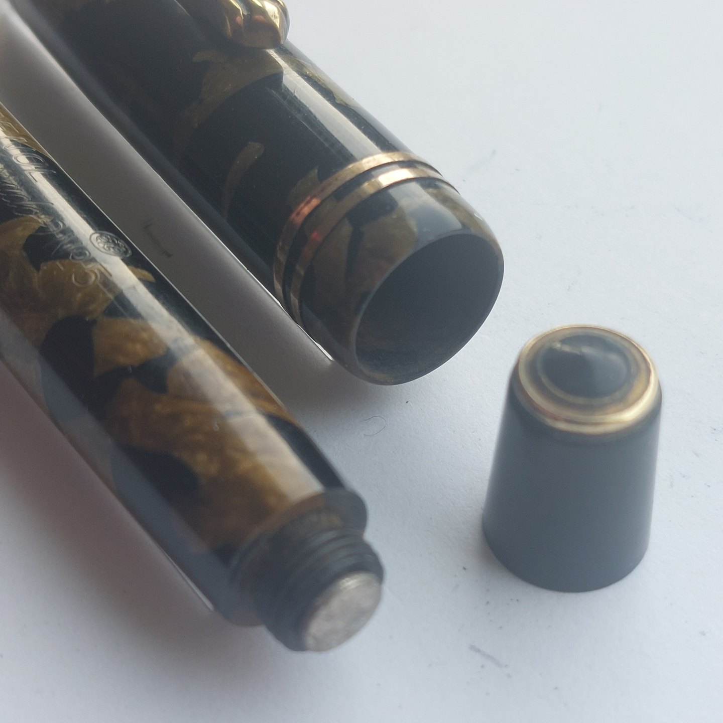 Brun og sort marmoreret Penol Ambassador fyldepen med piston blækpåfylder med push button blækpåfylder. Der skal indsættes ny gummisæk før end den igen kan optage blæk og skrive. Ellers fremstår den i god stand. Alle dele originale Penol dele inclusive en 14 karat Ambassador guldspids. L. 13,5 cm