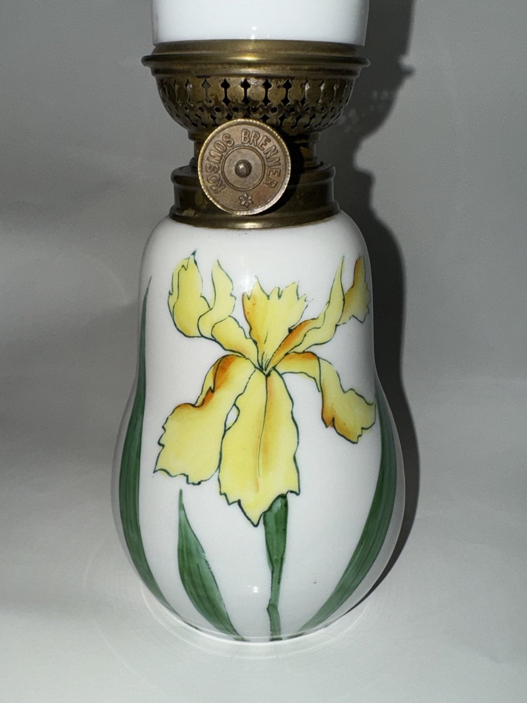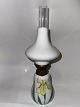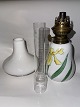 Olielampe i bemalet hvid opalglas. I god stand. Mål: Den bemalede underdel er 19 cm høj med metal-monteringen. 12 cm høj uden
