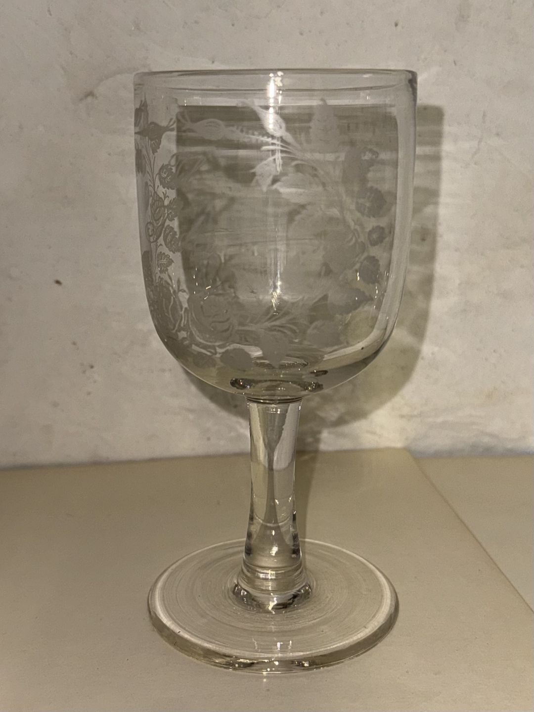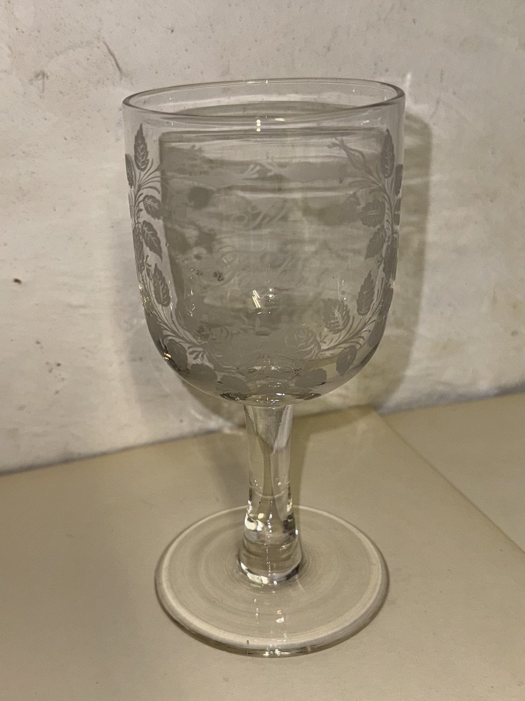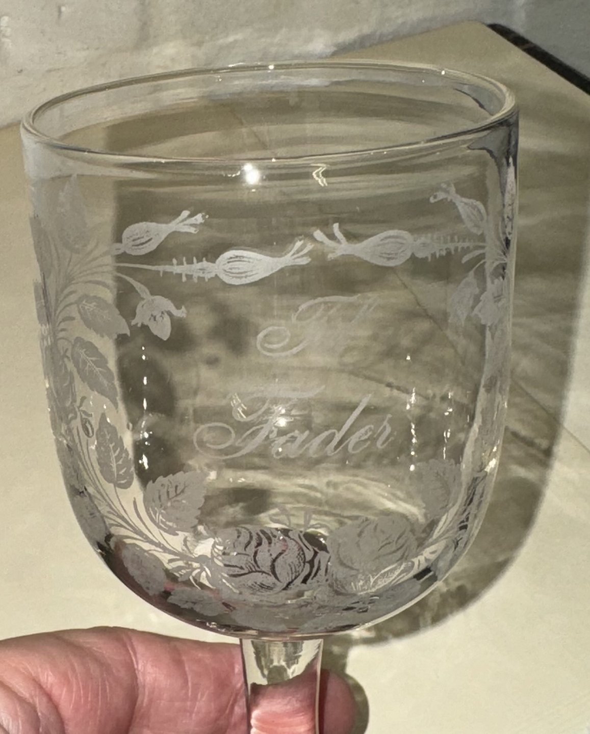 Gammelt dansk vin glas fra Kastrup Glasværk i form af erindringsglas fra ca. 1910. Fremstår i god stand uden skader eller reparationer med teksten: "Til Fader". H. 15,8 cm