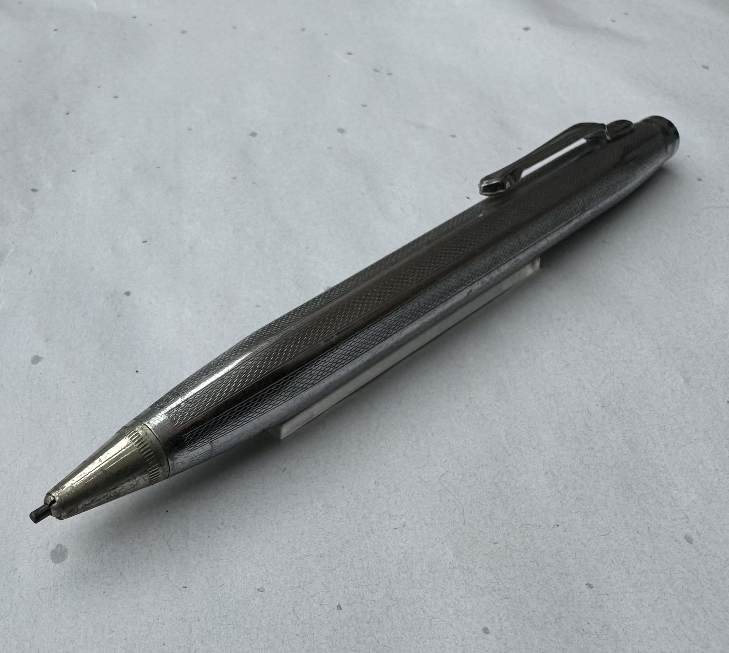 ART DECO-STIL: Otte-kantet sølvplet skrueblyant i skriveklar stand. Klar til at blive brugt. Fremstillet i 1930’erne. Ingen skader. Der ses intet fabrikationsnavn. Mål: L. 12 cm