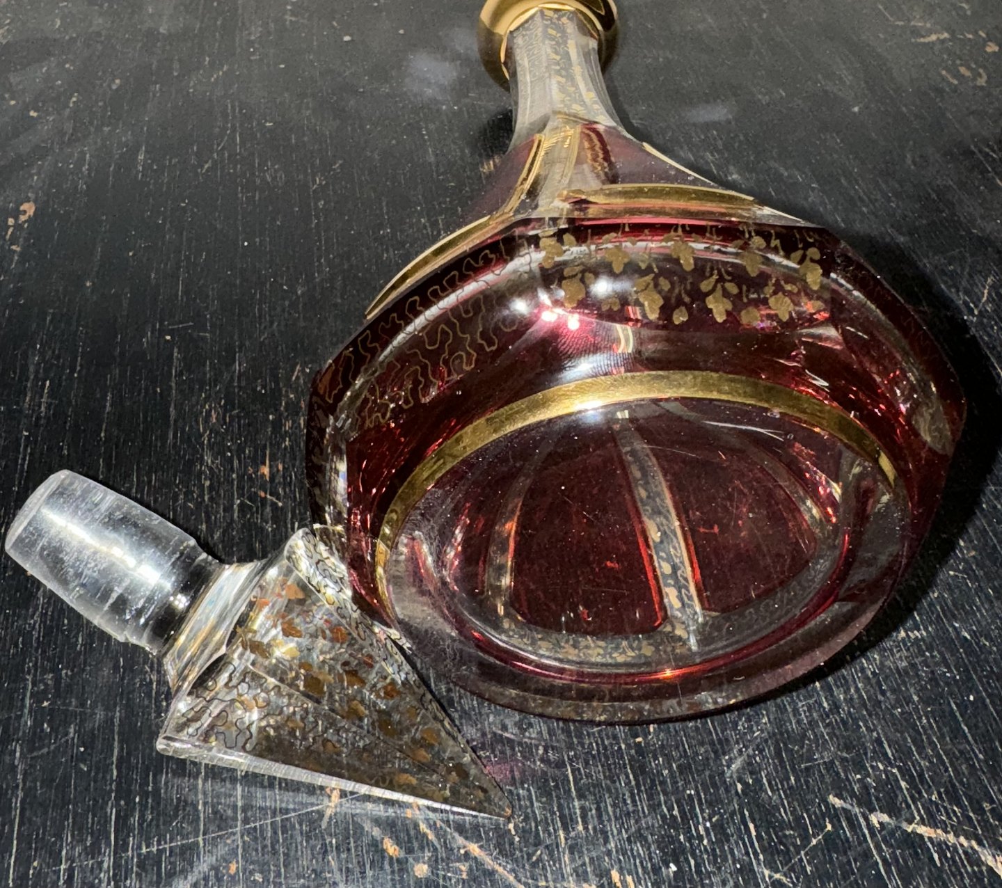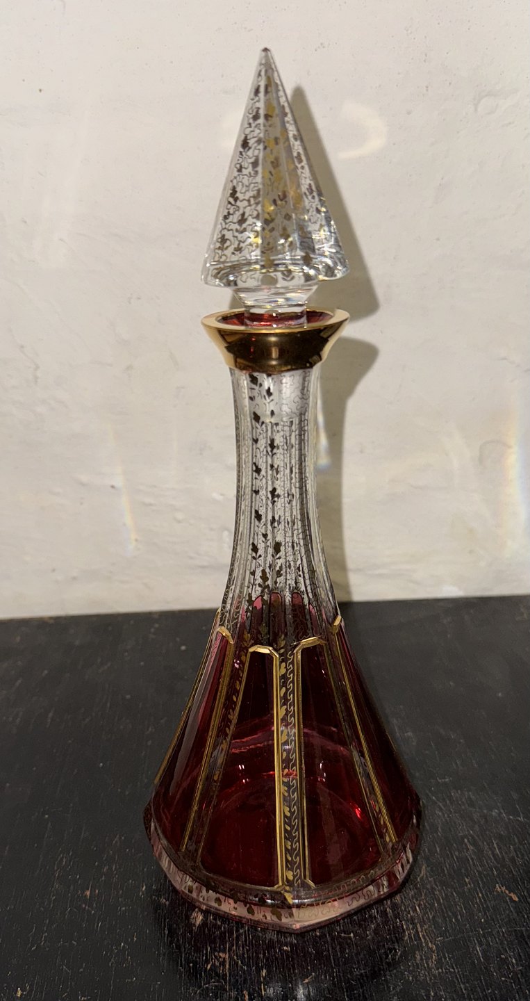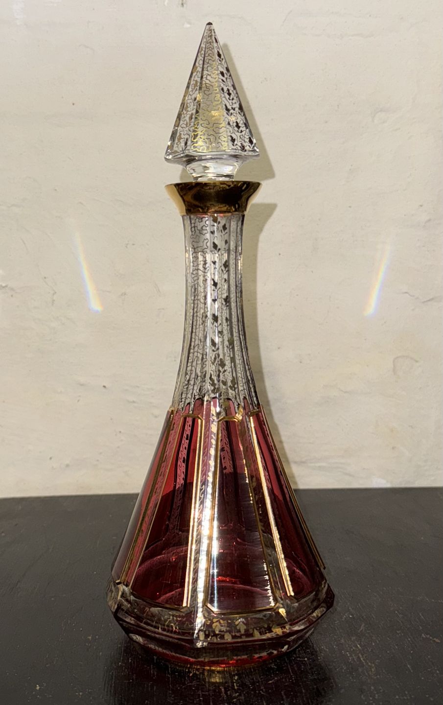Facetteret likør krystal karaffel med prop fra Art Deco perioden i 1920’erne. Fremstillet på Mosar glasværk i Tjekkiet (Bohemien). Dekoreret på ydersiden med slyngende grene og bladværk. Endvidere dekoreret med røde felter hele vejen rundt samt guld-stafferinger. Meget lille skår på proppens underside. Følg den grå pil. Formodes fremstillet på øst-europæisk glasværk. Et glasværk arbejde af meget høj kvalitet. H. 29,5 cm