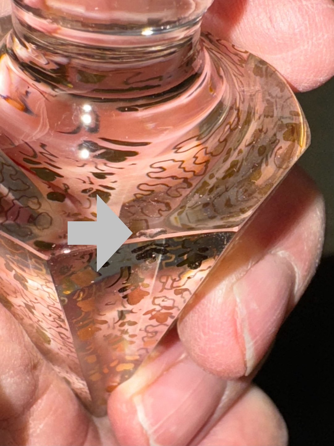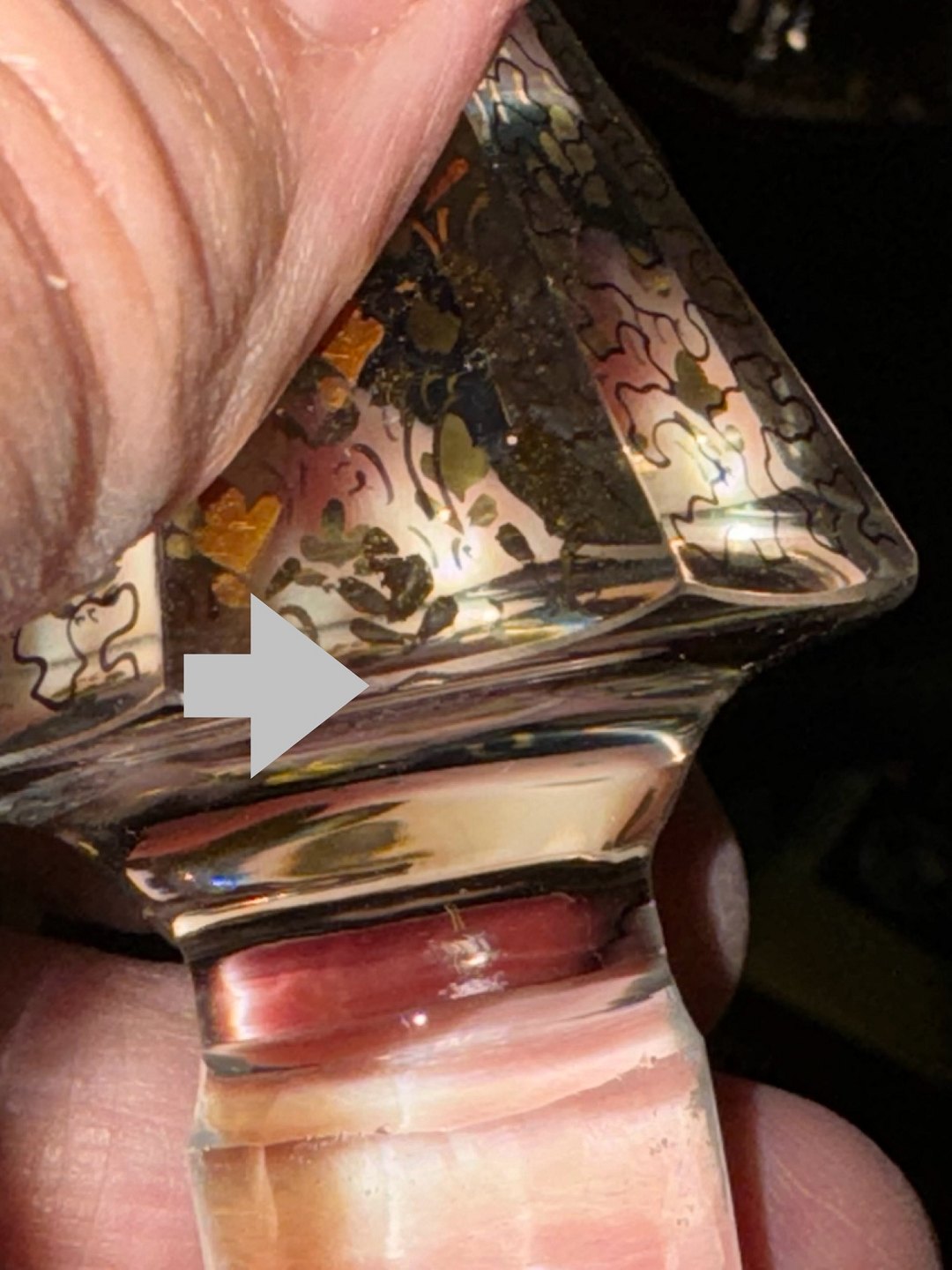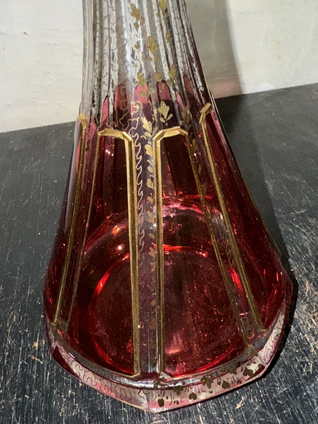 Facetteret likør krystal karaffel med prop fra Art Deco perioden i 1920’erne. Fremstillet på Mosar glasværk i Tjekkiet (Bohemien). Dekoreret på ydersiden med slyngende grene og bladværk. Endvidere dekoreret med røde felter hele vejen rundt samt guld-stafferinger. Meget lille skår på proppens underside. Følg den grå pil. Formodes fremstillet på øst-europæisk glasværk. Et glasværk arbejde af meget høj kvalitet. H. 29,5 cm