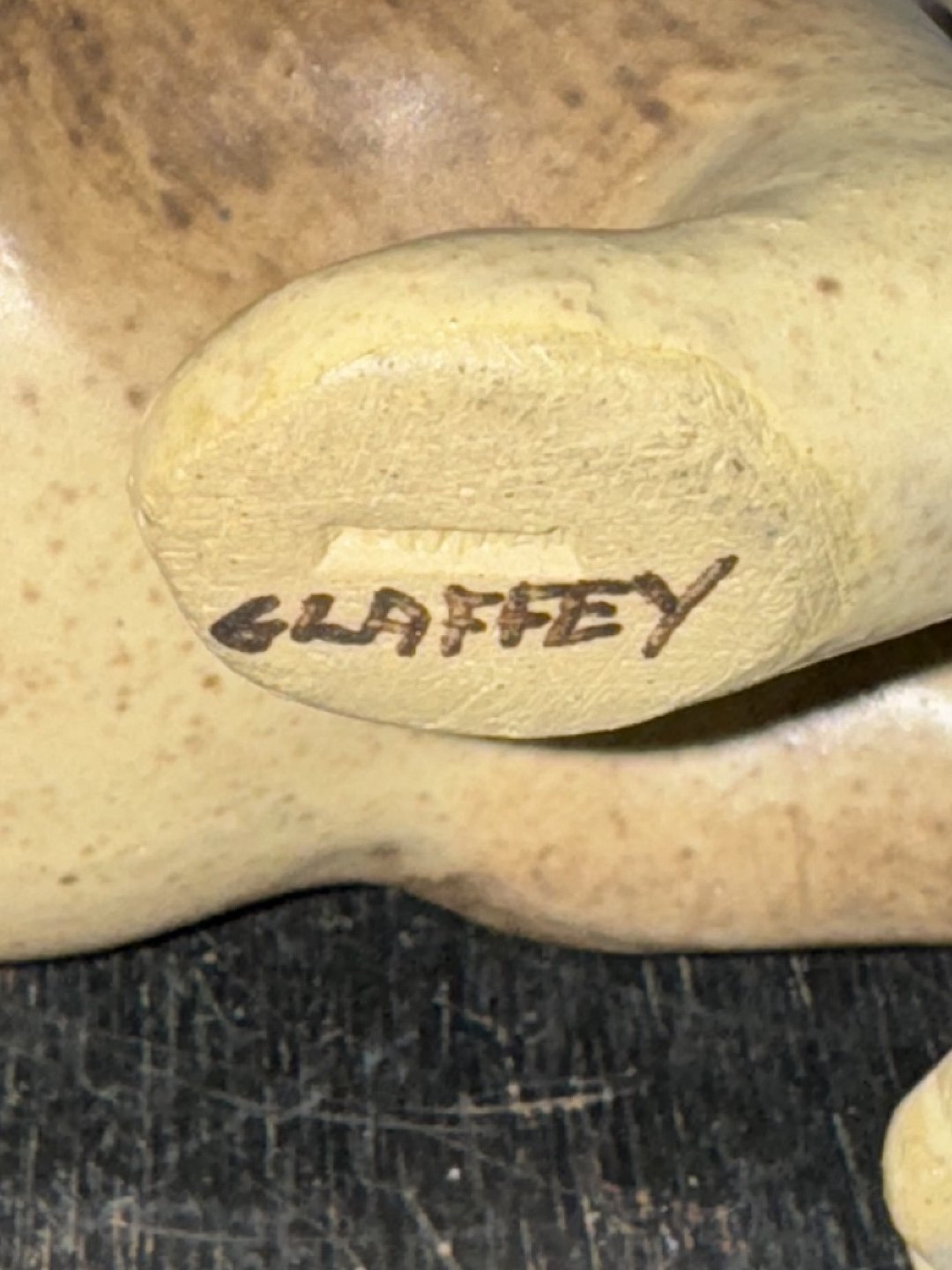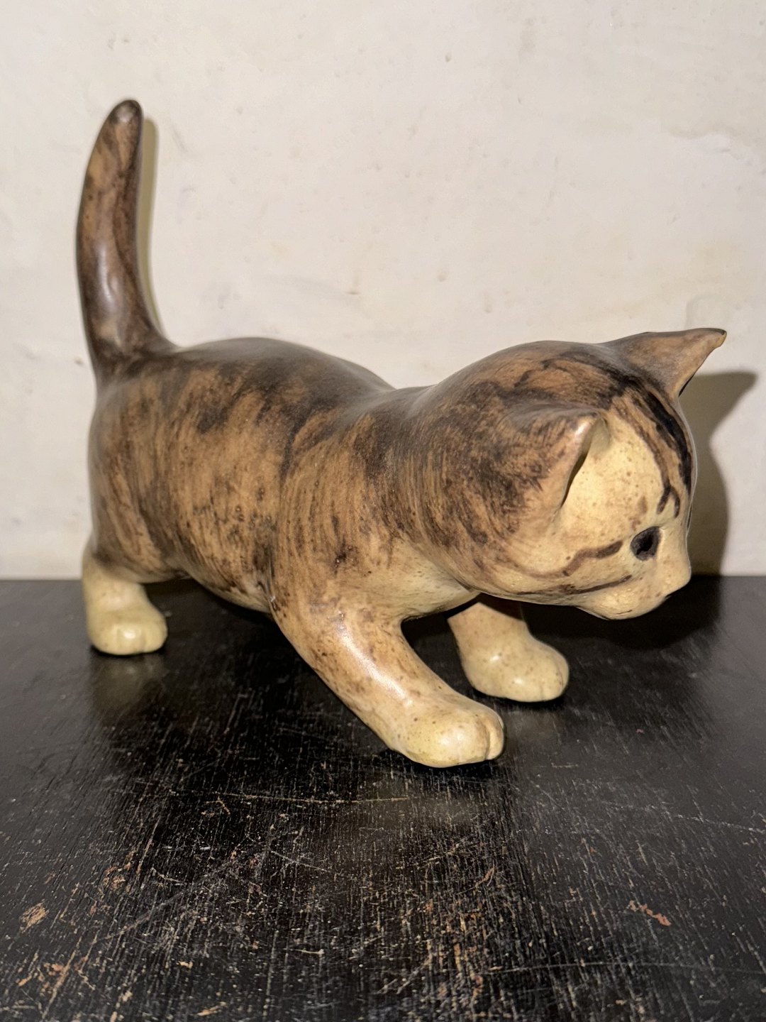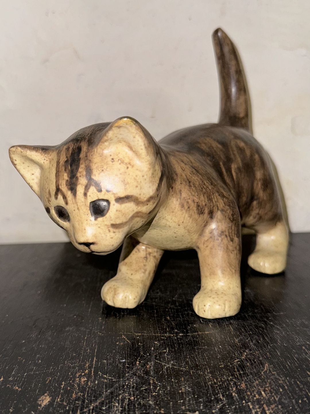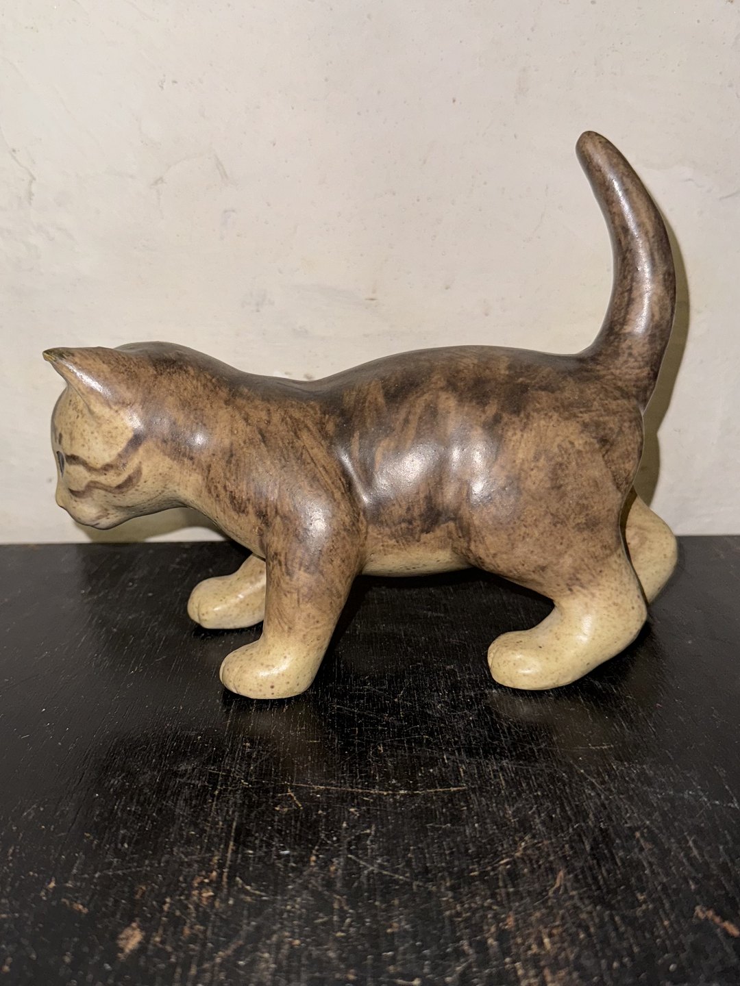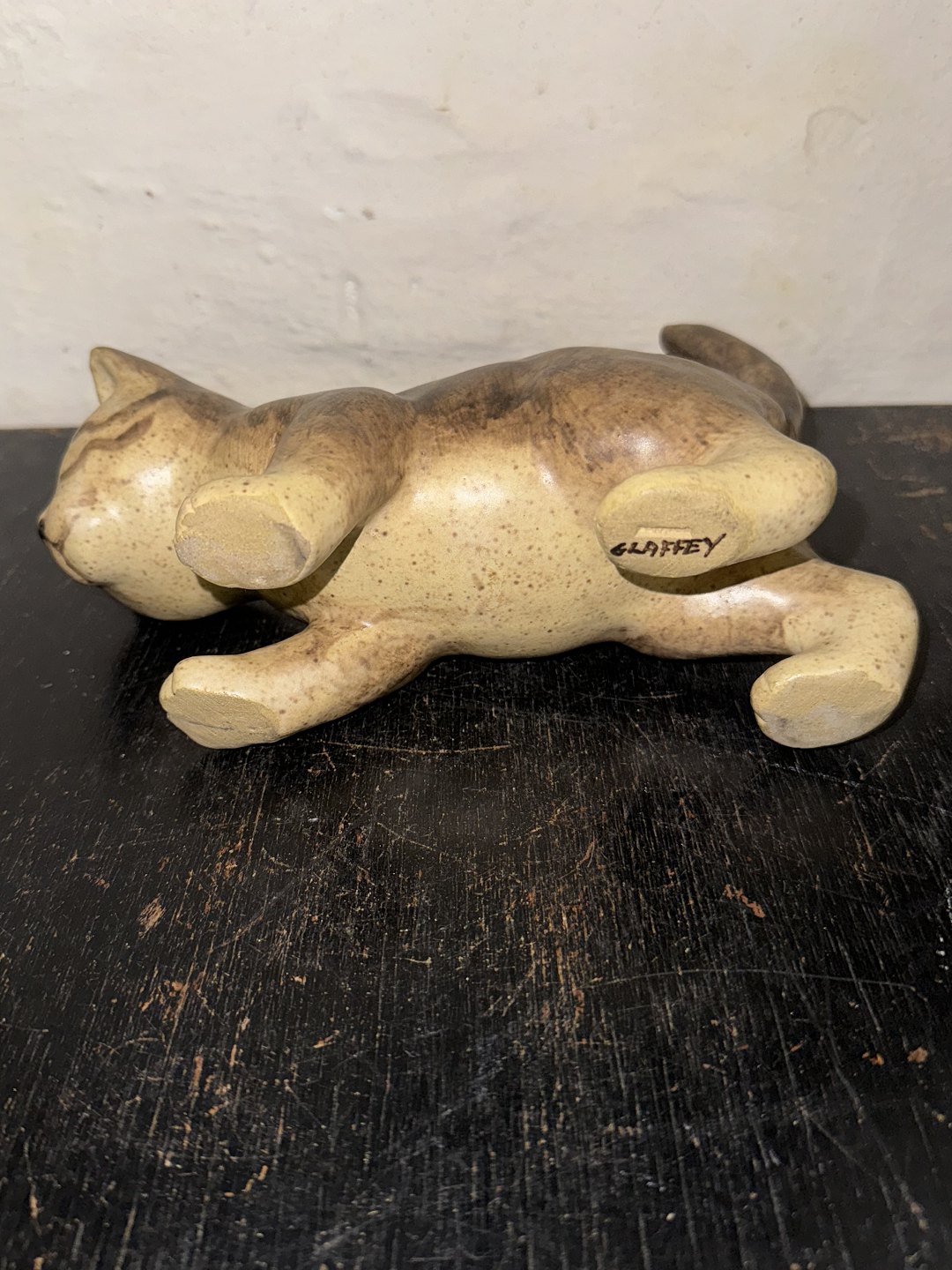 Elisa Glaffy, Danmark: Stående kat i keramik. Dækket af brunlig glasur. Signeret af kunstneren på undersiden af den ene pote. Mål: H. 16,5 cm L. 21 cm